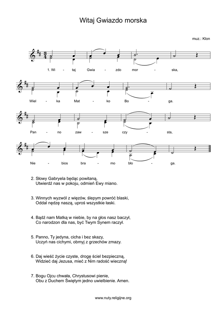 Witaj Gwiazdo morska muz.: Klon # & # 43 ˙˙ 1. Wi & ## ˙˙ Wiel & ## - ˙˙ Pan # & # œ˙ Nie - - œ œ œ œ˙ taj Gwia œ œ œ˙ ka Mat œœ ˙ ˙ no zaw - œœ ˙œ - bios bra ˙. ˙ zdo mor œ œ œ ˙˙ . - ko Bo - œ œœ œœ ˙˙ sze czy - œ - mo bło 2. Słowy Gabryela będąc powitaną, Utwierdź nas w pokoju, odmień Ewy miano. 3. Winnych wyzwól z więzów, ślepym powróć blaski, Oddal nędzę naszą, uproś wszystkie łaski. 4. Bądź nam Matką w niebie, by na głos nasz baczył, Co narodzon dla nas, być Twym Synem raczył. 5. Panno, Ty jedyna, cicha i bez skazy, Uczyń nas cichymi, obmyj z grzechów zmazy. 6. Daj wieść życie czyste, drogę ściel bezpieczną, Widzieć daj Jezusa, mieć z Nim radość wieczną! 7. Bogu Ojcu chwała, Chrystusowi pienie, Obu z Duchem Świętym jedno uwielbienie. Amen. www.nuty.religijne.org Œ ˙ - ˙ ˙ Œ ga. œ œ œœ Œ ska, ˙ - œ ˙ œ sta, œœ - ˙ ga. Œ
