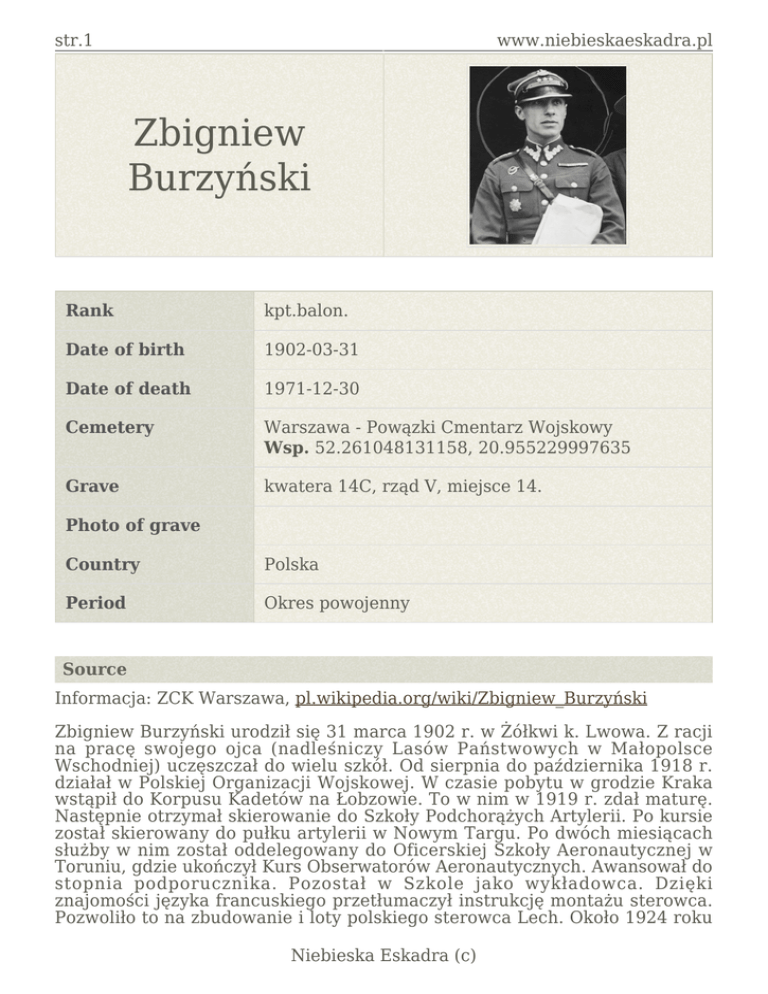 str.1 www.niebieskaeskadra.pl Zbigniew Burzyński Rank kpt.balon. Date of birth 1902-03-31 Date of death 1971-12-30 Cemetery Warszawa - Powązki Cmentarz Wojskowy Wsp. 52.261048131158, 20.955229997635 Grave kwatera 14C, rząd V, miejsce 14. Photo of grave Country Polska Period Okres powojenny Source Informacja: ZCK Warszawa, pl.wikipedia.org/wiki/Zbigniew_Burzyński Zbigniew Burzyński urodził się 31 marca 1902 r. w Żółkwi k. Lwowa. Z racji na pracę swojego ojca (nadleśniczy Lasów Państwowych w Małopolsce Wschodniej) uczęszczał do wielu szkół. Od sierpnia do października 1918 r. działał w Polskiej Organizacji Wojskowej. W czasie pobytu w grodzie Kraka wstąpił do Korpusu Kadetów na Łobzowie. To w nim w 1919 r. zdał maturę. Następnie otrzymał skierowanie do Szkoły Podchorążych Artylerii. Po kursie został skierowany do pułku artylerii w Nowym Targu. Po dwóch miesiącach służby w nim został oddelegowany do Oficerskiej Szkoły Aeronautycznej w Toruniu, gdzie ukończył Kurs Obserwatorów Aeronautycznych. Awansował do stopnia podporucznika. Pozostał w Szkole jako wykładowca. Dzięki znajomości języka francuskiego przetłumaczył instrukcję montażu sterowca. Pozwoliło to na zbudowanie i loty polskiego sterowca Lech. Około 1924 roku Niebieska Eskadra (c) str.2 www.niebieskaeskadra.pl został odkomenderowany do Francji, gdzie odbyył staż w wojskowych zakładach balonowych. Po powrocie do Polski został przeniesiony do Legionowa pod Warszawą. Pod jego okiem został zbudowany nasz pierwszy w balon na uwięzi typu Caquot R i wolny typu E 2. Legionowo opuścił w marcu 1937 r. Jednocześnie był dowódcą kompanii balonów obserwacyjnych w 2 batalionie balonowym. Od 1928 do 1938 roku prowadził czynną działalność zawodniczą w sporcie balonowym. We wrześniu 1928 r. wziął udział w Krajowych Zawodach Balonów Wolnych. Startował z Warszawy z F.Hynkiem na balonie Lwów. Wylatał w nich l miejsce. W sierpniu 1929 r. wziął udział pierwszy raz w zawodach międzynarodowych. Te odbyły się w Poznaniu jako impreza towarzysząca Powszechnej Wystawie Krajowej. W październiku 1930 r. startował ponownie w zawodach krajowych na balonie o pojemności 750 m3. Po lądowaniu poza granicami Polski w ZSRR został zdyskwalifikowany. Od 1932 r. brał udział w Międzynarodowych Zawodach Balonowych o nagrodę im. Gordon-Bennetta. Razem z F. Hynkiem wystartował w Bazylei na balonie Gdynia zajmując 6 miejsce. Odległość z Bazylei do Warszawy (1075 km) pokonali w 17 h. Nasi baloniarze otrzymali nagrodę za najlepszą prędkość, 63 km/h. Na początku 1933 r. odbył z Hynkiem pierwszy w Polsce lot balonem na wysokość. Wystartowali do niego 28 lutego na balonie Toruń. Wznieśli się na wysokość 9762 m. Ten sukces spowodował, że zostali wyznaczeni w 1933 r. do uczestnictwa w zawodach Gordon?Bennetta. W Chicago lecąc balonem Kościuszko odnieśli pierwsze w tych zawodach zwycięstwo dla Polski. Polska załoga wylądowała w Kanadzie mając za sobą 1361 km pokonanych w czasie 39 h 39 min. 28.03.1935 r. Zbigniew Burzyński z Wysockim ustanowił światowy rekord wysokości lotu balonem (9437 m). W lipcu tego samego roku obaj osiągnęli na balonie Toruń wysokość 10 002 m. W następnych zawodach Gordon-Bennetta rozegranych w 1934 r. w Warszawie, Zbigniew Burzyński na balonie Warszawa II, zajął drugie miejsce. Polska załoga lądowała pod Riazaniem w ZSRR. Miała za sobą pokonane 1301 km w czasie 36 h 42 min. Jeszcze w czasie tych samych zawodów we wrześniu 1935 r. w czasie lotu z Wysockim na balonie Polonia II startując ze stolicy Polski nasi śmiałkowie pokonali 1650 km w czasie 57 h 54 min lądując w okolicach Stalingradu. To dzięki zwycięstwom, które odnosił Burzyński trafił do Polski na własność puchar Gordon?Bennetta. 29 marca 1936 r. Burzyński wraz z doktorem Jodko-Narkiewiczem ustanowił na balonie Warszawa II nowy rekord świata wysokości wzbijając się na 10 835 m (klasa A-9 balonów o pojemności od 3001 do 4000 m3). Rekord nie był pobity blisko 26 lat. Zbigniew Burzyński miał za sobą jeszcze dwa inne rekordy świata: odległości przelotu balonem na dystansie 1650 474 km (15-18.09.1935 r.) i długotrwałości lotu 57 h 54 min(w kategorii balonów o pojemności od 1601 do 4000 m3). Burzyński startował w zawodach Gordon-Bennetta dwukrotnie: w Warszawie w 1936 r. i w Brukseli w 1937 r. W 1923 r. awansował do stopnia porucznika, a w styczniu 1934 r. do stopnia kapitana. Nieustannie podnosił swoją wiedzę. Był słuchaczem Szkoły Oficerów Technicznych Lotnictwa w Warszawie. Ukończył kurs oficerów technicznych lotnictwa. Według jego projektu został wykonany prototyp balonu zaporowego ZB-3. Mało kto wie, że stateczniki tego balonu produkowane były seryjnie i stosowane w czasie ostatniej wojny w Wielkiej Brytanii w polskich balonach. Po kursie, we wrześniu 1938 r. został komendantem parku w 2 batalionie balonowym. Pełnił tę funkcję do kwietnia 1939 r. Następnie został przeniesiony do Dowództwa Obrony Przeciwlotniczej Niebieska Eskadra (c) str.3 www.niebieskaeskadra.pl MSW na stanowisko referenta zapór balonowych. Pozostawał na nim do końca sierpnia.1939 r. Z tego odwołany, został mianowany dowódcą 6 kompanii balonów obserwacyjnych. Razem z nią wyruszył na wojnę w 1939 r. Po rozformowaniu dowodzonej kompanii znalazł się w Warszawie, gdzie rozpoczął pracę w delegaturze PCK. W listopadzie 1939 r. został aresztowany przez żandarmerię niemiecką. Trafił do obozów jenieckich. Przebywał w nich kwietnia 1945 r. W okresie od maja do listopada 1945 r. był oficerem łącznikowym 4 Commando Brigade w okupowanych Niemczech. Po powrocie do Polski podjął się studiowania na Politechnice Warszawskiej. W 1955 r. uzyskał dyplom inżyniera mechanika specjalności balonowe. W powojennej Polsce był propagatorem sportu balonowego, współinicjatorem jego reaktywowania. W 1956 r. stanął na jej czele 