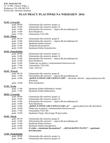 D.K. Orion B.S.M. Ul. 16 Płk. Ułanów Wlkp. 1 Bydgoszcz Tel. 696 002 923 Kierownik: Nikoletta Stachura PLAN PRACY PLACÓWKI NA WRZESIEŃ 2016 01.09. Czwartek godz. 09:00 godz. 10:00 godz. 14:00 godz. 14:00 godz. 17:00 02.09. Piątek godz. 08:30 godz. 14:00 godz. 15:00 godz. 15:00 godz. 16:00 05.09. Poniedziałek godz. 09:00 godz. 10:00 godz. 14:00 godz. 14:00 godz. 16:00 godz. 17:00 godz. 17:00 06.09. Wtorek godz. 08:30 godz. 14:00 godz. 14:00 godz. 16:00 Gimnastyka dla seniorów grupa I a. Gimnastyka dla seniorów grupa I b. Informatyka dla seniorów – zajęcia dla początkujących. Koło Brydżowe. Gimnastyka TAI-CHI. Gimnastyka dla seniorów grupa II Informatyka dla seniorów – zajęcia dla początkujących. Spotkanie Klubu Seniora. Akademia Rozmaitości. Spotkanie Klubu Szaradzistów. Gimnastyka dla seniorów grupa I a. Gimnastyka dla seniorów grupa I b. Informatyka dla seniorów – zajęcia dla początkujących. Koło Brydżowe. Nauka gry na gitarze i instrumentach klawiszowych. Gimnastyka TAI-CHI. Chór „Dzwon”. Gimnastyka dla seniorów grupa II. Informatyka dla seniorów – zajęcia dla początkujących. „KOSZ Z OWOCAMI I KWIATAMI” – akwarela, ołówek - zajęcia plastyczne dla dorosłych. Koło Szachistów. 07.09. Środa godz. 17:00 godz. 17:00 Spotkanie Klubu Miłośników Sztuki. Spotkanie Klubu Radiestetów. 08.09. Czwartek godz. 09:00 godz. 10:00 godz. 14:00 godz. 14:00 godz. 14:00 godz. 16:00 godz. 17:00 godz. 18:00 Gimnastyka dla seniorów grupa I a. Gimnastyka dla seniorów grupa I b. Informatyka dla seniorów – zajęcia dla początkujących. Koło Brydżowe. „KOSZ Z OWOCAMI I KWIATAMI c.d.” – zajęcia plastyczne dla dorosłych. Nauka gry na gitarze i instrumentach klawiszowych. Gimnastyka TAI-CHI. Spotkanie Grupy Aktywnego Wypoczynku. 09.09. Piątek godz. 08:30 godz. 14:00 godz. 15:00 godz. 16:00 godz. 16:00 12.09. Poniedziałek godz. 09:00 godz. 10:00 Gimnastyka dla seniorów grupa II Informatyka dla seniorów – zajęcia dla początkujących. Spotkanie Klubu Seniora. Spotkanie Klubu Szaradzistów. Z cyklu: „Akademia Rozmaitości” – „DZIAŁKOWE PLONY” – spotkanie powakacyjne. Gimnastyka dla seniorów grupa I a. Gimnastyka dla seniorów grupa I b. godz. 14:00 godz. 14:00 godz. 15:30 godz. 16:00 godz. 16:30 godz. 17:00 godz. 17:00 Informatyka dla seniorów – zajęcia dla początkujących. Koło Brydżowe. „LEKCJA WSTĘPNA” – zapoznanie dzieci i rodziców z programem zajęć, dowolna praca plastyczna - zajęcia plastyczne dla dzieci. Nauka gry na gitarze i instrumentach klawiszowych. Spotkanie Klubu Miłośników Zdrowego Stylu Życia. Gimnastyka TAI-CHI. Chór „Dzwon”. 13.09. Wtorek godz. 08:30 godz. 14:00 godz. 14:00 godz. 16:00 godz. 16:00 Gimnastyka dla seniorów grupa II. Informatyka dla seniorów – zajęcia dla początkujących. „KOSZ Z OWOCAMI I KWIATAMI c.d.” – zajęcia plastyczne dla dorosłych. Sybiracy. Koło Szachistów. 14.09. Środa godz. 17:00 godz. 17:00 „WAKACYJNE WSPOMNIENIA” cz. I - spotkanie Klubu Miłośników Sztuki. Spotkanie Klubu Radiestetów. 15.09. Czwartek godz. 09:00 godz. 10:00 godz. 14:00 godz. 14:00 godz. 14:00 godz. 17:00 godz. 17:00 godz. 18:00 16.09. Piątek godz. 08:30 godz. 14:00 godz. 15:00 godz. 15:00 godz. 15:30 godz. 16:00 19.09. Poniedziałek godz. 09:00 godz. 10:00 godz. 14:00 godz. 14:00 godz. 15:30 godz. 17:00 godz. 17:00 20.09. Wtorek godz. 08:30 godz. 14:00 godz. 14:00 Gimnastyka dla seniorów grupa I a. Gimnastyka dla seniorów grupa I b. Informatyka dla seniorów – zajęcia dla początkujących. Koło Brydżowe. „KOSZ Z OWOCAMI I KWIATAMI c.d.” – zajęcia plastyczne dla dorosłych. „SALON LITERACKI ORIONA” - spotkanie literackie pt.: „ZŁOTA ŹRENICA” – wiersze belgijskie. Prowadzenie: Dariusz Lebioda. Gimnastyka TAI-CHI. Spotkanie Grupy Aktywnego Wypoczynku. Gimnastyka dla seniorów grupa II Informatyka dla seniorów – zajęcia dla początkujących. Spotkanie Klubu Seniora. Akademia Rozmaitości. „WPOMNIENIE LATA” - zajęcia plastyczne dla dzieci. Spotkanie Klubu Szaradzistów. Gimnastyka dla seniorów grupa I a. Gimnastyka dla seniorów grupa I b. Informatyka dla seniorów – zajęcia dla początkujących. Koło Brydżowe. „MOJE ULUBIONE ZWIERZĄTKO” – płaskorzeźby z plasteliny - zajęcia plastyczne dla dzieci. Gimnastyka TAI-CHI. Chór „Dzwon”. godz. 16:00 godz. 17:00 Gimnastyka dla seniorów grupa II. Informatyka dla seniorów – zajęcia dla początkujących. „ZAMKNIĘTE BRAMY BYDGOSKICH KAMIENIC” – technika walorowa zajęcia plastyczne dla dorosłych. Koło Szachistów. „ZABAWA TANECZNA” - Klub Miłośników Błonia. 21.09. Środa godz. 17:00 godz. 17:00 „WAKACYJNE WSPOMNIENIA” cz. II - spotkanie Klubu Miłośników Sztuki. Spotkanie Klubu Radiestetów. 22.09. Czwartek godz. 09:00 godz. 10:00 godz. 14:00 godz. 14:00 godz. 14:00 godz. 17:00 godz. 18:00 23.09. Piątek godz. 08:30 godz. 14:00 godz. 15:00 godz. 15:00 godz. 15:30 godz. 16:00 26.09. Poniedziałek godz. 09:00 godz. 10:00 godz. 14:00 godz. 14:00 godz. 15:30 godz. 16:00 godz. 17:00 godz. 17:00 27.09. Wtorek godz. 08:30 godz. 13:00 godz. 14:00 godz. 14:00 godz. 16:00 28.09. Środa godz. 17:00 godz. 17:00 29.09. Czwartek godz. 09:00 godz. 10:00 godz. 14:00 godz. 14:00 godz. 14:00 godz. 17:00 godz. 18:00 30.09. Piątek godz. 08:30 godz. 14:00 godz. 15:00 godz. 15:00 godz. 15:30 godz. 16:00 Gimnastyka dla seniorów grupa I a. Gimnastyka dla seniorów grupa I b. Informatyka dla seniorów – zajęcia dla początkujących. Koło Brydżowe. „ZAMKNIĘTE BRAMY BYDGOSKICH KAMIENIC c.d.” – zajęcia plastyczne dla dorosłych. Gimnastyka TAI-CHI. Spotkanie Grupy Aktywnego Wypoczynku. Gimnastyka dla seniorów grupa II Informatyka dla seniorów – zajęcia dla początkujących. Spotkanie Klubu Seniora. Akademia Rozmaitości. „JESIENNA MARTWA NATURA” – szkice kolorystyczne w tonacji ciepłej - zajęcia plastyczne dla dzieci. Spotkanie Klubu Szaradzist