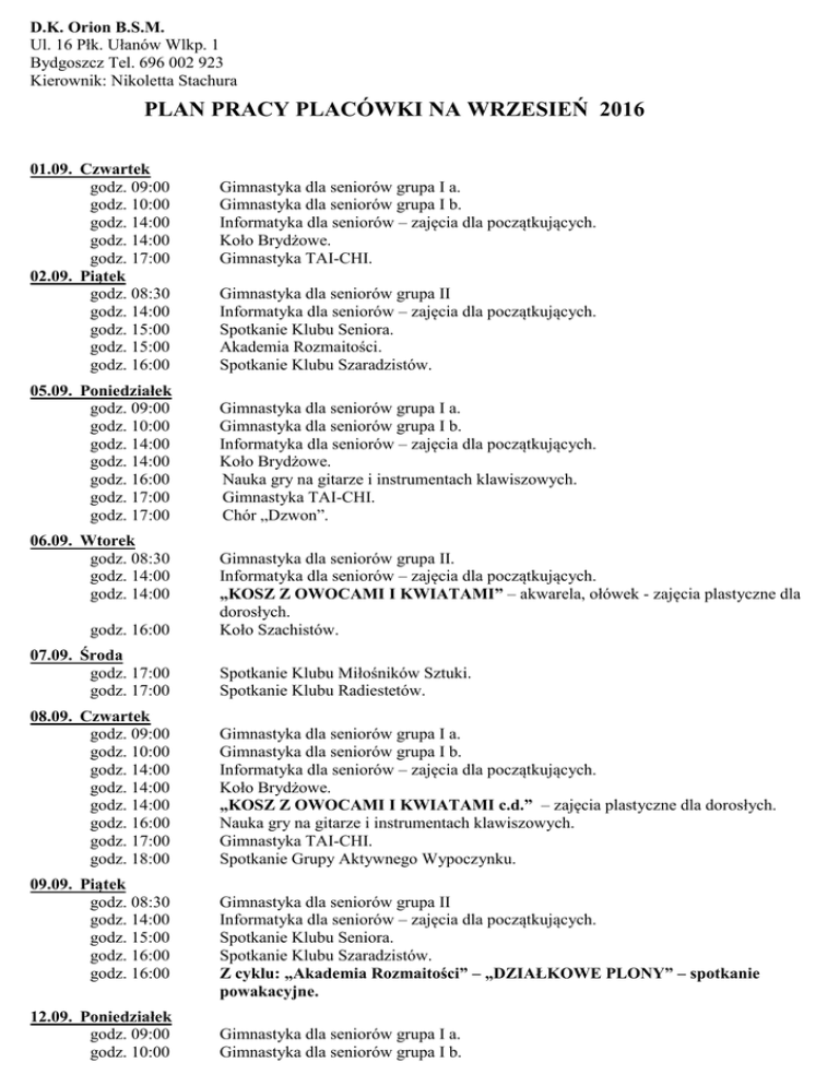 PLAN PRACY PLACÓWKI NA WRZESIEŃ 2016