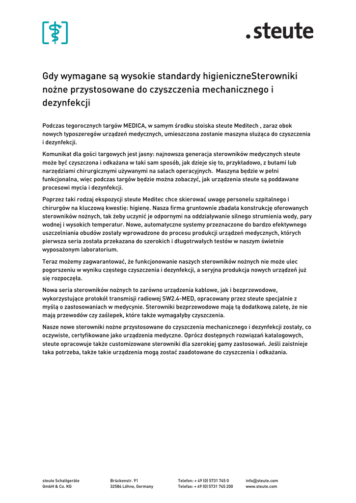 Gdy wymagane są wysokie standardy higieniczneSterowniki nożne przystosowane do czyszczenia mechanicznego i dezynfekcji Podczas tegorocznych targów MEDICA, w samym środku stoiska steute Meditech , zaraz obok nowych typoszeregów urządzeń medycznych, umieszczona zostanie maszyna służąca do czyszczenia i dezynfekcji. Komunikat dla gości targowych jest jasny: najnowsza generacja sterowników medycznych steute może być czyszczona i odkażana w taki sam sposób, jak dzieje się to, przykładowo, z butami lub narzędziami chirurgicznymi używanymi na salach operacyjnych. Maszyna będzie w pełni funkcjonalna, więc podczas targów będzie można zobaczyć, jak urządzenia steute są poddawane procesowi mycia i dezynfekcji. Poprzez taki rodzaj ekspozycji steute Meditec chce skierować uwagę personelu szpitalnego i chirurgów na kluczową kwestię: higienę. Nasza firma gruntownie zbadała konstrukcję oferowanych sterowników nożnych, tak żeby uczynić je odpornymi na oddziaływanie silnego strumienia wody, pary wodnej i wysokich temperatur. Nowe, automatyczne systemy przeznaczone do bardzo efektywnego uszczelniania obudów zostały wprowadzone do procesu produkcji urządzeń medycznych, których pierwsza seria została przekazana do szerokich i długotrwałych testów w naszym świetnie wyposażonym laboratorium. Teraz możemy zagwarantować, że funkcjonowanie naszych sterowników nożnych nie może ulec pogorszeniu w wyniku częstego czyszczenia i dezynfekcji, a seryjna produkcja nowych urządzeń już się rozpoczęła. Nowa seria sterowników nożnych to zarówno urządzenia kablowe, jak i bezprzewodowe, wykorzystujące protokół transmisji radiowej SW2.4-MED, opracowany przez steute specjalnie z myślą o zastosowaniach w medycynie. Sterowniki bezprzewodowe mają tą dodatkową zaletę, że nie mają przewodów czy zaślepek, które także wymagałyby czyszczenia. Nasze nowe sterowniki nożne przystosowane do czyszczenia mechanicznego i dezynfekcji zostały, co oczywiste, certyfikowane jako urządzenia medyczne. Oprócz dostępnych rozwiązań katalogowych, steute opracowuje także customizowane sterowniki dla szerokiej gamy zastosowań. Jeśli zaistnieje taka potrzeba, także takie urządzenia mogą zostać zaadotowane do czyszczenia i odkażania. steute Schaltgeräte GmbH & Co. KG Brückenstr. 91 32584 Löhne, Germany Telefon: + 49 (0) 5731 745 0 Telefax: + 49 (0) 5731 745 200 [email protected] www.steute.com steute Schaltgeräte GmbH & Co. KG Brückenstr. 91 32584 Löhne, Germany Telefon: + 49 (0) 5731 745 0 Telefax: + 49 (0) 5731 745 200 [email protected] www.steute.com