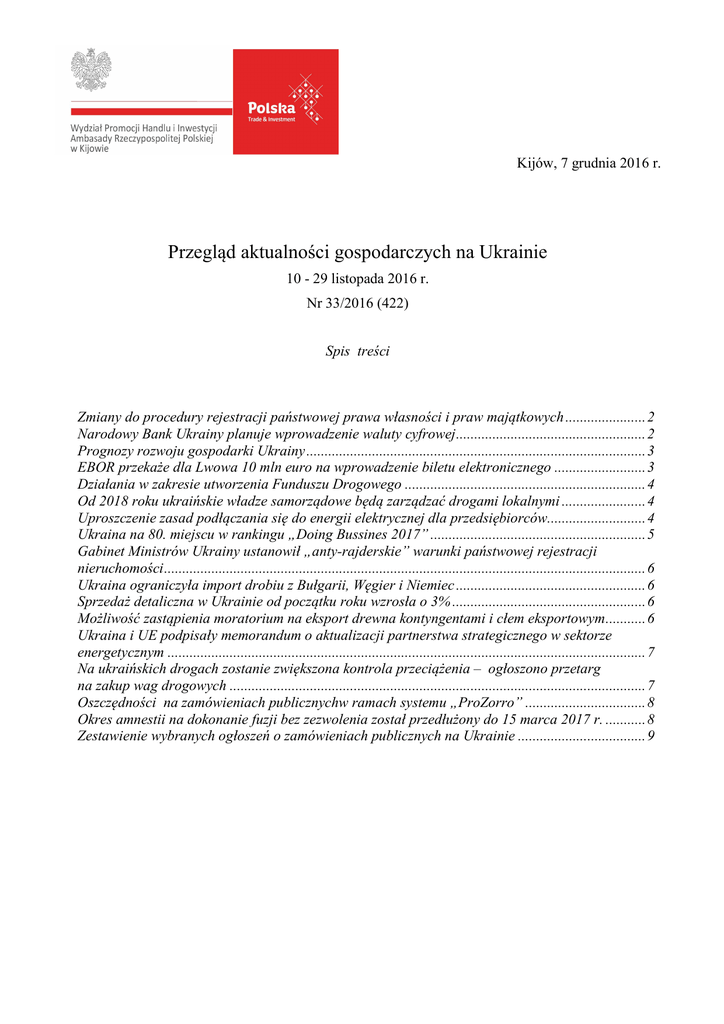 Kijów, 7 grudnia 2016 r. Przegląd aktualności gospodarczych na Ukrainie 10 - 29 listopada 2016 r. Nr 33/2016 (422) Spis treści Zmiany do procedury rejestracji państwowej prawa własności i praw majątkowych ...................... 2 Narodowy Bank Ukrainy planuje wprowadzenie waluty cyfrowej .................................................... 2 Prognozy rozwoju gospodarki Ukrainy ............................................................................................. 3 EBOR przekaże dla Lwowa 10 mln euro na wprowadzenie biletu elektronicznego ......................... 3 Działania w zakresie utworzenia Funduszu Drogowego .................................................................. 4 Od 2018 roku ukraińskie władze samorządowe będą zarządzać drogami lokalnymi ....................... 4 Uproszczenie zasad podłączania się do energii elektrycznej dla przedsiębiorców........................... 4 Ukraina na 80. miejscu w rankingu „Doing Bussines 2017” ........................................................... 5 Gabinet Ministrów Ukrainy ustanowił „anty-rajderskie” warunki państwowej rejestracji nieruchomości .................................................................................................................................... 6 Ukraina ograniczyła import drobiu z Bułgarii, Węgier i Niemiec .................................................... 6 Sprzedaż detaliczna w Ukrainie od początku roku wzrosła o 3% ..................................................... 6 Możliwość zastąpienia moratorium na eksport drewna kontyngentami i cłem eksportowym ........... 6 Ukraina i UE podpisały memorandum o aktualizacji partnerstwa strategicznego w sektorze energetycznym ................................................................................................................................... 7 Nа ukraińskich drogach zostanie zwiększona kontrola przeciążenia – ogłoszono przetarg na zakup wag drogowych .................................................................................................................. 7 Oszczędności na zamówieniach publicznychw ramach systemu „ProZorro” ................................. 8 Okres amnestii na dokonanie fuzji bez zezwolenia został przedłużony do 15 marca 2017 r. ........... 8 Zestawienie wybranych ogłoszeń o zamówieniach publicznych na Ukrainie ................................... 9 *** Uwaga: wszelkie załączniki do informacji prezentowanych poniżej znaleźć można na stronie internetowej Wydziału Promocji Handlu i Inwestycji Ambasady RP w Kijowie (https://ukraine.trade.gov.pl) w informacjach z danego dnia, zamieszczonych w zakładce „Aktualności”. Zmiany do procedury rejestracji państwowej prawa własności i praw majątkowych Kijów, 10 listopada 2016 r. Z dniem 2 listopada 2016 roku weszła w życie nowa Ustawa nr 1666-VIII z dnia 6 października 2016 roku „O wniesieniu zmian do pewnych aktów prawnych Ukrainy odnośnie udoskonalenia rejestracji państwowej praw do majątku nieruchomego oraz ochrony prawa własności”, która ma na celu zapobieganie próbom rejderskich przejęć firm zarejestrowanych w Ukrainie. Ustawa ta ma przeciwdziałać nieuczciwym praktykom przejęcia mienia, majątku i całych firm (praw korporacyjnych) przez oszustów nadużywających niedawno uproszczone procedury rejestracyjne. Kluczowe instrumenty przeciwdziałania bezprawnym przejęciom mienia i majątku, o których mowa w Ustawie są następujące: Rejestrator ma obowiązek powiadomić właściciela majątku nieruchomego o otrzymaniu wniosku o przeprowadzenie rejestracji obiektu. Właściciel może tymczasowo wstrzymać przeprowadzenie rejestracji, jednak równolegle powinien zwrócić się do sądu z odpowiednim zakazem; Ograniczono zasadę eksterytorialności, odtąd rejestracja państwowa odbywa się tylko w granicach regionu, w którym zarejestrowano odpowiednią osobę prawną lub osobę fizyczną - przedsiębiorcę, z wyjątkiem sytuacji, gdy dokumenty rejestracyjne są składane w formie elektronicznej; Znacznie zwiększono odpowiedzialność prawną za podrabianie dokumentów i naruszenie procedur rejestracyjnych; Statut spółki handlowej powinien teraz wyznaczać, między innymi, porządek jego podpisania. Regulowane w odpowiedni sposób procedury mogą zabezpieczać spółkę od zmian przeprowadzonych bez udziału prawnych właścicieli biznesu; Obowiązkowe notarialne poświadczenie podpisów na dokumentach założycielskich (z wyłączeniem przypadków zakładania osoby prawnej); Obowiązkowe notarialne poświadczenie podpisów na decyzji organu upoważnionego przez dyrekcję osoby prawnej do zgłaszania w rejestracji państwowej zmian dotyczących informacji o osobie prawnej (protokół z walnego zgromadzenia członków, itp.). Przy organizacjach charytatywnych oraz stowarzyszeniach poświadczenie notarialne prawdziwości podpisu konieczne jest tylko wtedy, jeśli zostało to przewidziane w statucie. Źródło: PwC Ukraine Narodowy Bank Ukrainy planuje wprowadzenie waluty cyfrowej Kijów, 10 listopada 2016 r. Narodowy Bank Ukrainy zaprezentował kartę cyfrową Cashless Economy technologii Blockchain. z wykorzystaniem Zgodnie z prezentacją Departamentu Systemów Płatniczych oraz Rozwoju Innowacyjnego NBU, w ostatnim kwartale 2017 roku Bank Narodowy planuje emitować walutę cyfrową na bazie technologii Blockchain w ramach projektu NSP „Prostir”. Organ regulujący oczekuje, że taka forma pieniądza wirtualnego obniży koszty centrum autoryzacyjnego i powinna stanowić alternatywę dla kart płatniczych. Źródło: ZIK.UA 2 Prognozy rozwoju gospodarki Ukrainy Kijów, 14 listopada 2016 r. Produkt krajowy brutto Ukrainy w trzecim kwartale 2016 roku w porównaniu z analogicznym okresem ubiegłego roku wzrósł o 1,8%. Wskazują na to dane Państwowej Służby Statystycznej Ukrainy. Zgodnie z tymi danymi PKB Ukrainy w trzecim kwartale 2016 roku w porównaniu do pop