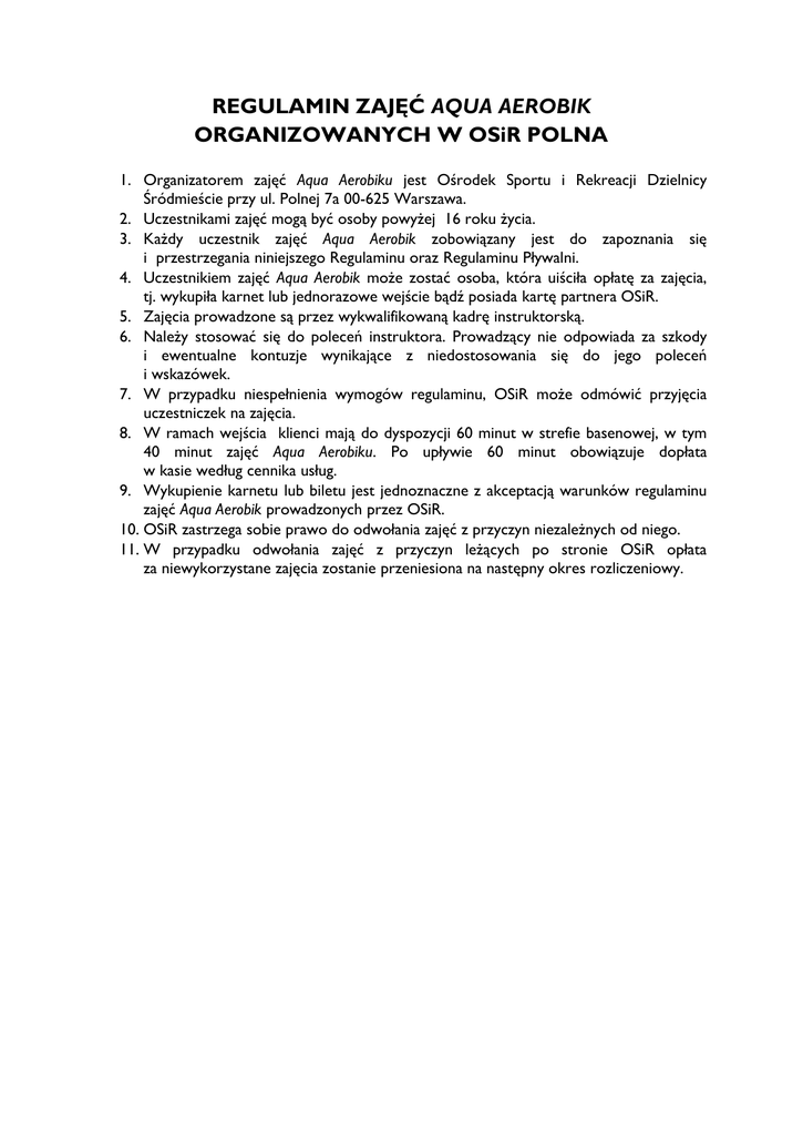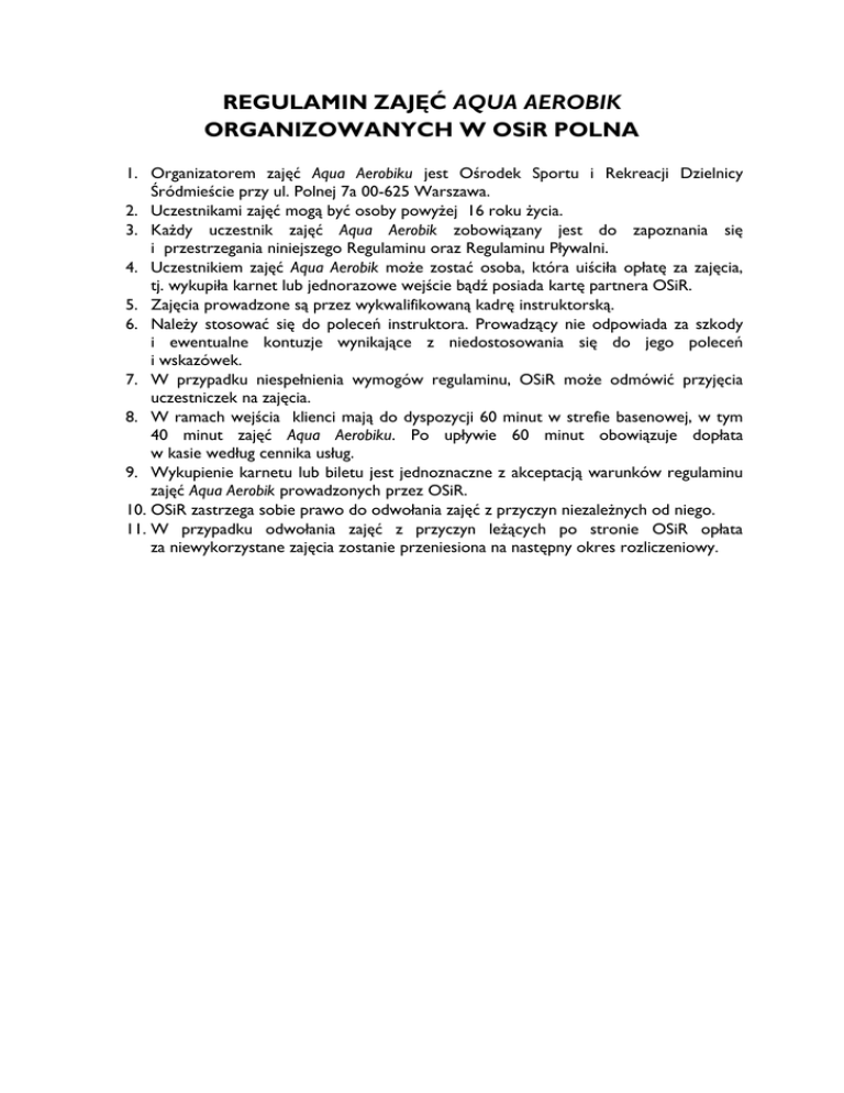 REGULAMIN ZAJĘĆ AQUA AEROBIK ORGANIZOWANYCH W OSiR POLNA 1. Organizatorem zajęć Aqua Aerobiku jest Ośrodek Sportu i Rekreacji Dzielnicy Śródmieście przy ul. Polnej 7a 00-625 Warszawa. 2. Uczestnikami zajęć mogą być osoby powyżej 16 roku życia. 3. Każdy uczestnik zajęć Aqua Aerobik zobowiązany jest do zapoznania się i przestrzegania niniejszego Regulaminu oraz Regulaminu Pływalni. 4. Uczestnikiem zajęć Aqua Aerobik może zostać osoba, która uiściła opłatę za zajęcia, tj. wykupiła karnet lub jednorazowe wejście bądź posiada kartę partnera OSiR. 5. Zajęcia prowadzone są przez wykwalifikowaną kadrę instruktorską. 6. Należy stosować się do poleceń instruktora. Prowadzący nie odpowiada za szkody i ewentualne kontuzje wynikające z niedostosowania się do jego poleceń i wskazówek. 7. W przypadku niespełnienia wymogów regulaminu, OSiR może odmówić przyjęcia uczestniczek na zajęcia. 8. W ramach wejścia klienci mają do dyspozycji 60 minut w strefie basenowej, w tym 40 minut zajęć Aqua Aerobiku. Po upływie 60 minut obowiązuje dopłata w kasie według cennika usług. 9. Wykupienie karnetu lub biletu jest jednoznaczne z akceptacją warunków regulaminu zajęć Aqua Aerobik prowadzonych przez OSiR. 10. OSiR zastrzega sobie prawo do odwołania zajęć z przyczyn niezależnych od niego. 11. W przypadku odwołania zajęć z przyczyn leżących po stronie OSiR opłata za niewykorzystane zajęcia zostanie przeniesiona na następny okres rozliczeniowy.