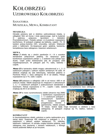 KOŁOBRZEG UZDROWISKO KOŁOBRZEG SANATORIA MUSZELKA, MEWA, KOMBATANT MUSZELKA Ośrodek położony jest w dzielnicy uzdrowiskowej miasta, w odległości 50m od morza i mola spacerowego. Jest to budynek II piętrowy połączony łącznikiem z Zakładem Przyrodoleczniczym. Posiada pokoje 1,2,3,osobowe wyposażone komfortowo. W pokojach znajduje się lodówka, czajnik i TV. W każdym pokoju łazienka (WC, umywalka, natrysk). Większość pokoi z balkonami. Do dyspozycji gości: jadalnia, kawiarnia, kompleksowa baza zabiegowa z basenem solankowym. MEWA Mewa I składa się z dwóch pawilonów A i B o wysokim standardzie połączonych jadalnią. Do dyspozycji gości komfortowo wyposażone pokoje 1, 2 osobowe oraz pokoje typu studio. Część pokoi dostosowana jest do przyjęcia osób niepełnosprawnych. W pokojach jest TV, radio, lodówka i czajnik. Mewa II to kameralny obiekt mogący zakwaterować w 1, 2 i 3 osobowych pokojach z pełnym węzłem sanitarnym 45 osób. W obiekcie znajduje się sala telewizyjna, natomiast jadalnia w Pawilonie Mewa I i baza zabiegowa 50 m od obiektu. Pokoje wyposażone są w TV, radio i czajnik. Mewa III położona w odległości 100 m od morza i 600 m od centrum miasta. Obiekt dysponuje 61 miejscami w odnowionych 1, 2, i 3 osobowych pokojach o podwyższonym standardzie z łazienkami. Pokoje wyposażone w TV , czajnik i radio. Jadalnia i kompleksowa baza zabiegowa znajdują się 50 m od obiektu. Mewa IV to nowo wyremontowany obiekt (otwarcie maj 2008) z komfortowo wyposażonymi 1 i 2 osobowymi pokojami z nowoczesnymi łazienkami. Do dyspozycji gości przygotowano również 2 apartamenty. Obiekt posiada 75 miejsc. Goście będą mogli korzystać w obiekcie z bazy zabiegowej. W pokojach znajduje się TV, telefon, lodówka i czajnik. KOMBATANT to dwunastopiętrowy obiekt, położony w parku nadmorskim przy samej plaży. Dysponuje 450 miejscami w pokojach 1, 2, 3 osobowych z pełnym węzłem sanitarnym, TV, lodówką, telefonem i balkonem. W ośrodku znajdą Państwo jadalnię, bazę zabiegową oraz kawiarnię z tarasem widokowym, z którego można podziwiać Bałtyk aż po horyzont. Główne profile lecznicze dla osób dorosłych: choroby układu oddechowego, choroby układu krążenia, choroby układu wydzielania wewnętrznego i przemiany materii (głównie cukrzyca, choroby tarczycy) Leczenie dzieci obejmuje: schorzenia dróg oddechowych, w tym astmę oskrzelową, choroby układu wydzielania wewnętrznego, zaburzeń odżywiania i przemiany materii (głównie cukrzyca, choroby tarczycy, otyłość), alergiczne schorzenia skóry CENA OD OSOBY ZA DOBĘ W ZŁ : Obiekt MUSZELKA „A” I „B” MEWA I , IV MEWA III MEWA V KOMBATANT Rodzaj pokoju SGL DBL DBL komfort SGL DBL TRB/studio SGL DBL TRB SGL standard SGL komfort [widok morze] DBL standard DB komfort [widok morze] TRB standard 155 135 140 145 125 115 135 115 105 145 01.05. - 31.05. 15.09. - 31.10. 22.12. - 03.01. 175 155 60 165 145 125 155 135 115 165 160 180 200 125 145 165 140 160 180 115 125 145 04.01. - 30.04. 01.11. - 21.12. 01.06. - 14.09 195 175 180 185 165 145 175 155 135 185 CENA OBEJMUJE: nocleg, pełne wyżywienie, 2 wizyty lekarskie oraz doraźną pomoc lekarskopielęgniarską, 2 zabiegi dziennie w dni robocze przy pobycie do 10 dni, 3 zabiegi dziennie w dni robocze przy pobycie powyżej 11 dni CENA NIE OBEJMUJE: opłaty uzdrowiskowej (płatna w recepcji), ubezpieczenia, opłaty za parking, dojazdu, masaży klasycznych, masaży limfatycznych; UWAGI: - dzieci do lat 3 nie korzystające ze świadczeń (wyżywienia, zabiegów i opieki lekarskiej) oraz osobnego łóżka- bezpłatnie, - dzieci w wieku od 3 do 7 lat - 20% zniżki od ceny pobytu, - dzieci w wieku od 8 do 12 lat- 10% zniżki od ceny pobytu, - dopłata za wykorzystanie pokoju 2 osobowego dla 1 osoby - opłata jak za pokój 1 osobowy plus 35,00 za każdy dzień pobytu Wykaz zabiegów wchodzących w skład pakietu leczniczego: Okłady borowinowe, Fasony borowinowe, Maseczka Borowinowa, Kąpiel borowinowa, Kąpiel solankowa, Basen solankowy dla dzieci do lat 15, Basen solankowy + gimnastyka, Kąpiel 4-komorowa, Masaż wirowy *, Interdyn, Masaż wibracyjny, Aquavibron, Terapuls, Masaż podwodny *, Jontoforeza *, Hydromasaż, Magnetronik *, Hydromasaż z olejkami zapachowymi, Natryski (bicze szkockie), Kąpiel ozonowoperełkowa, Sauna, Sauna z basenem, Kąpiel CO2 w wannie, Kąpiel CO2 sucha * (tylko w Kombatancie), Inhalacje indywidualne solankowe, Gimnastyka indywidualna *, Gimnastyka zbiorowa *, Ćwiczenia siłowe "Atlas", Jazda na rowerze treningowym *, Masaż mechaniczny na fotelu*, Masaż mechaniczny na materacu, Lampa Bio-V*, Lampa Sollux*, Lampa Psorilux ( tylko w ZPL II), Laseroterapia*, Materac na podczerwień, Diadynamik *, Ultradźwięki *, Krioterapia z gimnastyką *, Krioterapia bez gimnastyki *, Tens *, Elektrosymulacja *, Galwanizacja * WARUNKI ANULACJI: Zgodnie z warunkami uczestnictwa DOBA HOTELOWA: od godziny 14.00 do godziny 12.00 PRZEDSIĘBIORSTWO PRZYTUŁA STANISŁAW 21 - 010 Łęczna, ul. Stefanii Pawlak 3, tel./fax (81) 752 15 75 [email protected] www.stanpol.info