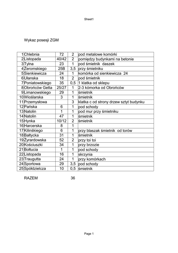 Sheet1 Wykaz posesji ZGM 1 Chlebnia 2 Listopada 3 Tylna 4 Żeromskiego 5 Sienkiewicza 6 Ułanska 7 Poniatowskiego 8 Obrońców Getta 9 Limanowskiego 10 Wioślarska 11 Przemysłowa 12 Pańska 13 Natolin 14 Natolin 15 Hynka 16 Harcerska 17 Kilinśkiego 18 Bałtycka 19 Żyrardowska 20 Kościuszki 21 Bołtucia 22 Listopada 23 Traugutta 24 Sportowa 25 Spółdzielcza RAZEM 72 2 pod metalowe komórki 40/42 2 pomiędzy budynkami na betonie 23 1 pod śmietnik daszek 25B 3,5 przy śmietniku 24 1 komórka od sienkiewicza 24 18 2 pod śmietnik 35 0,5 1 klatka od sklepu 25/27 1 2-3 kómorka od Obrońców 29 1 śmietnik 3 1 śmietnik 3 klatka c od strony drzew sztyt budynku 6 1 pod schody 1 1 pod mur przy śmietniku 47 1 śmietnik 10/12 2 śmietnik 8 1 6 1 przy blaszak śmietnik od torów 31 1 śmietnik 52 2 przy toi toi 34 1 przy brzozie 1 1 pod schody 16 1 skrzynia 24 1 przy komórkach 29 3,5 pod schody 10 0,5 śmietnik 36 Page 1