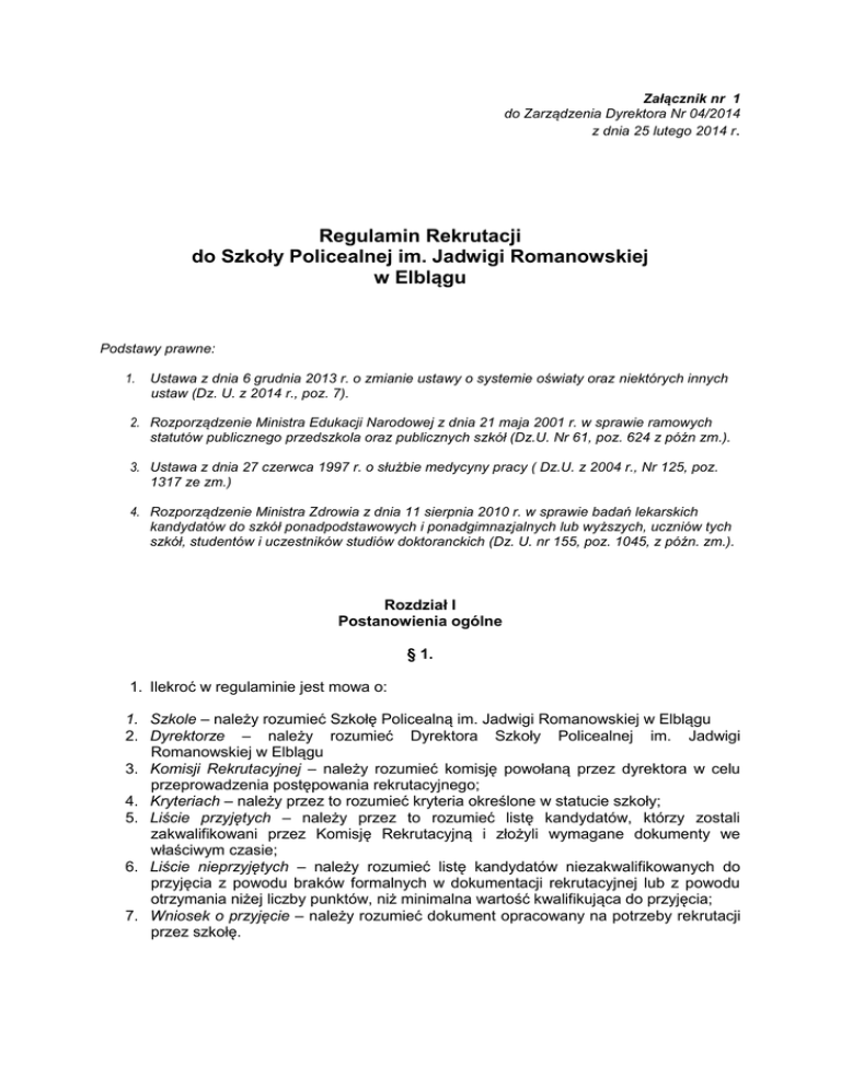 Załącznik nr 1 do Zarządzenia Dyrektora Nr 04/2014 z dnia 25 lutego 2014 r. Regulamin Rekrutacji do Szkoły Policealnej im. Jadwigi Romanowskiej w Elblągu Podstawy prawne: 1. Ustawa z dnia 6 grudnia 2013 r. o zmianie ustawy o systemie oświaty oraz niektórych innych ustaw (Dz. U. z 2014 r., poz. 7). 2. Rozporządzenie Ministra Edukacji Narodowej z dnia 21 maja 2001 r. w sprawie ramowych statutów publicznego przedszkola oraz publicznych szkół (Dz.U. Nr 61, poz. 624 z późn zm.). 3. Ustawa z dnia 27 czerwca 1997 r. o służbie medycyny pracy ( Dz.U. z 2004 r., Nr 125, poz. 1317 ze zm.) 4. Rozporządzenie Ministra Zdrowia z dnia 11 sierpnia 2010 r. w sprawie badań lekarskich kandydatów do szkół ponadpodstawowych i ponadgimnazjalnych lub wyższych, uczniów tych szkół, studentów i uczestników studiów doktoranckich (Dz. U. nr 155, poz. 1045, z późn. zm.). Rozdział I Postanowienia ogólne § 1. 1. Ilekroć w regulaminie jest mowa o: 1. Szkole – należy rozumieć Szkołę Policealną im. Jadwigi Romanowskiej w Elblągu 2. Dyrektorze – należy rozumieć Dyrektora Szkoły Policealnej im. Jadwigi Romanowskiej w Elblągu 3. Komisji Rekrutacyjnej – należy rozumieć komisję powołaną przez dyrektora w celu przeprowadzenia postępowania rekrutacyjnego; 4. Kryteriach – należy przez to rozumieć kryteria określone w statucie szkoły; 5. Liście przyjętych – należy przez to rozumieć listę kandydatów, którzy zostali zakwalifikowani przez Komisję Rekrutacyjną i złożyli wymagane dokumenty we właściwym czasie; 6. Liście nieprzyjętych – należy rozumieć listę kandydatów niezakwalifikowanych do przyjęcia z powodu braków formalnych w dokumentacji rekrutacyjnej lub z powodu otrzymania niżej liczby punktów, niż minimalna wartość kwalifikująca do przyjęcia; 7. Wniosek o przyjęcie – należy rozumieć dokument opracowany na potrzeby rekrutacji przez szkołę. § 2. 1. Kandydatów do klasy pierwszej szkoły oraz na kwalifikacyjny kurs zawodowy przyjmuje się po przeprowadzeniu postępowania rekrutacyjnego. 2. O przyjęciu w trakcie bieżącego roku szkolnego, w tym do klas pierwszych, decyduje dyrektor. 3. Jeżeli przyjęcie ucznia, o którym mowa w ust. 2, wymaga przeprowadzenia zmian organizacyjnych pracy Szkoły powodujących dodatkowe skutki finansowe, dyrektor szkoły może przyjąć ucznia po uzyskaniu zgody organu prowadzącego. 4. Postępowanie rekrutacyjne jest prowadzone na wniosek kandydata. 5. Postępowanie rekrutacyjne może być prowadzone z wykorzystaniem systemów informatycznych. 6. Przepisy niniejszego Regulaminu stosuje się także do kandydatów posiadających orzeczenie o potrzebie kształcenia specjalnego, którzy ubiegają się o przyjęcie do szkoły ogólnodostępnej. 7. Zapisy w Regulaminie Rekrutacji do Szkoły Policealnej im. Jadwigi Romanowskiej w Elblągu zwanym dalej „Regulaminem”, określają ogólne zasady przyjmowania kandydatów do szkoły, tryb postępowania rekrutacyjnego, kryteria naboru, rodzaj dokumentów niezbędnych w postępowaniu rekrutacyjnym oraz zakres uprawnień i obowiązków Komisji Rekrutacyjnej. 8. Dyrektor Szkoły podaje do publicznej wiadomości informacje o kierunkach naboru na dany rok szkolny, ilości wolnych miejsc na kierunku, terminie rekrutacji, kryteriach, wymaganych dokumentach i warunkach przyjęcia kandydata do szkoły na stronie WWW. szkoły w zakładce REKRUTACJA oraz na tablicy ogłoszeń w szkole w terminie do 30 marca każdego roku kalendarzowego. 9. Szkoła prowadzi nabór w oparciu o zasadę powszechnej dostępności. Rozdział II Zasady rekrutacji § 3. 1. Do klasy pierwszej Szkoły Policealnej dla młodzieży i dorosłych przyjmuje się kandydatów, którzy posiadają: 1) wykształcenie średnie; 2) zaświadczenie lekarskie, zawierające orzeczenie o braku przeciwwskazań zdrowotnych do podjęcia praktycznej nauki zawodu w danym zawodzie, wydane zgodnie z przepisami w sprawie badań lekarskich kandydatów do szkół ponadgimnazjalnych lub wyższych, uczniów tych szkół, studentów i uczestników studiów doktoranckich. 2. W przypadku większej liczby kandydatów spełniających warunki, o których mowa w ust. 1, niż liczba wolnych miejsc w szkole, na pierwszym etapie postępowania rekrutacyjnego są brane pod uwagę łącznie następujące kryteria: 1) wielodzietność rodziny kandydata, 2) niepełnosprawność kandydata, 3) niepełnosprawność dziecka kandydata, 4) niepełnosprawność innej osoby bliskiej, nad którą kandydat sprawuje opiekę, 5) samotne wychowywanie dziecka przez kandydata. 3. Kryteria, o których mowa w ust. 2, mają jednakową wartość. Na potrzeby uporządkowania w kolejności od największej liczby punktów do liczby najmniejszej przyjmuje się dla każdego kryterium wartość – „ 1”. 4. W przypadku równorzędnych wyników uzyskanych na pierwszym etapie postępowania rekrutacyjnego lub jeżeli po zakończeniu tego etapu szkoła nadal dysponuje wolnymi miejscami, na drugim etapie postępowania rekrutacyjnego jest brana pod uwagę kolejność zgłoszeń. § 4. 1. Na kwalifikacyjny kurs zawodowy przyjmuje się kandydatów, którzy posiadają: 1) minimum wykształcenie podstawowe, a w przypadku niektórych zawodów określonych w rozporządzeniu MEN z dnia 23 grudnia 2013 roku w sprawie klasyfikacji zawodów szkolnictwa zawodowego, wykształcenie średnie. 2) zaświadczenie lekarskie, zawierające orzeczenie o braku przeciwwskazań zdrowotnych do podjęcia praktycznej nauki zawodu w danym zawodzie, wydane zgodnie z przepisami w sprawie badań lekarskich kandydatów do szkół ponadgimnazjalnych lub wyższych, uczniów tych szkół, studentów i uczestników studiów doktoranckich. 2. W przypadku większej liczby kandydatów spełniających warunek, o którym mowa w ust. 1, niż liczba wolnych miejsc na dany kwalifikacyjny kurs zawodowy, na pierwszym etapie postępowania rekrutacyjnego przyjmuje się kandydatów, którzy nie posiadają żadnyc