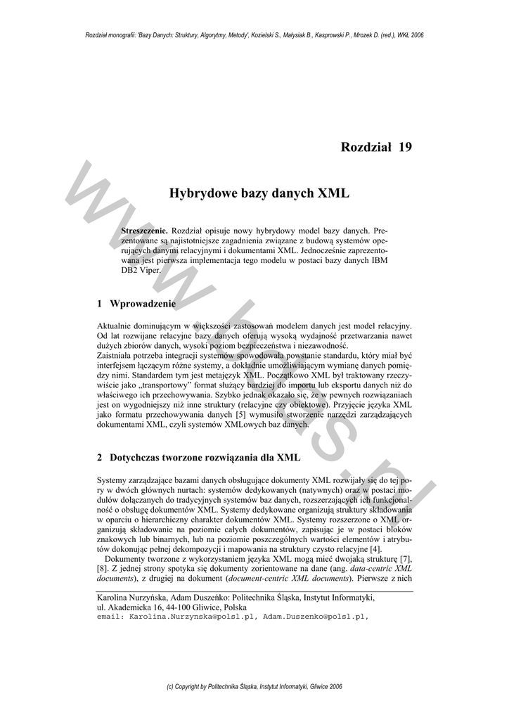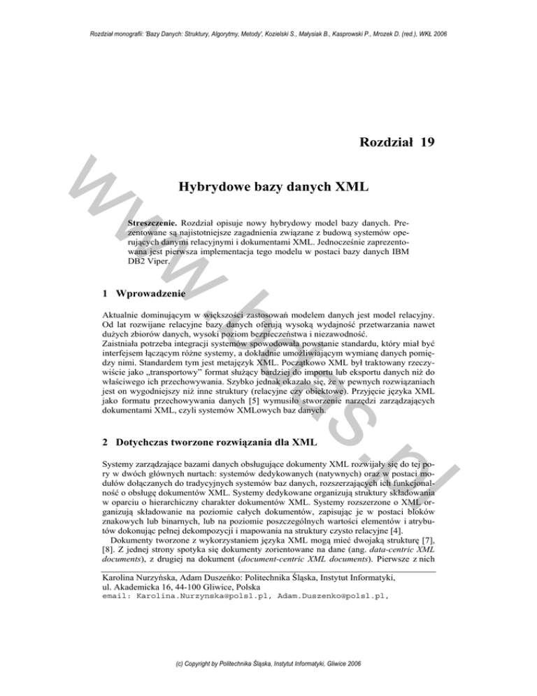 Rozdział monografii: 'Bazy Danych: Struktury, Algorytmy, Metody', Kozielski S., Małysiak B., Kasprowski P., Mrozek D. (red.), WKŁ 2006 Rozdział 19 w Hybrydowe bazy danych XML w w Streszczenie. Rozdział opisuje nowy hybrydowy model bazy danych. Prezentowane są najistotniejsze zagadnienia związane z budową systemów operujących danymi relacyjnymi i dokumentami XML. Jednocześnie zaprezentowana jest pierwsza implementacja tego modelu w postaci bazy danych IBM DB2 Viper. 1 Wprowadzenie da .b Aktualnie dominującym w większości zastosowań modelem danych jest model relacyjny. Od lat rozwijane relacyjne bazy danych oferują wysoką wydajność przetwarzania nawet dużych zbiorów danych, wysoki poziom bezpieczeństwa i niezawodność. Zaistniała potrzeba integracji systemów spowodowała powstanie standardu, który miał być interfejsem łączącym różne systemy, a dokładnie umożliwiającym wymianę danych pomiędzy nimi. Standardem tym jest metajęzyk XML. Początkowo XML był traktowany rzeczywiście jako „transportowy” format służący bardziej do importu lub eksportu danych niż do właściwego ich przechowywania. Szybko jednak okazało się, że w pewnych rozwiązaniach jest on wygodniejszy niż inne struktury (relacyjne czy obiektowe). Przyjęcie języka XML jako formatu przechowywania danych [5] wymusiło stworzenie narzędzi zarządzających dokumentami XML, czyli systemów XMLowych baz danych. pl s. 2 Dotychczas tworzone rozwiązania dla XML Systemy zarządzające bazami danych obsługujące dokumenty XML rozwijały się do tej pory w dwóch głównych nurtach: systemów dedykowanych (natywnych) oraz w postaci modułów dołączanych do tradycyjnych systemów baz danych, rozszerzających ich funkcjonalność o obsługę dokumentów XML. Systemy dedykowane organizują struktury składowania w oparciu o hierarchiczny charakter dokumentów XML. Systemy rozszerzone o XML organizują składowanie na poziomie całych dokumentów, zapisując je w postaci bloków znakowych lub binarnych, lub na poziomie poszczególnych wartości elementów i atrybutów dokonując pełnej dekompozycji i mapowania na struktury czysto relacyjne [4]. Dokumenty tworzone z wykorzystaniem języka XML mogą mieć dwojaką strukturę [7], [8]. Z jednej strony spotyka się dokumenty zorientowane na dane (ang. data-centric XML documents), z drugiej na dokument (document-centric XML documents). Pierwsze z nich Karolina Nurzyńska, Adam Duszeńko: Politechnika Śląska, Instytut Informatyki, ul. Akademicka 16, 44-100 Gliwice, Polska email: [email protected], [email protected], (c) Copyright by Politechnika Śląska, Instytut Informatyki, Gliwice 2006 Rozdział monografii: 'Bazy Danych: Struktury, Algorytmy, Metody', Kozielski S., Małysiak B., Kasprowski P., Mrozek D. (red.), WKŁ 2006 K. Nurzyńska, A. Duszeńko w wykorzystywane są zazwyczaj do przenoszenia danych między różnymi systemami. W związku z tym największą wagę przywiązuje się do danych w nich zawartych. Nie jest ważna w tym przypadku kolejność elementów. Ponadto dokumenty te charakteryzują się regularną strukturą i równomierną granulacją. Istnieją także dokumenty zorientowane na dokument, których struktura jest nieregularna oraz charakteryzuje się zróżnicowaną granulacją. Kolejność elementów w tym przypadku ma znaczenie. Dokumenty te powstają zazwyczaj nieautomatycznie lub mogą być wynikiem transformacji z innego formatu tekstu. Na początku struktura dokumentu XML wymuszała na użytkowniku wybór odpowiedniej bazy danych ułatwiającej składowanie wybranego typu dokumentu. Jednak najnowsze wersje systemów bazodanowych, natywnych [3] jak i XML enabled, umożliwiają składowanie dowolnego typu dokumentu. Autorzy [6] dokonali porównania pracy systemów składujących różne dokumenty XML. Porównywali oni relacyjny system zarządzania bazą danych wspierający XML (ang. XML enabled) na przykładzie DB2 z systemem natywnym na przykładzie SZBD (systemu zarządzającego bazami danych) Tamino [10]. Obydwa systemy charakteryzowały się podobną funkcjonalnością, jednak sposób, w jaki poszczególne bazy radziły sobie ze składowaniem dokumentów, był inny. Opisywane systemy umożliwiały zarządzanie zarówno dokumentami XML jak i informacją w nich zawartą. Bazy danych zapewniały zachowanie równoważności w składowaniu dokumentów poprzez wykorzystanie modelu danych. Zwracały uwagę na zarządzanie kolejnymi wersjami typu dokumentów tak, aby struktura dokumentu mogła się zmieniać w czasie oraz umożliwiały zastosowanie indeksów na elementach struktur dokumentu, co ma na celu szybsze wykonywanie zapytań w kierunkach innych niż zgodne z hierarchią dokumentu. Zwracały także uwagę, na odpowiednią autoryzację użytkowników i ich uprawnienia w dostępie do dokumentów lub ich części. Niestety w omawianych systemach pozostały kwestie jeszcze nierozwiązane. W przypadku systemów bazy danych typu XML enabled składowanie dokumentów zorientowanych na dokument wiąże się ze znaczącym nakładem pracy związanym z przełożeniem niestrukturalnych hierarchicznych danych XML na nieelastyczną postać relacyjnych tabel. Tabele te w rezultacie tych przekształceń są rzadko wypełnione i wymagają wykonywania licznych złączeń podczas realizacji zapytań, co znacząco wydłuża czas ich realizacji [11]. Dodatkowo należy spodziewać się utraty kolejności elementów oraz utraty istotnych informacji, takich jak definicja typu dokumentu, instrukcji przetwarzania czy komentarzy. Powoduje to utratę równoważności dokumentu ładowanego do bazy danych i dokumentu z niej odzyskiwanego. Kolejnymi elementami systemu, które wymagają dopracowania jest poprawienie możliwości baz XML począwszy od zdefiniowania standardów związanych z XML jak i implementacja już istniejących standardów we wszystkich dostępnych bazach. Dodatkowo w bazach natywnych nie został rozwiązany problem nak