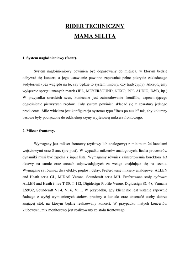 RIDER TECHNICZNY MAMA SELITA 1. System nagłośnieniowy (front). System nagłośnieniowy powinien być dopasowany do miejsca, w którym będzie odbywał się koncert, a jego ustawienie powinno zapewniać pełne pokrycie zakładanego audytorium (bez względu na to, czy będzie to system liniowy, czy tradycyjny). Akceptujemy wyłącznie sprzęt uznanych marek (JBL, MEYERSOUND, NEXO, POL AUDIO, D&B, itp.) W przypadku szerokich scen, konieczne jest zainstalowanie frontfillu, zapewniającego dogłośnienie pierwszych rzędów. Cały system powinien składać się z aparatury jednego producenta. Mile widziana jest konfiguracja systemu typu "Bass po auxie" tak, aby kolumny basowe były podłączone do oddzielnej szyny wyjściowej miksera frontowego. 2. Mikser frontowy. Wymagany jest mikser frontowy (cyfrowy lub analogowy) z minimum 24 kanałami wejściowymi oraz 8 aux (pre post). W wypadku mikserów analogowych, liczba procesorów dynamiki musi być zgodna z input listą. Wymagamy również zainsertowania korektora 1/3 oktawy na sumie oraz auxach odpowiadających za wedge znajdujące się na scenie. Wymagane są również dwa efekty: pogłos i delay. Preferowane miksery analogowe: ALLEN and Heath seria GL, MIDAS Verona, Soundcraft seria MH. Preferowane stoły cyfrowe: ALLEN and Heath i-live T-80, T-112, Digidesign Profile Venue, Digidesign SC 48, Yamaha LS9/32, Soundcraft Vi 4, Vi 6, Vi 1. W przypadku, gdy klient nie jest wstanie zapewnić żadnego z wyżej wymienionych stołów, prosimy o kontakt oraz obecność osoby dobrze znającej stół, na którym będzie realizowany koncert. W przypadku małych koncertów klubowych, mix monitorowy jest realizowany ze stołu frontowego. 3. Mikser monitorowy. Zespół nie posiada realizatora monitorów (w przypadku małych koncertów, monitory po uprzedniej konsultacji mogą być realizowane ze stołu frontowego), prosimy więc o zapewnienie obecności na tym stanowisku wykwalifikowanej osoby. Wybór miksera leży w tym wypadku po stronie firmy realizującej nagłośnienie danego koncertu. Ważne, aby był to mikser renomowanej firmy, wolny od jakichkolwiek szumów, brumów i przydźwięków :) W przypadku dużych scen prosimy o sidefill. Do realizacji koncertu potrzebujemy 4 oddzielnych linii monitorowych. 1. Wokal (Igor) - 2x wedge min. 500 watt rms 2. Bas (Herbert) - 1x wedge min. 500 watt rms 3. Gitara (Grzesiek) - 1x wedge min. 500 watt rms 4. Bębny (Mikołaj)- linia xlr/lub wedge min. 500 watt rms Input Lista In Instrument Mikrofon Insert foh 1 Stopa AKG D112, EV ND gate 868 2 Werbel (góra) SM 57 gate 3 Werbel (dół) SM 57 gate 4 Hi hat SM 81, AKG C451 5 Tom 1 Sehnheiser E 604 gate 6 Tom 2 Sehnheiser E 604 gate 7 Oh l AKG C451 8 Oh p AKG C451 9 Bas Linia xlr comp 10 Bas AKG D112, comp Audiotechnica AE 2500, EV ND 868, Beta 52 11 Gitara elektryczna SM 57 12 Wokal Bas SM 58, Beta 58, (Herbert) Audix OM 07 Wokal Gitara SM 58, Beta 58, (Grzesiek) Audix OM 07 Wokal Igor SM 58, Beta 58, 13 14 Audix OM 07 comp comp comp Stage Plan Prosimy o kontakt przed koncertem oraz uśmiechniętą i miłą ekipę techniczną. Realizator dźwięku: Callsound Tomasz Kolski Tel.793768661 Mail: [email protected]