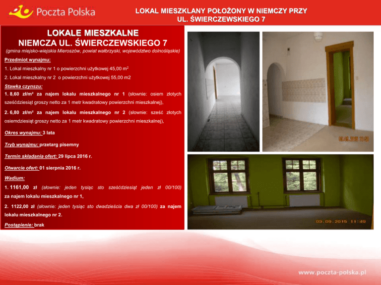 LOKAL MIESZKLANY POŁOŻONY W NIEMCZY PRZY UL. ŚWIERCZEWSKIEGO 7 LOKALE MIESZKALNE NIEMCZA UL. ŚWIERCZEWSKIEGO 7 (gmina miejsko-wiejskia Mieroszów, powiat wałbrzyski, województwo dolnośląskie) Przedmiot wynajmu: 1. Lokal mieszkalny nr 1 o powierzchni użytkowej 45,00 m2 2. Lokal mieszkalny nr 2 o powierzchni użytkowej 55,00 m2 Stawka czynszu: 1. 8,60 zł/m² za najem lokalu mieszkalnego nr 1 (słownie: osiem złotych sześćdziesiąt groszy netto za 1 metr kwadratowy powierzchni mieszkalnej), 2. 6,80 zł/m² za najem lokalu mieszkalnego nr 2 (słownie: sześć złotych osiemdziesiąt groszy netto za 1 metr kwadratowy powierzchni mieszkalnej), Okres wynajmu: 3 lata Tryb wynajmu: przetarg pisemny Termin składania ofert: 29 lipca 2016 r. Otwarcie ofert: 01 sierpnia 2016 r. Wadium: 1. 1161,00 zł (słownie: jeden tysiąc sto sześćdziesiąt jeden zł 00/100) za najem lokalu mieszkalnego nr 1, 2. 1122,00 zł (słownie: jeden tysiąc sto dwadzieścia dwa zł 00/100) za najem lokalu mieszkalnego nr 2. Postąpienie: brak Kliknij i zlokalizuj na mapie Opis przedmiotu wynajmu: Lokal mieszkalny usytuowany jest na I piętrze budynku stanowiącego własność Poczty Polskiej S.A. Składa się z 2 pokoi (17,50 m²,14,00 m²), kuchni (8,00 m²), przedpokoju (3,5 m²), łazienki z wc (2,00 m²). Lokal wyposażony jest w instalacje: energetyczną, wodną, kanalizacyjną i gazową. System centralnego ogrzewania – wspólna kotłownia zlokalizowana w piwnicy. Niezależnie od czynszu Najemca będzie ponosił opłaty za wodę, nieczystości płynne, gospodarowanie odpadami komunalnymi oraz centralnego ogrzewania. Opis przedmiotu wynajmu: Lokal mieszkalny usytuowany jest na I piętrze budynku stanowiącego własność Poczty Polskiej S.A. Składa się z 2 pokoi, w tym jednego z aneksem kuchennym, przedpokoju, wc - poza lokalem na półpiętrze klatki schodowej. Lokal wyposażony jest w instalacje: elektryczną, wodnokanalizacyjną, gazową, domofonową i centralnego ogrzewania - wspólna kotłownia zlokalizowana w piwnicy. Niezależnie od czynszu Najemca będzie ponosił opłaty za wodę, nieczystości płynne, gospodarowanie odpadami komunalnymi oraz centralnego ogrzewania. Opis nieruchomości: Miejscowość Niemcza Ulica, nr budynku Gen. Karola Świerczewskiego 7 Powierzchnia budynku, w którym zlokalizowany jest przedmiot wynajmu 410,95 m² Nr działki ewidencyjnej, obręb 128, obręb 0001 Stare Miasto Księga wieczysta, Sąd Rejonowy, Nr Wydziału SW1D/00024924/9 Stan prawny gruntu Własność Skarbu Państwa w użytkowaniu wieczystym Poczty Polskiej S.A. do dnia 5 grudnia 2089 r. Lokalizacja i dostępność komunikacyjna: Nieruchomość położona jest w Niemczy przy ul. Gen. Karola Świerczewskiego 7, obręb Stare Miasto. Miasto położone w województwie dolnośląskim, powiecie dzierżoniowskim, nad rzeką Ślężą. W granicach administracyjnych miasta zlokalizowana jest droga krajowa DK8 (Wilno- Praga). Obecnie ośrodek usługowy regionu turystycznego. Niewielkie zakłady przemysłu maszynowego, odzieżowego, drzewnego, dziewiarskiego i spożywczego. Opis nieruchomości: Nieruchomość ewidencyjnie oznaczona nr 128 o powierzchni 967 m2 obręb nr 0001 Stare Miasto, dla której Sąd Rejonowy w Dzierżoniowie, VI Wydział Ksiąg Wieczystych prowadzi księgę wieczystą nr SW1D/00024924/9. Przedmiotowa nieruchomość gruntowa jest własnością Skarbu Państwa w użytkowaniu wieczystym Poczty Polskiej S.A. do 5 grudnia 2089 r. OBWIESZCZENIE O PRZETARGU PISEMNYM NA NAJEM LOKALI MIESZKALNYCH Wynajmujący: Poczta Polska S.A. z siedzibą w Warszawie, 00-940 Warszawa, ul. Rodziny Hiszpańskich 8. Prowadzący przetarg: Poczta Polska S.A., Pion Infrastruktury Obszar Operacyjny ds. Nieruchomości we Wrocławiu, ul. Awicenny 21, 50 -900 Wrocław. Miejsce przetargu: Poczta Polska S.A., Pion Infrastruktury Obszar Operacyjny ds. Nieruchomości we Wrocławiu ul. Awicenny 21, 50 -900 Wrocław– pokój Nr 202, II piętro. Okres trwania umowy – 3 lata. Przedmiot najmu: 1. Lokal mieszkalny Nr 1 usytuowany na I piętrze budynku Poczty Polskiej S.A w miejscowości Niemcza przy ul. Gen. Karola Świerczewskiego 7, powierzchni użytkowej 45,00 m². Składający się z kuchni, 2 pokoi (przejściowych), przedpokoju, łazienki z wc. Wyposażony jest w instalację wodno– kanalizacyjną, elektryczną, domofonową, gazową i centralnego ogrzewania. 2. Lokal mieszkalny Nr 2 usytuowany na I piętrze budynku Poczty Polskiej S.A w miejscowości Niemcza przy ul. Gen. Karola Świerczewskiego 7, powierzchni użytkowej 55,00 m². Składający się z przedpokoju, pokoju z aneksem kuchennym, pokoju, wc na półpiętrze klatki schodowej. Wyposażony jest w instalację wodno kanalizacyjną, elektryczną, domofonową, gazową i centralnego ogrzewania. Wywoławcza stawka czynszu: 1. 8,60 zł/m² netto za najem lokalu mieszkalnego nr 1 (słownie: osiem zł 60/100 za 1 metr kwadratowy powierzchni mieszkalnej) 2. 6,80 zł/m² netto za najem lokalu mieszkalnego nr 3 (słownie: sześć zł 80/100 za 1 metr kwadratowy powierzchni mieszkalnej), W/w stawki wywoławcze czynszu najmu nie obejmują opłat eksploatacyjnych za energię elektryczną, kosztów ogrzewania, zużycia wody, gazu oraz opłat za wywóz nieczystości stałych i odprowadzenia nieczystości płynnych. Wadium : 1) 1 161,00 zł (słownie: jeden tysiąc sto sześćdziesiąt jeden zł 00/100), 1 122,00 zł (słownie: jeden tysiąc sto dwadzieścia dwa zł 00/100). Wadium należy wnieść w gotówce, przelewem na konto w Banku Pocztowym S.A. w Bydgoszczy, Nr konta: 85 1320 0019 0099 0718 2000 0025 tytułem: PI we Wrocławiu – przetarg na wynajem lokalu mieszkalnego w miejscowości Niemczy z dopiskiem lokal mieszkalny nr 1 lub lokal mieszkalny nr 2, nie później niż do 28 lipca 2016 roku, przy czym jako termin wpłaty rozumiany jest termin uznania rachunku Poczty Polskiej S.A. Szczegółowe informacje na temat przetargu i warunków najmu zawarte są w projekcie umowy naj