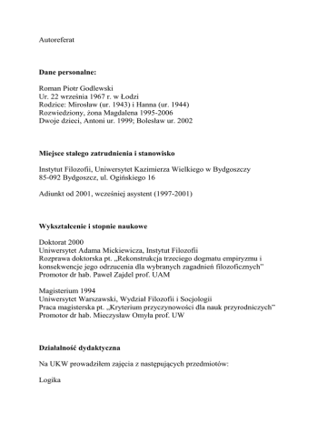 Autoreferat Dane personalne: Roman Piotr Godlewski Ur. 22 września 1967 r. w Łodzi Rodzice: Mirosław (ur. 1943) i Hanna (ur. 1944) Rozwiedziony, żona Magdalena 1995-2006 Dwoje dzieci, Antoni ur. 1999; Bolesław ur. 2002 Miejsce stałego zatrudnienia i stanowisko Instytut Filozofii, Uniwersytet Kazimierza Wielkiego w Bydgoszczy 85-092 Bydgoszcz, ul. Ogińskiego 16 Adiunkt od 2001, wcześniej asystent (1997-2001) Wykształcenie i stopnie naukowe Doktorat 2000 Uniwersytet Adama Mickiewicza, Instytut Filozofii Rozprawa doktorska pt. „Rekonstrukcja trzeciego dogmatu empiryzmu i konsekwencje jego odrzucenia dla wybranych zagadnień filozoficznych” Promotor dr hab. Paweł Zajdel prof. UAM Magisterium 1994 Uniwersytet Warszawski, Wydział Filozofii i Socjologii Praca magisterska pt. „Kryterium przyczynowości dla nauk przyrodniczych” Promotor dr hab. Mieczysław Omyła prof. UW Działalność dydaktyczna Na UKW prowadziłem zajęcia z następujących przedmiotów: Logika Filozofia (również w języku angielskim) Filozofia z elementami etyki Etyka Etyka dziennikarska Ontologia (ćw.) Filozofia języka Filozofia umysłu (również w języku angielskim) Historia filozofii Antropologia kulturowa Elementy współczesnej ontologii formalnej Translatorium tekstów filozoficznych z języka angielskiego W tym zajęcia autorskie: Filozofia analityczna (konwersatorium prezentujące metodę analizy pojęciowej) Etyka znaturalizowana (wykład poświęcony wyjaśnieniu jak możliwa jest etyczność jednostek kierowanych popędami) O bezsensie świata (wykład podsumowujący naukową wiedzę o człowieku) Filozofia silnego charakteru (wykład poświęcony zagadnieniu dominacji i robieniu tego, co się chce, oraz uległości i robieniu tego, co chcą inni). Ponadto w ramach godzin zleconych w Wyższej Szkole Informatyki i Nauk Społeczno-Prawnych w Bydgoszczy, ul. Unii Lubelskiej 4, w roku akademickim 2006/2007 prowadziłem zajęcia z przedmiotu: Etyka biznesu Uczestnictwo w projektach badawczych Dwukrotnie w latach akademickich 2009/10 oraz 2012/13 wygłosiłem referat w ramach programu badawczego Jerzego Pelca „Język – Znak – Rzeczywistość”. Były to referaty „Predykaty obiektywne” [c2009] oraz „W sprawie argumentu Putnama przeciwko możliwości scenariusza sceptyckiego” [c2013a]. Aktywność badawcza Powołanie filozoficzne odkryłem w sobie pod koniec szkoły podstawowej. Wyrosło ono ze zderzenia zainteresowań naukami przyrodniczymi z pozyskiwaną w czasie katechez wiedzą religijną i głęboką wiarą. Ogólnie biorąc chciałem zrozumieć wszystko. Oznaczało to pragnienie, by dowiedzieć się, co istnieje, i jakie rządzą tym prawa. Z czasem coraz bardziej oczywiste stało się, że niepodobna posiąść całej wiedzy szczegółowej, a możliwe jest jedynie zapoznanie się z zarysem ogółu świata, a także z najogólniejszymi teoriami fizycznymi, chemicznymi, biologicznymi czy humanistycznymi. Ostatecznie okazało się, że rozumienie wymaga nie tyle tego, by poznać uznane teorie naukowe, ale wiedzieć, co w ogóle mogłoby istnieć. Ogólnie biorąc polem mojej aktywności badawczej jest analiza pojęciowa, zatem poszukiwanie definicji pojęć, w tym definicji cząstkowych (związków między pojęciami). Celem analizy jest zbudowanie jednolitego systemu pojęć, w którym ustalone byłyby związki między pojęciami tak, aby wszystkie pojęcia obejmowała jedna dziedzina i aby wszystkie można było położyć na jednej płaszczyźnie. W szczególności celem jest odnalezienie powiązań między grupami pojęć, które wydają się odrębne: 1. pojęciowość przyrodnicza 2. pojęciowość psychologiczna 3. pojęciowość językowa 4. pojęciowość przedmiotów idealnych (w tym matematycznych) 5. pojęciowość etyczna 6. pojęciowość religijno-magiczna Analiza pojęciowa ma moim zdaniem charakter sensu stricto naukowy, do szczególnych jej działów należy logika, matematyka, cybernetyka czy mechanika. Podbudową tych badań jest ogólna, a nieraz pogłębiona wiedza ze wszystkich dziedzin szczegółowych. Fakt, że mój ojciec jest biologiem (prof. UŁ) a matka lekarzem (anestezjologiem), ułatwił mi nabycie podstawowej wiedzy z zakresu biologii. Stała się ona punktem wyjścia pogłębienia tych zainteresowań w trybie amatorskim, przez lekturę i rozmowę. Pogłębioną wiedzę z zakresu nauk przyrodniczych zdobyłem studiując fizykę na UW. Studiów nie ukończyłem. Studiowałem przez 5 semestrów. Pogłębiłem tam również podstawową wiedzę matematyczną. Porzuciwszy fizykę rozpocząłem studia filozoficzne na tej samej uczelni. Wtedy dopiero przyszła pora na studia z zakresu nauk humanistycznych. W trybie samodzielnej lektury zyskałem wiedzę z zakresu historii powszechnej a także historii wybranych krajów i epok. Początkowo moje zainteresowania humanistyczne koncentrowały się wokół kwestii religioznawczych. Miało to związek z zanikaniem mojej wiary religijnej. Zainteresowania te rozszerzyły się na ogólne studia antropologiczne, w tym z zakresu historii obyczajowości, historii prawa i historii politycznej. W późniejszym czasie dodatkowo pogłębiłem wiedzę z zakresu językoznawstwa, ekonomii i psychologii. Zgromadzona wiedza jest podstawą metody, która określam jako „metodę filozoficzną”. Polega ona na tym, by każde zagadnienie badać z uwzględnieniem ogółu ludzkiego doświadczenia. W tym sensie analiza pojęciowa jest najogólniejszą z dziedzin badań, nauki szczegółowe zaś wyzyskują poszczególne segmenty doświadczenia abstrahując od pozostałych. MAGISTERIUM Początkowo moje poglądy ciążyły ku idealizmowi. Wyrażało się to między innymi w przekonaniu, iż predykaty psychologiczne, jak akt woli, są swoistymi prostymi pojęciami, niesprowadzalnymi do innych a równorzędnymi z predykatami fizykalnymi. Z tych pozycji przeanalizowałem pojęcie przyczyny, a wyniki zamieszczone zostały w pracy magis