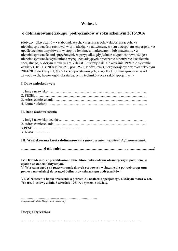 Wniosek o dofinansowanie zakupu podręczników w roku szkolnym 2015/2016 (dotyczy tylko uczniów • słabowidzących, • niesłyszących, • słabosłyszących, • z niepełnosprawnością ruchową, w tym afazją, • z autyzmem, w tym z zespołem Aspergera, • z upośledzeniem umysłowym w stopniu lekkim, umiarkowanym lub znacznym, • z niepełnosprawnościami sprzężonymi, w przypadku gdy jedną z niepełnosprawności jest niepełnosprawność wymieniona wyżej, posiadających orzeczenie o potrzebie kształcenia specjalnego, o którym mowa w art. 71b ust. 3 ustawy z dnia 7 września 1991 r. o systemie oświaty (Dz. U. z 2004 r. Nr 256, poz. 2572, z późn. zm.), uczęszczających w roku szkolnym 2014/2015 do klasy III, V i VI szkół podstawowych, klasy II i III gimnazjów oraz szkół zawodowych, liceów ogólnokształcących, , techników oraz szkół specjalnych) I. Dane wnioskodawcy: 1. Imię i nazwisko …………………………………………………….………………… 2. PESEL …………………………………………………………….………………….. 3. Adres zamieszkania ……………………………………………….………………….. 4. Numer telefonu …………………………………………………….…………………. II. Dane osobowe ucznia 1. Imię i nazwisko ucznia ……………………….………………………………………. 2. Adres zamieszkania …………………………………………………………………… 3.PESEL ……………………………….. 3. Klasa ………….. III. Wnioskowana kwota dofinansowania (dopuszczalna wysokość dofinansowania): ……….………zł (słownie: ……………………………………….……... …………………..) IV. Oświadczam, że przedstawione dane, które potwierdzam własnoręcznym podpisem, są zgodne ze stanem faktycznym. V. Wyrażam zgodę na przetwarzanie danych osobowych wyłącznie dla potrzeb programu pomocy materialnej dotyczącej dofinansowania zakupu podręczników. VI. W załączeniu kopia orzeczenia o potrzebie kształcenia specjalnego, o którym mowa w art. 71b ust. 3 ustawy z dnia 7 września 1991 r. o systemie oświaty. …………………………….. ……………………………. Miejscowość, data Podpis wnioskodawcy Decyzja Dyrektora ……………………………………………………………………………………….. Instrukcja 1. Wniosek należy złożyć w szkole do której uczęszcza uczeń najpóźniej do dnia 8 września 2015 r. 2. Maksymalną wartość pomocy obrazuje poniższa tabela: Typ szkoły Klasa Szkoła podstawowa I-II szkoła podstawowa III V-VI Szkoły Podstawowej uczeń z niepełnosprawnością 225 zł intelektualną w stopniu umiarkowanym lub znacznym Wszystkie rodzaje 325 zł niepełnosprawności z wyjątkiem niepełnosprawności intelektualnej w stopniu umiarkowanym lub znacznym II-III Wszystkie rodzaje niepełnosprawności z wyjątkiem niepełnosprawności intelektualnej w stopniu umiarkowanym i znacznym wszystkie klasy Wszystkie rodzaje niepełnosprawności z wyjątkiem niepełnosprawności intelektualnej w stopniu umiarkowanym i znacznym V-VI Szkoły Podstawowej gimnazjum zasadnicza szkoła zawodowa Wszystkie klasy technikum, liceum ogólnokształcące, Rodzaj niepełnosprawności Uczeń z niepełnosprawnością intelektualną w stopniu umiarkowanym lub znacznym nie korzystający z darmowego podręcznika Wszystkie rodzaje niepełnosprawności Wszystkie rodzaje niepełnosprawności z wyjątkiem niepełnosprawności intelektualnej w stopniu umiarkowanym i znacznym Kwota dofinansowania 175 zł 225 zł 350 zł 390 zł 445 zł