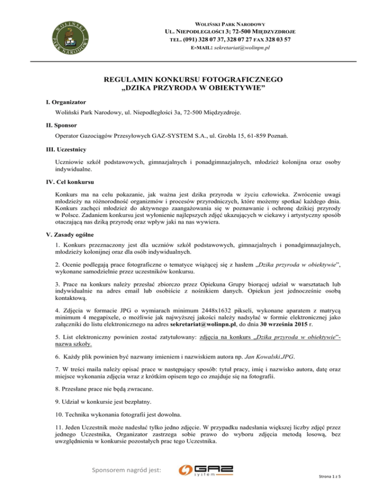 WOLIŃSKI PARK NARODOWY UL. NIEPODLEGŁOŚCI 3; 72-500 MIĘDZYZDROJE TEL. (091) 328 07 37, 328 07 27 FAX 328 03 57 E-MAIL: [email protected] REGULAMIN KONKURSU FOTOGRAFICZNEGO „DZIKA PRZYRODA W OBIEKTYWIE” I. Organizator Woliński Park Narodowy, ul. Niepodległości 3a, 72-500 Międzyzdroje. II. Sponsor Operator Gazociągów Przesyłowych GAZ-SYSTEM S.A., ul. Grobla 15, 61-859 Poznań. III. Uczestnicy Uczniowie szkół podstawowych, gimnazjalnych i ponadgimnazjalnych, młodzież kolonijna oraz osoby indywidualne. IV. Cel konkursu Konkurs ma na celu pokazanie, jak ważna jest dzika przyroda w życiu człowieka. Zwrócenie uwagi młodzieży na różnorodność organizmów i procesów przyrodniczych, które możemy spotkać każdego dnia. Konkurs zachęci młodzież do aktywnego zaangażowania się w poznawanie i ochronę dzikiej przyrody w Polsce. Zadaniem konkursu jest wyłonienie najlepszych zdjęć ukazujących w ciekawy i artystyczny sposób otaczającą nas dziką przyrodę oraz wpływ jaki na nas wywiera. V. Zasady ogólne 1. Konkurs przeznaczony jest dla uczniów szkół podstawowych, gimnazjalnych i ponadgimnazjalnych, młodzieży kolonijnej oraz dla osób indywidualnych. 2. Ocenie podlegają prace fotograficzne o tematyce wiążącej się z hasłem „Dzika przyroda w obiektywie”, wykonane samodzielnie przez uczestników konkursu. 3. Prace na konkurs należy przesłać zbiorczo przez Opiekuna Grupy biorącej udział w warsztatach lub indywidualnie na adres email lub osobiście z nośnikiem danych. Opiekun jest jednocześnie osobą kontaktową. 4. Zdjęcia w formacie JPG o wymiarach minimum 2448x1632 pikseli, wykonane aparatem z matrycą minimum 4 megapixele, o możliwie jak najwyższej jakości należy nadsyłać w formie elektronicznej jako załączniki do listu elektronicznego na adres [email protected], do dnia 30 września 2015 r. 5. List elektroniczny powinien zostać zatytułowany: zdjęcia na konkurs „Dzika przyroda w obiektywie”nazwa szkoły. 6. Każdy plik powinien być nazwany imieniem i nazwiskiem autora np. Jan Kowalski.JPG. 7. W treści maila należy opisać prace w następujący sposób: tytuł pracy, imię i nazwisko autora, datę oraz miejsce wykonania zdjęcia wraz z krótkim opisem tego co znajduje się na fotografii. 8. Przesłane prace nie będą zwracane. 9. Udział w konkursie jest bezpłatny. 10. Technika wykonania fotografii jest dowolna. 11. Jeden Uczestnik może nadesłać tylko jedno zdjęcie. W przypadku nadesłania większej liczby zdjęć przez jednego Uczestnika, Organizator zastrzega sobie prawo do wyboru zdjęcia metodą losową, bez uwzględnienia w konkursie pozostałych prac tego Uczestnika. Sponsorem nagród jest: Strona 1 z 5 WOLIŃSKI PARK NARODOWY UL. NIEPODLEGŁOŚCI 3; 72-500 MIĘDZYZDROJE TEL. (091) 328 07 37, 328 07 27 FAX 328 03 57 E-MAIL: [email protected] 12. Fotografie, na których będą znajdować się jakiekolwiek oznaczenia, cyfry (np. daty) będą dyskwalifikowane. 13. Organizator nie ponosi odpowiedzialności za zgłoszenia, które dotarły po terminie nadsyłania prac lub nie dotarły do niego z przyczyn od niego niezależnych, m.in. wskutek awarii komputera, łączy internetowych czy systemu operacyjnego. VI. Zasady szczegółowe 1. Udział w Konkursie jest jednoznaczny z udzieleniem Wolińskiemu Parkowi Narodowemu prawa do korzystania z autorskich praw majątkowych do każdego z Utworów przekazanych w ramach Konkursu na następujących polach eksploatacji: 1) utrwalanie i zwielokrotnianie Utworów: wytwarzanie egzemplarzy techniką drukarską oraz techniką cyfrową na nośnikach danych i w komputerach; zapisywanie; konwertowanie; kopiowanie; 2) wprowadzenie do pamięci komputera w celu przygotowania Utworów do publikacji; 3) wprowadzenie do pamięci serwera w celu udostępniania Utworów w wewnętrznej sieci Licencjobiorcy; 4) wprowadzanie zwielokrotnionych egzemplarzy Utworów do obrotu; 5) archiwizowanie Utworów, przechowywanie na nośnikach danych, w pamięci komputera, serwera; 6) publiczne wystawienie, wyświetlenie, odtworzenie, udostępnianie Utworów w taki sposób, aby każdy mógł mieć do nich dostęp w miejscu i w czasie przez siebie wybranym; 7) wykorzystanie wybranych Utworów na stronie internetowej Wolińskiego Parku Narodowego; 8) korzystanie z fragmentów fotografii pod warunkiem, że nie będą one zniekształcone; 9) stworzenia prezentacji multimedialnej z wykorzystaniem Utworów; 10) opatrzenia fotografii podpisami, dodanie do nich podkładu dźwiękowego. 2. Licencja ma charakter niewyłączny i uprawnia do korzystania z Utworów przez Licencjobiorcę bez ograniczeń terytorialnych. 3. Licencja udzielona jest nieodpłatnie i na czas nieokreślony. 4. Licencja obejmuje prawa zależne. 5. Licencja na korzystanie z Utworów obejmuje prawo Licencjobiorcy do powierzenia utrwalania lub zwielokrotniania Utworu osobom trzecim w celach związanych z działalnością Wolińskiego Parku Narodowego. 6. Uczestnicy konkursu, rodzice lub opiekunowie prawni dziecka zgadzają się na piśmie (załącznik nr 1 do regulaminu) na opublikowanie imienia, nazwiska, wieku dziecka oraz udzielają zgody na korzystanie z utworów na ww. polach eksploatacji i udzielenie licencji na ww. warunkach. Osoby znajdujące się na zdjęciach również składają pisemne oświadczenia, że wyrażają zgodę na publikację zdjęć (załącznik nr 2 do regulaminu). Bez wyżej wymienionych załączników prace fotograficzne nie będą brały udziału w konkursie. 7. Oświadczenia powinny zostać dostarczone indywidualnie lub zbiorczo przez opiekuna grupy biorącej udział w warsztatach. Dostarczyć należy je osobiście lub pocztą tradycyjną na adres Wolińskiego Parku Narodowego, ul. Niepodległości 3a, 72-500 Międzyzdroje do dnia 30 września 2015 r., przy czym dla zachowania tego terminu wymagany jest wpływ do tego dnia do godziny 15:00 oświadczeń w sekretariacie WPN. 8. W wypadku naruszenia praw autorskich, majątkowy