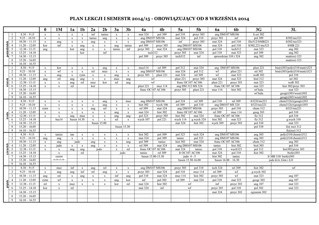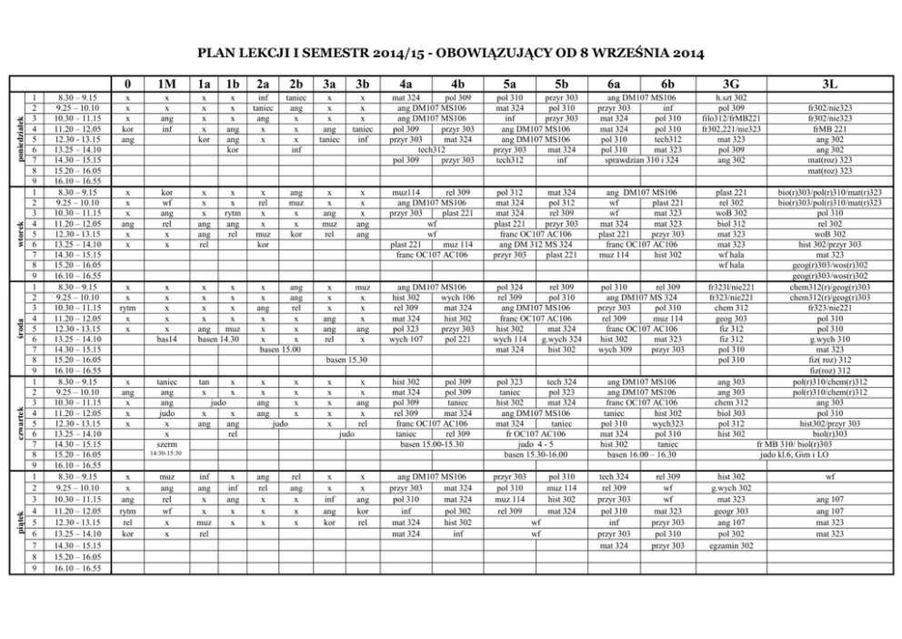 piątek czwartek środa wtorek poniedziałek PLAN LEKCJI I SEMESTR 2014/15 - OBOWIĄZUJĄCY OD 8 WRZEŚNIA 2014 1 2 3 4 5 6 7 8 9 1 2 3 4 5 6 7 8 9 1 2 3 4 5 6 7 8 9 1 2 3 4 5 6 7 8 9 1 2 3 4 5 6 7 8 9 8.30 – 9.15 9.25 – 10.10 10.30 – 11.15 11.20 – 12.05 12.30 - 13.15 13.25 – 14.10 14.30 – 15.15 15.20 – 16.05 16.10 – 16.55 8.30 – 9.15 9.25 – 10.10 10.30 – 11.15 11.20 – 12.05 12.30 - 13.15 13.25 – 14.10 14.30 – 15.15 15.20 – 16.05 16.10 – 16.55 8.30 – 9.15 9.25 – 10.10 10.30 – 11.15 11.20 – 12.05 12.30 - 13.15 13.25 – 14.10 14.30 – 15.15 15.20 – 16.05 16.10 – 16.55 8.30 – 9.15 9.25 – 10.10 10.30 – 11.15 11.20 – 12.05 12.30 - 13.15 13.25 – 14.10 14.30 – 15.15 15.20 – 16.05 16.10 – 16.55 8.30 – 9.15 9.25 – 10.10 10.30 – 11.15 11.20 – 12.05 12.30 - 13.15 13.25 – 14.10 14.30 – 15.15 15.20 – 16.05 16.10 – 16.55 0 1M 1a 1b 2a 2b 3a 3b x x x kor ang x x ang inf x x x x kor x x x ang ang kor inf taniec ang x x taniec ang x x x inf x x x ang taniec x x x taniec inf mat 324 pol 309 ang DM107 MS106 ang DM107 MS106 pol 309 przyr 303 przyr 303 mat 324 tech312 pol 309 przyr 303 pol 310 przyr 303 mat 324 pol 310 inf przyr 303 ang DM107 MS106 ang DM107 MS106 przyr 303 mat 324 tech312 inf ang DM107 MS106 przyr 303 inf mat 324 pol 310 mat 324 pol 310 pol 310 tech312 pol 310 mat 323 sprawdzian 310 i 324 h.szt 302 pol 309 filo312/frMB221 fr302,221/nie323 mat 323 pol 309 ang 302 x x x ang x x kor wf ang rel x x x x x ang ang rel x x rytm ang rel x rel x x muz kor ang muz x x kor x x ang muz rel x x x ang ang muz114 rel 309 ang DM107 MS106 przyr 303 plast 221 wf wf plast 221 muz 114 franc OC107 AC106 pol 312 mat 324 mat 324 pol 312 mat 324 rel 309 plast 221 przyr 303 franc OC107 AC106 ang DM 312 MS 324 przyr 303 plast 221 ang DM107 MS106 wf plast 221 wf mat 323 mat 324 mat 323 plast 221 przyr 303 franc OC107 AC106 muz 114 hist 302 plast 221 rel 302 woB 302 biol 312 mat 323 mat 323 wf hala wf hala x x rytm x x x x x x x bas14 x ang x ang ang rel x x x x x x basen 15.00 x x x ang ang rel muz x x x ang x ang DM107 MS106 hist 302 wych 106 rel 309 mat 324 mat 324 hist 302 pol 323 przyr 303 wych 107 pol 221 pol 324 rel 309 rel 309 pol 310 ang DM107 MS106 franc OC107 AC106 hist 302 mat 324 wych 114 g.wych 324 mat 324 hist 302 pol 310 rel 309 ang DM107 MS 324 przyr 303 pol 310 rel 309 muz 114 franc OC107 AC106 hist 302 mat 323 wych 309 przyr 303 x x ang x rel hist 302 pol 309 mat 324 pol 309 pol 309 taniec rel 309 mat 324 franc OC107 AC106 taniec rel 309 basen 15.00-15.30 pol 323 tech 324 taniec pol 323 hist 302 mat 324 ang DM107 MS106 mat 324 taniec fr OC107 AC106 judo 4 - 5 basen 15.30-16.00 ang DM107 MS106 ang DM107 MS106 franc OC107 AC106 taniec hist 302 pol 310 wych323 mat 324 pol 310 hist 302 taniec basen 16.00 – 16.30 bio(r)303/pol(r)310/mat(r)323 bio(r)303/pol(r)310/mat(r)323 pol 310 rel 302 woB 302 hist 302/przyr 303 mat 323 geog(r)303/wos(r)302 geog(r)303/wos(r)302 fr323l/nie221 chem312(r)/geog(r)303 fr323/nie221 chem312(r)/geog(r)303 chem 312 fr323/nie221 geog 303 pol 310 fiz 312 pol 310 fiz 312 g.wych 310 pol 310 mat 323 pol 310 fiz( roz) 312 fiz(roz) 312 ang 303 pol(r)310/chem(r)312 ang 303 pol(r)310/chem(r)312 chem 312 ang 303 biol 303 pol 310 pol 312 hist302/przyr 303 hist 302 biol(r)303 fr MB 310/ biol(r)303 judo kl.6, Gim i LO x x ang kor rel ang DM107 MS106 przyr 303 mat 324 pol 310 mat 324 inf pol 302 mat 324 hist 302 mat 324 inf przyr 303 pol 310 muz 114 rel 309 tech 324 rel 309 przyr 303 pol 310 inf przyr 303 mat 324 hist 302 g.wych 302 mat 323 geogr 303 ang 107 pol 302 egzamin 302 x x x x x x x x ang muz basen 14.30 4a 4b 5a 5b 6a 6b basen 15.30 x ang x x x taniec ang ang judo x x szerm tan x x x judo x ang x ang rel x x ang ang x x x x judo x x x x x judo 14:30-15:30 x x ang rytm rel kor muz ang rel wf x x inf ang x x muz rel x inf ang x x ang rel x x x rel ang x x x x x inf ang kor pol 310 muz 114 hist 302 mat 324 wf wf rel 309 wf wf mat 323 przyr 303 pol 310 przyr 303 3G 3L fr302/nie323 fr302/nie323 frMB 221 ang 302 ang 302 mat(roz) 323 mat(roz) 323 wf ang 107 ang 107 mat 323 mat 323