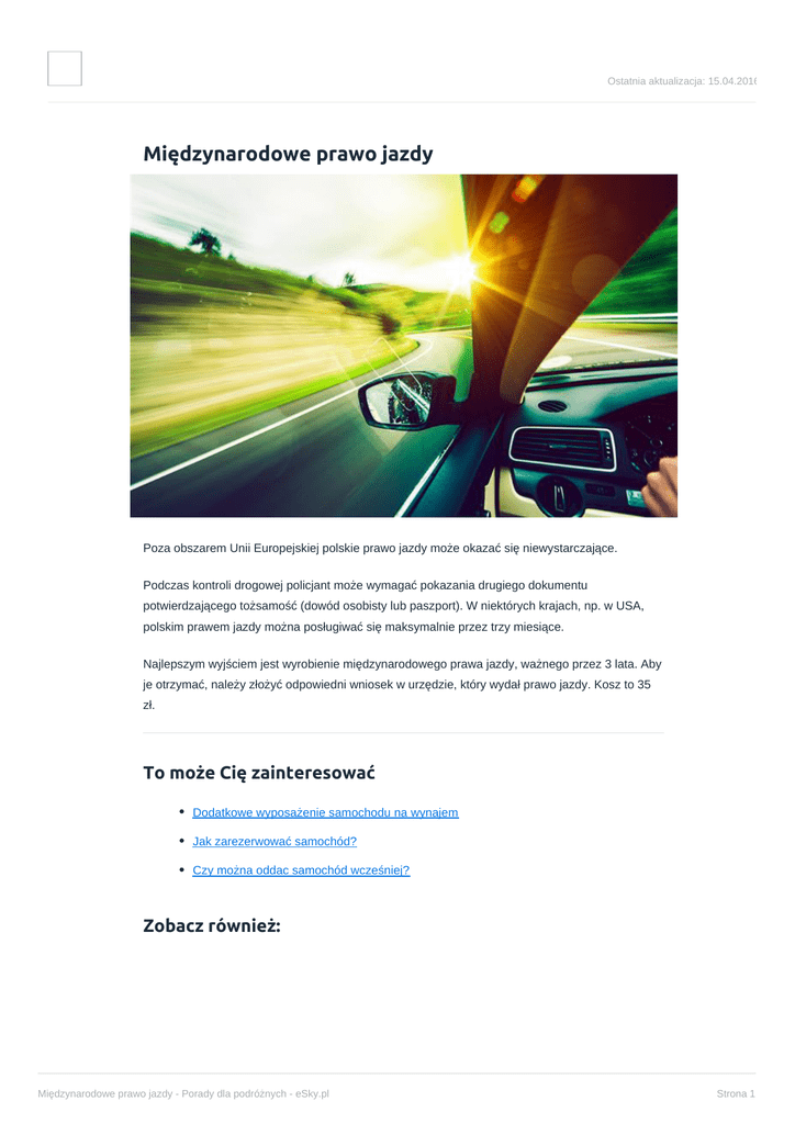Ostatnia aktualizacja: 15.04.2016 Międzynarodowe prawo jazdy Poza obszarem Unii Europejskiej polskie prawo jazdy może okazać się niewystarczające. Podczas kontroli drogowej policjant może wymagać pokazania drugiego dokumentu potwierdzającego tożsamość (dowód osobisty lub paszport). W niektórych krajach, np. w USA, polskim prawem jazdy można posługiwać się maksymalnie przez trzy miesiące. Najlepszym wyjściem jest wyrobienie międzynarodowego prawa jazdy, ważnego przez 3 lata. Aby je otrzymać, należy złożyć odpowiedni wniosek w urzędzie, który wydał prawo jazdy. Kosz to 35 zł. To może Cię zainteresować Dodatkowe wyposażenie samochodu na wynajem Jak zarezerwować samochód? Czy można oddac samochód wcześniej? Zobacz również: Międzynarodowe prawo jazdy - Porady dla podróżnych - eSky.pl Strona 1 Międzynarodowe prawo jazdy - Porady dla podróżnych - eSky.pl Strona 2