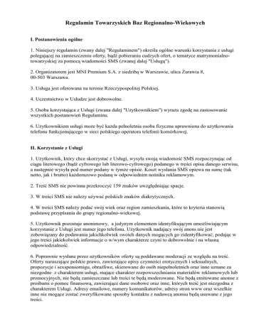 Regulamin Towarzyskich Baz Regionalno-Wiekowych I. Postanowienia ogólne 1. Niniejszy regulamin (zwany dalej "Regulaminem") określa ogólne warunki korzystania z usługi polegającej na zamieszczeniu oferty, bądź pobieraniu cudzych ofert, o tematyce matrymonialnotowarzyskiej za pomocą wiadomości SMS (zwanej dalej "Usługą"). 2. Organizatorem jest MNI Premium S.A. z siedzibą w Warszawie, ulica Żurawia 8, 00-503 Warszawa. 3. Usługa jest oferowana na terenie Rzeczypospolitej Polskiej. 4. Uczestnictwo w Usłudze jest dobrowolne. 5. Osoba korzystająca z Usługi (zwana dalej "Użytkownikiem") wyraża zgodę na zastosowanie wszystkich postanowień Regulaminu. 6. Użytkownikiem usługi może być każda pełnoletnia osoba fizyczna uprawniona do użytkowania telefonu funkcjonującego w sieci polskiego operatora telefonii komórkowej. II. Korzystanie z Usługi 1. Użytkownik, który chce skorzystać z Usługi, wysyła swoją wiadomość SMS rozpoczynając od ciągu literowego (bądź cyfrowego lub literowo-cyfrowego) podanego w treści opisu danego serwisu, a następnie wysyła pod numer podany w tymże opisie. Koszt wysłania SMS opiewa na sumę (tak netto, jak i brutto) każdorazowo podaną w odpowiednim nośniku reklamowym. 2. Treść SMS nie powinna przekroczyć 159 znaków uwzględniając spacje. 3. W treści SMS nie należy używać polskich znaków diakrytycznych. 4. W treści SMS należy podać swój wiek oraz region zamieszkania, które to kryteria stanowią podstawę przypisania do grupy regionalno-wiekowej. 5. Użytkownik pozostaje anonimowy, a jedynym elementem identyfikującym umożliwiającym korzystanie z Usługi jest numer jego telefonu. Użytkownik nadający swój anons nie jest zobowiązany do podawania jakichkolwiek swoich danych mogących go zidentyfikować; podając w jego treści jakiekolwiek informacje o w/wym charakterze czyni to dobrowolnie i na własną odpowiedzialność. 6. Poprawnie wysłane przez użytkowników oferty są poddawane moderacji ze względu na treść. Oferty naruszające polskie prawo, zawierające opisy czynności erotycznych i seksualnych, propozycje i sexsponsornigu, obraźliwe, skierowane do osób niepełnoletnich oraz inne uznane za niezgodne z charakterem usługi, mające charakter rozpowszechniania materiałów reklamowych lub promocyjnych, nie będą zamieszczane lub treści te będą moderowane. Nie będą emitowane anonse z prośbami o pomoc finansową, zawierające dane osobowe oraz inne, których treść jest niezgodna z charakterem Usługi. Adresy emailowe, numery komunikatorów, adresy stron www oraz wszelkie inne nie mogące zostać zweryfikowane sposoby kontaktu z nadawcą anonsu będą usuwane z jego treści. 7. Użytkownik, który chce skorzystać z usługi i otrzymać treści ofert (wraz z kontaktami, którymi są numery telefonów komórkowych, z których nadano ofertę) z interesującej go grupy regionalnowiekowej, wysyła wiadomość SMS o treści określonej w materiale reklamowym. Zwrotnie Użytkownik otrzymuje losowo wybraną/wybrane przez komputer ofertę/oferty wraz kontaktami do nich. Liczba otrzymanych ofert uzależniona jest od rodzaju serwisu i jest określona w odpowiednim materiale reklamowym. 8. Czas przez jaki nadana oferta znajduje się w określonej puli ofert wiekowo-regionalnych uzależniony jest od rotacji anonsów, jaka ma miejsce w danej kategorii regionalno-wiekowej. 9. Kontaktem do oferty jest numer telefonu, z którego oferta została nadana. Inne podane w treści anonsu numery telefonów nie są uwzględniane. 10. Organizator zastrzega sobie prawo do zablokowania dostępu do Usługi Użytkownikowi, który narusza postanowienia niniejszego Regulaminu, obowiązujące prawo lub ogólnie przyjęte normy moralne. III. Postanowienia końcowe 1. Usługa jest dostępna w sieciach polskich operatorów telefonii komórkowej (T-Mobile, Plus GSM, Orange, P4), zarówno w systemie prepaid, jak i postpaid (abonamentowym). Do korzystania z Usługi nie mają zastosowania ulgi dla grup abonentów na opłaty abonamentowe oraz usługi dodatkowe. 2. Organizator dołoży wszelkich starań w celu zapewnienia prawidłowego działania Usługi. 3. Użytkownik wysyłający anons do bazy matrymonialno-towarzyskiej określonego teletekstu wyraża jednocześnie zgodę na jego zamieszczenie w innych serwisach o charakterze matrymonialnotowarzyskim należących do Organizatora. 4. Wysyłając swój SMS Użytkownik wyraża jednocześnie zgodę na otrzymywanie od Organizatora wiadomości aktywizująco-informacyjnych oraz przetwarzanie jego numeru telefonu (rozumianego jako dana osobowa). 5. Organizator nie ponosi odpowiedzialności za: a) treść wiadomości SMS wysyłanych przez Użytkownika w ramach korzystania z Usługi, b) nie umieszczenie anonsu w bazie matrymonialno-towarzyskiej lub nie wysłanie cudzych ofert, jeśli Użytkownik nadał swój SMS w sposób niezgodny z tym, który określony jest w ofercie, c) korzystanie z Usługi przez osoby niepołnoletnie oraz osoby nieuprawnione do użytkowania telefonu komórkowego, d) szkody spowodowane nieprawidłowym korzystaniem przez Użytkownika z Usługi, e) za sytuacje, w których osoba pobierająca kontakt do anonsu nie jest w stanie nawiązać kontaktu z osobą anons zamieszczającą lub za sytuację, w której anons został przez osobę go zamieszczającą wycofany, f) element przypadkowości związany tak z losowym mechanizmem wybierania ofert, które są odsyłane Użytkownikowi je pobierającemu, jak i z sytuacjami, w których jeden Użytkownik nadaje swój anons wielokrotnie, przez co istnieje możliwość wielokrotnego otrzymania jednobrzmiącej oferty, g) ewentualny dyskomfort psychiczno-moralny, jaki może zostać potencjalnie wywołany poprzez treści otrzymywanych ofert, h) problemy w funkcjonowaniu Usługi, jeżeli nastąpiły one wskutek zdarzeń, których Organizator przy zachowaniu należytej staranności nie był w stanie przewidzieć, lub którym nie mógł zapob