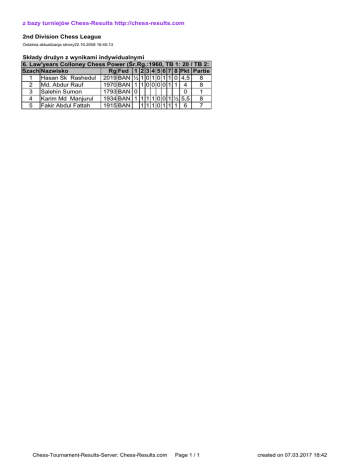 z bazy turniejów Chess-Results http://chess-results.com 2nd Division Chess League Ostatnia aktualizacja strony22.10.2008 16:45:13 Składy drużyn z wynikami indywidualnymi 6. Law'years Colloney Chess Power (Śr.Rg.:1960, TB 1: 20 / TB 2: 12) Szach Nazwisko Rg Fed 1 2 3 4 5 6 7 8 Pkt Partie 1 Hasan Sk Rashedul 2019 BAN ½ 1 0 1 0 1 1 0 4,5 8 2 Md. Abdur Rauf 1970 BAN 1 1 0 0 0 0 1 1 4 8 3 Salehin Sumon 1793 BAN 0 0 1 4 Karim Md Manjurul 1934 BAN 1 1 1 1 0 0 1 ½ 5,5 8 5 Fakir Abdul Fattah 1915 BAN 111011 1 6 7 Chess-Tournament-Results-Server: Chess-Results.com Page 1 / 1 created on 07.03.2017 18:42 Informacje o zawodniku Hasan Sk Rashedul 2019 BAN Rp:1810 Rd SNr Nazwisko 1 127 Moshtafa Manzur 2 86 Md. Abu Hanif 3 149 Mohammed Mainuddin 4 53 Abul Kalam Azad 5 70 Chowdhury Shamsul Kabir 6 132 Hasan Mostafa Razibul 7 121 Md. Mazharul Islam Rubel 8 18 Islam Obaidul Shahin Md. Abdur Rauf 1970 BAN Rp:1852 Rd SNr Nazwisko 1 128 Khan Mokaddesur Rahman 2 87 Md. Haroon Or Rashid 3 150 Kabir Md Sirazul 4 54 Bikas Ranjan Das 5 71 Siddique Arman Mithu 6 133 S.M. Kotaiba Biplob 7 122 Mizanur Rahman Sabuj 8 19 Majumder Ahmed Hossain Salehin Sumon 1793 BAN Rp:0 Rd SNr Nazwisko 1 155 Moshtafa Mahbub Shaki Karim Md Manjurul 1934 BAN Rp:1829 Rd SNr Nazwisko 1 129 Kushol Mukhopadyay 2 89 Md. Kamrul Hasan 3 151 Kabir Shajahan 4 55 Md Quamruzzaman Khan Imran 5 72 Abdullah Al-Saif 6 134 Noman Kh Shibli 7 123 Shamim Hossain 8 21 S. M. Sharon Fakir Abdul Fattah 1915 BAN Rp:2040 Rd SNr Nazwisko 2 90 Md. Mokter Hossain 3 152 Md. Rashel 4 56 Sheik Mizanur Rahman Mizan 5 74 Gyusuddin Mithu 6 135 Sheik Md Abdul Muttalib 7 124 Md. Zahid 8 159 Mohammed Salim Rg Fed 0 BAN 0 BAN 2043 BAN 0 BAN 2004 BAN 2047 BAN 1813 BAN 2026 BAN Pkt 6,5 3 4 4 4 5 2,5 5,5 Wyn. Szach w½ 1 s1 1 s0 1 w1 1 s0 1 w1 1 s1 1 w0 1 Rg Fed 1882 BAN 0 BAN 1999 BAN 1970 BAN 2089 BAN 2028 BAN 0 BAN 2047 BAN Pkt 5,5 4,5 5 3,5 5 6 3 5,5 Wyn. Szach s1 2 w1 2 w0 2 s0 2 w0 2 s0 2 w1 2 s1 2 Rg Fed Pkt Wyn. Szach 1933 BAN 5 w 0 3 Rg Fed 0 BAN 0 BAN 2006 BAN 1929 BAN 2021 BAN 1946 BAN 0 BAN 0 BAN Pkt 0 1,5 4,5 4,5 7,5 6 4,5 6,5 Wyn. Szach s1 4 s1 3 s1 3 w1 3 s0 3 w0 3 s1 3 w½ 3 Rg Fed 0 BAN 2067 BAN 0 BAN 2018 BAN 1913 BAN 0 BAN 1917 BAN Pkt 3 3,5 1,5 5 4 2 4 Wyn. Szach w1 4 w1 4 s1 4 w0 4 s1 4 w1 4 s1 4 Chess-Tournament-Results-Server: Chess-Results.com Page 1 / 1 created on 07.03.2017 18:42 Pary na szachownicach 1. Runda w dniu 2008/10/15 o 4:00 Szach 5 Law'years Colloney Chess Power 5/1 Hasan, Sk Rashedul (w) 5/2 Md. Abdur, Rauf (b) 5/3 Salehin, Sumon (w) 5/4 Karim, Md Manjurul (b) 2. Runda w dniu 2008/10/16 o 4:00 Szach 24 Dania Power Chess Club 6/1 Md. Abu, Hanif (w) 6/2 Md. Haroon Or, Rashid (b) 6/3 Md. Kamrul, Hasan (w) 6/4 Md. Mokter, Hossain (b) 3. Runda w dniu 2008/10/17 o 4:00 Szach 1 Tangail Chess Power 2/1 Mohammed, Mainuddin (w) 2/2 Kabir, Md Sirazul (b) 2/3 Kabir, Shajahan (w) 2/4 Md. Rashel, (b) 4. Runda w dniu 2008/10/18 o 4:00 Szach 5 Law'years Colloney Chess Power 4/1 Hasan, Sk Rashedul (w) 4/2 Md. Abdur, Rauf (b) 4/3 Karim, Md Manjurul (w) 4/4 Fakir, Abdul Fattah (b) 5. Runda w dniu 2008/10/19 o 4:00 Szach 2 Bangladesh Muktijuddah Sangsad K.C. 2/1 Chowdhury, Shamsul Kabir (w) 2/2 Siddique, Arman Mithu (b) 2/3 Abdullah, Al-Saif (w) 2/4 Gyusuddin, Mithu (b) 6. Runda w dniu 2008/10/20 o 4:00 Szach 5 Law'years Colloney Chess Power 5/1 Hasan, Sk Rashedul (w) 5/2 Md. Abdur, Rauf (b) 5/3 Karim, Md Manjurul (w) 5/4 Fakir, Abdul Fattah (b) 7. Runda w dniu 2008/10/21 o 4:00 Szach 20 Dhaka University Chess Club Red 5/1 Md. Mazharul Islam, Rubel (w) 5/2 Mizanur Rahman, Sabuj (b) 5/3 Shamim, Hossain (w) 5/4 Md. Zahid, (b) 8. Runda w dniu 2008/10/22 o 4:00 Szach 5 Law'years Colloney Chess Power 2/1 Hasan, Sk Rashedul (w) 2/2 Md. Abdur, Rauf (b) 2/3 Karim, Md Manjurul (w) 2/4 Fakir, Abdul Fattah (b) - 14 Dhaka University Chess Club Green Moshtafa, Manzur (b) Khan, Mokaddesur Rahman (w) Moshtafa Mahbub, Shaki (b) Kushol, Mukhopadyay (w) 2½:1½ ½-½ 1-0 0-1 1-0 - 5 Law'years Colloney Chess Power Hasan, Sk Rashedul (b) Md. Abdur, Rauf (w) Karim, Md Manjurul (b) Fakir, Abdul Fattah (w) 0:4 0-1 0-1 0-1 0-1 - 5 Law'years Colloney Chess Power Hasan, Sk Rashedul (b) Md. Abdur, Rauf (w) Karim, Md Manjurul (b) Fakir, Abdul Fattah (w) 2:2 1-0 1-0 0-1 0-1 - 12 Habgonj Chess Club Abul Kalam, Azad (b) Bikas, Ranjan Das (w) Md Quamruzzaman Khan, Imran (b) Sheik Mizanur Rahman, Mizan (w) 3:1 1-0 0-1 1-0 1-0 - 5 Law'years Colloney Chess Power Hasan, Sk Rashedul (b) Md. Abdur, Rauf (w) Karim, Md Manjurul (b) Fakir, Abdul Fattah (w) 4:0 1-0 1-0 1-0 1-0 - 4 Rajshahi Daba Unnoyon Sangastha Hasan, Mostafa Razibul (b) S.M. Kotaiba, Biplob (w) Noman, Kh Shibli (b) Sheik, Md Abdul Muttalib (w) 2:2 1-0 0-1 0-1 1-0 - 5 Law'years Colloney Chess Power Hasan, Sk Rashedul (b) Md. Abdur, Rauf (w) Karim, Md Manjurul (b) Fakir, Abdul Fattah (w) 0:4 0-1 0-1 0-1 0-1 - 6 Jobs Vandar. Com Islam, Obaidul Shahin (b) Majumder, Ahmed Hossain (w) S. M. Sharon, (b) Mohammed, Salim (w) 2½:1½ 0-1 1-0 ½-½ 1-0 You find all details to this tournament under http://chess-results.com/tnr16727.aspx?lan=3 Chess-Tournament-Results-Server: Chess-Results Chess-Tournament-Results-Server: Chess-Results.com Page 1 / 1 created on 07.03.2017 18:42
