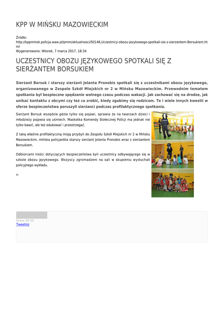 KPP W MIŃSKU MAZOWIECKIM Źródło: http://kppminsk.policja.waw.pl/pmm/aktualnosci/50146,Uczestnicy-obozu-jezykowego-spotkali-sie-z-sierzantem-Borsukiem.ht ml Wygenerowano: Wtorek, 7 marca 2017, 18:34 UCZESTNICY OBOZU JĘZYKOWEGO SPOTKALI SIĘ Z SIERŻANTEM BORSUKIEM Sierżant Borsuk i starszy sierżant Jolanta Pronobis spotkali się z uczestnikami obozu językowego, organizowanego w Zespole Szkół Miejskich nr 2 w Mińsku Mazowieckim. Przewodnim tematem spotkania był bezpieczne spędzanie wolnego czasu podczas wakacji. Jak zachować się na drodze, jak unikać kontaktu z obcymi czy też co zrobić, kiedy zgubimy się rodzicom. Te i wiele innych kwestii w sferze bezpieczeństwa poruszyli sierżanci podczas profilaktycznego spotkania. Sierżant Borsuk wszędzie gdzie tylko się pojawi, sprawia że na twarzach dzieci i młodzieży pojawia się uśmiech. Maskotka Komendy Stołecznej Policji ma jednak nie tylko bawić, ale też edukować i przestrzegać. Z taką właśnie profilaktyczną misją przybyli do Zespołu Szkół Miejskich nr 2 w Mińsku Mazowieckim, mińska policjantka starszy sierżant Jolanta Pronobis wraz z sierżantem Borsukiem. Odbiorcami treści dotyczących bezpieczeństwa byli uczestnicy odbywającego się w szkole obozu językowego. Wszyscy zgromadzeni na sali w skupieniu wysłuchali policyjnego wykładu. dn Ocena: 0/5 (0) Tweetnij