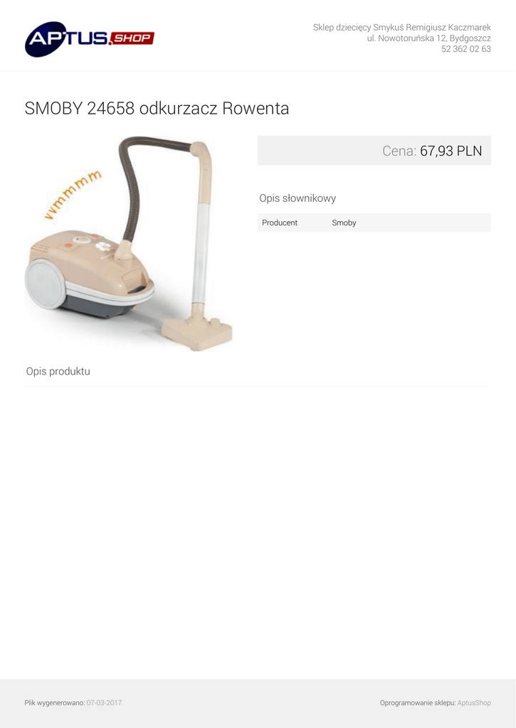 Sklep dziecięcy Smykuś Remigiusz Kaczmarek ul. Nowotoruńska 12, Bydgoszcz 52 362 02 63 SMOBY 24658 odkurzacz Rowenta Cena: 67,93 PLN Opis słownikowy Producent Smoby Opis produktu Plik wygenerowano: 07-03-2017 Powered by TCPDF (www.tcpdf.org) Oprogramowanie sklepu: AptusShop