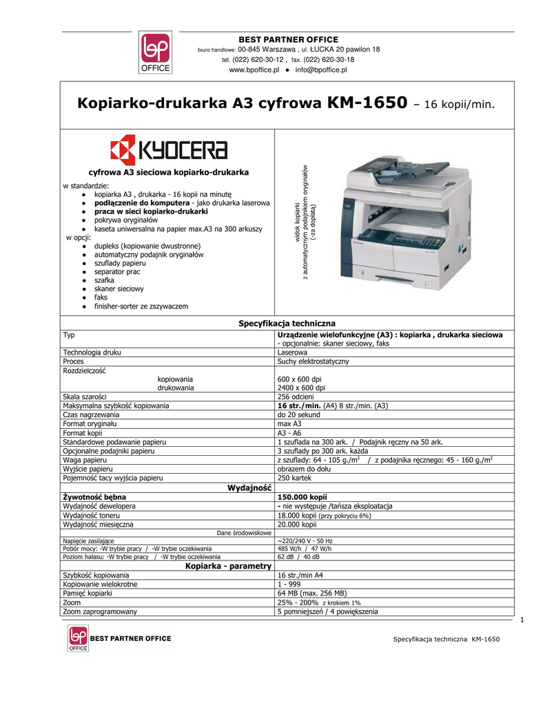 biuro handlowe: 00-845 Warszawa , ul. ŁUCKA 20 pawilon 18 tel. (022) 620-30-12 , fax. (022) 620-30-18 www.bpoffice.pl ● [email protected] cyfrowa A3 sieciowa kopiarko-drukarka w standardzie: ● kopiarka A3 , drukarka - 16 kopii na minutę ● podłączenie do komputera - jako drukarka laserowa ● praca w sieci kopiarko-drukarki ● pokrywa oryginałów ● kaseta uniwersalna na papier max.A3 na 300 arkuszy w opcji: ● dupleks (kopiowanie dwustronne) ● automatyczny podajnik oryginałów ● szuflady papieru ● separator prac ● szafka ● skaner sieciowy ● faks ● finisher-sorter ze zszywaczem – 16 kopii/min. widok kopiarki z automatycznym podajnikiem oryginałów (-za dopłatą) Kopiarko-drukarka A3 cyfrowa KM-1650 Specyfikacja techniczna Typ Urządzenie wielofunkcyjne (A3) : kopiarka , drukarka sieciowa - opcjonalnie: skaner sieciowy, faks Laserowa Suchy elektrostatyczny Technologia druku Proces Rozdzielczość kopiowania drukowania 600 x 600 dpi 2400 x 600 dpi 256 odcieni 16 str./min. (A4) 8 str./min. (A3) do 20 sekund max A3 A3 - A6 1 szuflada na 300 ark. / Podajnik ręczny na 50 ark. 3 szuflady po 300 ark. każda z szuflady: 64 - 105 g./m2 / z podajnika ręcznego: 45 - 160 g./m2 obrazem do dołu 250 kartek Skala szarości Maksymalna szybkość kopiowania Czas nagrzewania Format oryginału Format kopii Standardowe podawanie papieru Opcjonalne podajniki papieru Waga papieru Wyjście papieru Pojemność tacy wyjścia papieru Wydajność Żywotność bębna Wydajność dewelopera Wydajność toneru Wydajność miesięczna 150.000 kopii - nie występuje /tańsza eksploatacja 18.000 kopii (przy pokryciu 6%) 20.000 kopii Dane środowiskowe Napięcie zasilające Pobór mocy: -W trybie pracy / -W trybie oczekiwania Poziom hałasu: -W trybie pracy / -W trybie oczekiwania ~220/240 V - 50 Hz 485 W/h / 47 W/h 62 dB / 40 dB Kopiarka - parametry Szybkość kopiowania Kopiowanie wielokrotne Pamięć kopiarki Zoom Zoom zaprogramowany 16 str./min A4 1 - 999 64 MB (max. 256 MB) 25% - 200% z krokiem 1% 5 pomniejszeń / 4 powiększenia 1 Specyfikacja techniczna KM-1650 biuro handlowe: 00-845 Warszawa , ul. ŁUCKA 20 pawilon 18 tel. (022) 620-30-12 , fax. (022) 620-30-18 www.bpoffice.pl ● [email protected] Kopiarko-drukarka A3 cyfrowa KM-1650 Czas pierwszej kopii Rozdzielczość kopiowania Wymiary (szer. x głęb. x wys.) Waga – 16 kopii/min. 5,9 sek. 600 x 600 dpi 574 x 593 x 545 mm. 42 kg. Kopiarka - funkcje Jeden skan-wiele kopii Kilka kopii na jednej kartce Kopiowanie dwustronne Sortowanie elektroniczne Sortowanie rotacyjne Kopiowanie rotacyjne Tryb ekonomiczny Autostart Automatyczny wybór papieru Automatyczny wybór zoom Przesuwanie marginesu Wybielanie brzegów Tryb nadzoru / wydruk utajniony / kody dostępu Sygnalizacja dźwiękowa Tak (z automat. podajnikiem oryginałów) Tak Tak, opcja Tak Tak - z opcjonalną kasetą PF-410 Tak Tak Tak Tak Tak Tak Tak Tak - 100 kodów użytkownika Tak Drukarka sieciowa (w standardzie) Prędkość drukowania Czas pierwszego wydruku Pamięć Rozdzielczość Zgodne systemy operacyjne 16 str./min. 5,5 sek. 64 MB (max. 320 MB) 2400 x 600 dpi Microsoft Windows 95/98/ME , Microsoft Windows NT/2000/XP Apple Macintosh OS 9.x/10.x , UNIX/Linux równoległy - IEEE1284, USB 2.0 , Ethernet 10Base-T/10Base-Tx IBP ProPrinter , Diablo 630 , Epson LQ-850 , PCL6, PostScript 3 Interfejsy standardowe Emulacja OPCJE DP-410 Dwustronny podajnik oryginałów Rozmiar dokumentów A5R - A3 Gramatura papieru 45 - 160 g./m2 Pojemność 50 kartek rozmiaru A4 (80 g./m2) DU-410 Dupleks (kopiowanie dwustronne) Typ Pojemność Format papieru Gramatura papieru Jednokartkowy Bez limitu A5 - A3 64 - 80 g./m2 PF-410 Dodatkowa kaseta na papier (max. 3) Pojemność 300 arkuszy Format papieru A5 - A3 Gramatura papieru 64 - 105 g./m2 DF-410 Finiszer-sorter (ze zszywaczem) Typ Pojemność Format papieru Zszywacz wewnętrzny 500 arkuszy B5 - A3 jednopozycyjny, 30 arkuszy JS-410 Separator prac Typ wewnętrzny Pojemność 100 arkuszy Scan System (F) skaner sieciowy Funkcje skanowanie do PC, do e-mail, TWAIN 2 Specyfikacja techniczna KM-1650 biuro handlowe: 00-845 Warszawa , ul. ŁUCKA 20 pawilon 18 tel. (022) 620-30-12 , fax. (022) 620-30-18 www.bpoffice.pl ● [email protected] Kopiarko-drukarka A3 cyfrowa KM-1650 Prędkość skanowania Rozdzielczość Interfejs Protokół sieciowy Format obrazu – 16 kopii/min. 20 str. / min. 200, 300, 400, 600 dpi 10 / 100 Base-Tx TCP/IP PDF , TIFF Fax System (L) moduł faksu Prędkość modemu Prędkość transmisji Kompresja Faks sieciowy 33,6 kpbs 2 sek. JBIG , MMR , MR , MH tak, wymagany Scan System (F) Pamięć opcjonalna 16 , 32 , 64 , 128 , 256 MB Microdrive karta do przechowywania danych, czcionek, informacji itp. Interfejsy dodatkowe IB-11 IB-21E SB-50 SB-60 SB-70 SB-80 SB-110FX SB-140 interfejs szeregowy RS-232C druga karta sieciowa 10/100 Base-TX karta sieciowa 10 Base-FL, Fiberlink karta sieciowa TokenRing STP/UTP karta sieciowa IEEE 802.11B Wireless LAN drugi port równoległy IEEE 1284 karta sieciowa10/100Base-TX/100Base-FX FiberOptic karta sieciowa 10/100Base-TX/10Base-2 Szafka podstawa kopiarki na kółkach 3 Specyfikacja techniczna KM-1650