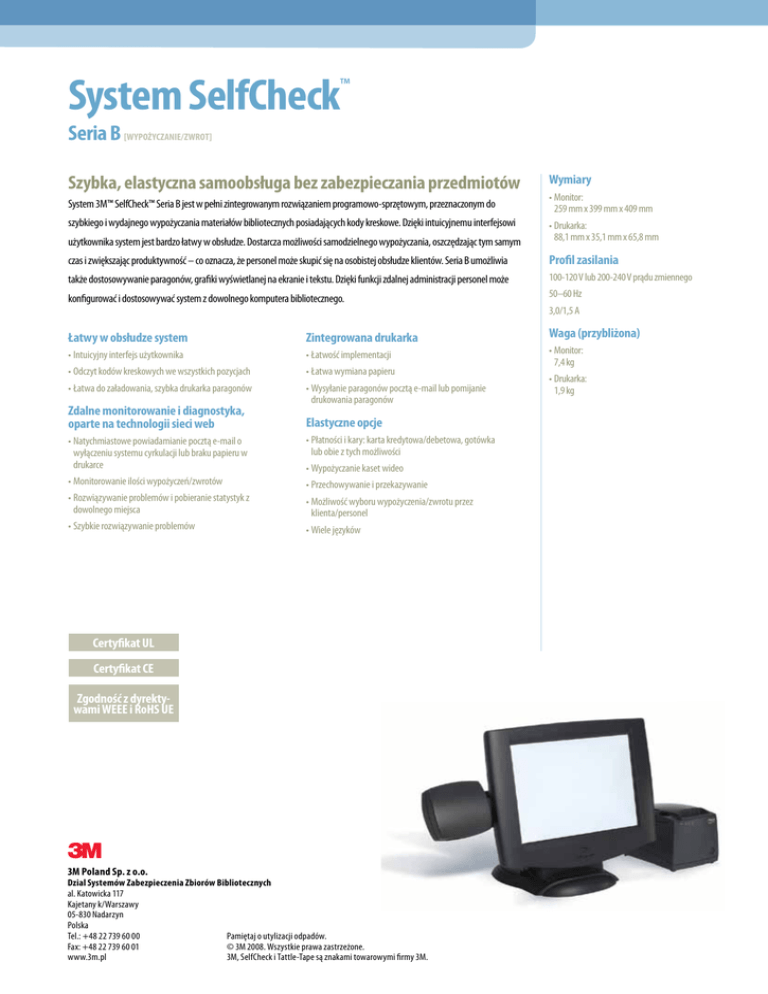 System SelfCheck ™ Seria B [WYPOŻYCZANIE/ZWROT] Szybka, elastyczna samoobsługa bez zabezpieczania przedmiotów System 3M™ SelfCheck™ Seria B jest w pełni zintegrowanym rozwiązaniem programowo-sprzętowym, przeznaczonym do szybkiego i wydajnego wypożyczania materiałów bibliotecznych posiadających kody kreskowe. Dzięki intuicyjnemu interfejsowi Wymiary •Monitor: 259 mm x 399 mm x 409 mm użytkownika system jest bardzo łatwy w obsłudze. Dostarcza możliwości samodzielnego wypożyczania, oszczędzając tym samym •Drukarka: 88,1 mm x 35,1 mm x 65,8 mm czas i zwiększając produktywność – co oznacza, że personel może skupić się na osobistej obsłudze klientów. Seria B umożliwia Profil zasilania także dostosowywanie paragonów, grafiki wyświetlanej na ekranie i tekstu. Dzięki funkcji zdalnej administracji personel może 100-120 V lub 200-240 V prądu zmiennego konfigurować i dostosowywać system z dowolnego komputera bibliotecznego. 50–60 Hz Łatwy w obsłudze system Zintegrowana drukarka Waga (przybliżona) •Intuicyjny interfejs użytkownika •Łatwość implementacji •Odczyt kodów kreskowych we wszystkich pozycjach •Łatwa wymiana papieru •Łatwa do załadowania, szybka drukarka paragonów •Wysyłanie paragonów pocztą e-mail lub pomijanie drukowania paragonów Zdalne monitorowanie i diagnostyka, oparte na technologii sieci web Elastyczne opcje •Natychmiastowe powiadamianie pocztą e-mail o wyłączeniu systemu cyrkulacji lub braku papieru w drukarce •Płatności i kary: karta kredytowa/debetowa, gotówka lub obie z tych możliwości •Monitorowanie ilości wypożyczeń/zwrotów • Przechowywanie i przekazywanie • Rozwiązywanie problemów i pobieranie statystyk z dowolnego miejsca • Możliwość wyboru wypożyczenia/zwrotu przez klienta/personel • Szybkie rozwiązywanie problemów • Wiele języków • Wypożyczanie kaset wideo Certyfikat UL Certyfikat CE Zgodność z dyrektywami WEEE i RoHS UE 3 3M Poland Sp. z o.o. Dzial Systemów Zabezpieczenia Zbiorów Bibliotecznych al. Katowicka 117 Kajetany k/Warszawy 05-830 Nadarzyn Polska Tel.: +48 22 739 60 00 Pamiętaj o utylizacji odpadów. Fax: +48 22 739 60 01 © 3M 2008. Wszystkie prawa zastrzeżone. www.3m.pl 3M, SelfCheck i Tattle-Tape są znakami towarowymi firmy 3M. 3,0/1,5 A •Monitor: 7,4 kg •Drukarka: 1,9 kg