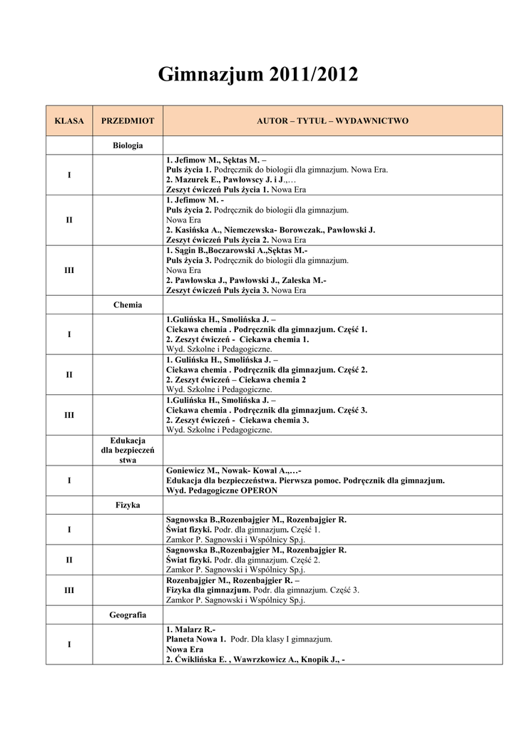 Gimnazjum 2011/2012 KLASA PRZEDMIOT AUTOR – TYTUŁ – WYDAWNICTWO Biologia 1. Jefimow M., Sęktas M. – Puls życia 1. Podręcznik do biologii dla gimnazjum. Nowa Era. 2. Mazurek E., Pawłowscy J. i J.,… Zeszyt ćwiczeń Puls życia 1. Nowa Era 1. Jefimow M. Puls życia 2. Podręcznik do biologii dla gimnazjum. Nowa Era 2. Kasińska A., Niemczewska- Borowczak., Pawłowski J. Zeszyt ćwiczeń Puls życia 2. Nowa Era 1. Sągin B.,Boczarowski A.,Sęktas M.Puls życia 3. Podręcznik do biologii dla gimnazjum. Nowa Era 2. Pawłowska J., Pawłowski J., Zaleska M.Zeszyt ćwiczeń Puls życia 3. Nowa Era I II III Chemia 1.Gulińska H., Smolińska J. – Ciekawa chemia . Podręcznik dla gimnazjum. Część 1. 2. Zeszyt ćwiczeń - Ciekawa chemia 1. Wyd. Szkolne i Pedagogiczne. 1. Gulińska H., Smolińska J. – Ciekawa chemia . Podręcznik dla gimnazjum. Część 2. 2. Zeszyt ćwiczeń – Ciekawa chemia 2 Wyd. Szkolne i Pedagogiczne. 1.Gulińska H., Smolińska J. – Ciekawa chemia . Podręcznik dla gimnazjum. Część 3. 2. Zeszyt ćwiczeń - Ciekawa chemia 3. Wyd. Szkolne i Pedagogiczne. I II III Edukacja dla bezpieczeń stwa Goniewicz M., Nowak- Kowal A.,…Edukacja dla bezpieczeństwa. Pierwsza pomoc. Podręcznik dla gimnazjum. Wyd. Pedagogiczne OPERON I Fizyka Sagnowska B.,Rozenbajgier M., Rozenbajgier R. Świat fizyki. Podr. dla gimnazjum. Część 1. Zamkor P. Sagnowski i Wspólnicy Sp.j. Sagnowska B.,Rozenbajgier M., Rozenbajgier R. Świat fizyki. Podr. dla gimnazjum. Część 2. Zamkor P. Sagnowski i Wspólnicy Sp.j. Rozenbajgier M., Rozenbajgier R. – Fizyka dla gimnazjum. Podr. dla gimnazjum. Część 3. Zamkor P. Sagnowski i Wspólnicy Sp.j. I II III Geografia I 1. Malarz R.Planeta Nowa 1. Podr. Dla klasy I gimnazjum. Nowa Era 2. Ćwiklińska E. , Wawrzkowicz A., Knopik J., - Zeszyt ćwiczeń. Planeta Nowa 1. Nowa Era 1. Szczypiński D., Wojtowicz M.Planeta Nowa 2. Podr. dla II klasy gimnazjum. Nowa Era 2. Ćwiklińska E. , Knopik J., Wawrzkowicz A. Zeszyt ćwiczeń. Planeta Nowa 2. Nowa Era 1. Szubert M.Planeta Nowa 3 Podr. dla III klasy gimnazjum. Nowa Era 2. Ćwiklińska E. , Wawrzkowicz A., Knopik J., Zeszyt ćwiczeń. Planeta Nowa 3. Nowa Era II III Historia Kowalewski K., Kąkolewski I., Plumińska – Mieloch A. – Bliżej historii 1. Podręcznik dla klasy I gimnazjum. Wyd. Szkolne i Pedagogiczne Kowalewski K., Kąkolewski I., Plumińska – Mieloch A. – Bliżej historii 2 Podręcznik dla klasy II gimnazjum. Wyd. Szkolne i Pedagogiczne Kąkolewski I., Kowalewski K., Plumińska – Mieloch A. – Bliżej historii 3. Podręcznik dla klasy III gimnazjum. Wyd. Szkolne i Pedagogiczne I II III Informatyka Gurbiel E., Hardt-Olejniczak G., Kołczyk E., Krupicka H., Sysło M. – Informatyka. Podręcznik dla gimnazjum. WSiP S.A. I – III Język angielski Freebairn, Bygrave J. UpBeat 2. Elementary. Podręcznik i ćwiczenia. Pearson Longman Freebairn, Bygrave J. UpBeat 3. Pre-intermediate. Podręcznik i ćwiczenia Pearson Longman Rosińska M., Śpiewak G. – Egzamin gimnazjalny. Repetytorium z testami. MACMILLAN. I II III Język francuski Samson C.Amis et compagnie 1. Poziom zaawansowania A1. Wydawnictwo Nowela. Samson C.Amis et compagnie 2. Poziom zaawansowania A1/A2. Wydawnictwo Nowela. Samson C.Amis et compagnie 2. Poziom zaawansowania A1/A2. Wydawnictwo Nowela. I II III Język niemiecki Motta G.Magnet 1. Podr. i książka ćwiczeń dla gimnazjum. Kurs podstawowy Poziom A1. LektorKlett. Motta G.Magnet 2. Podręcznik + książka ćwiczeń dla gimnazjum. Kurs podstawowy . Poziom A1. LektorKlett. Motta G.Magnet 3. Podręcznik + książka ćwiczeń dla gimnazjum. Kurs podstawowy . Poziom A1. LektorKlett. I II III Język polski 1. Chmiel M., Herman W., Pomirska Z., Doroszewski P.Słowa na czasie. Podr. do kształcenia literackiego i kulturowego dla klasy I gimnazjum. Nowa Era. 2. Grabarczyk A.Słowa na czasie. Podr. do kształcenia językowego z ćwiczeniami dla klasy pierwszej gimnazjum. Nowa Era. 1. Chmiel M., Herman W., Pomirska Z., Doroszewski P.Słowa na czasie. Podr. do kształcenia literackiego i kulturowego dla klasy II gimnazjum. Nowa Era. 2. Grabarczyk A.Słowa na czasie. Podr. do kształcenia językowego z ćwiczeniami dla klasy drugiej gimnazjum. Nowa Era 1. Chmiel M., Herman W., Pomirska Z., Doroszewski P.Słowa na czasie. Podr. do kształcenia literackiego i kulturowego dla klasy III gimnazjum. Nowa Era. 2. Grabarczyk A.Słowa na czasie. Podr. do kształcenia językowego z ćwiczeniami dla klasy trzeciej gimnazjum. Nowa Era I II III Matematyka Bolałek Z., Dobrowolska M., Jucewicz M.,…Matematyka z plusem. Matematyka 1. Podr. dla klasy I. GWO M. Dobrowolska Sp.j. Wyd. po roku 2009 Bolałek Z., Dobrowolska M., Jucewicz M.,…Matematyka z plusem. Matematyka 2. Podr. dla klasy II. G W O M. Dobrowolska Sp.j. Wyd. po roku 2009 Bolałek Z., Dobrowolska M., Jucewicz M.,…Matematyka z plusem. Matematyka 3. Podr. dla klasy III. G W O M. Dobrowolska Sp.j. Wyd. po czerwcu 2011 roku I II III Muzyka Wójcik T.Muzyczny świat. Podręcznik i ćwiczenia do nowej podstawy programowej MAC Edukacja wyd. od 2009 r I Plastyka Gumuła J.W tym cała sztuka. Podręcznik do plastyki w gimnazjum MAC Edukacja II Religia W moim kościele. Wyd. Jedność W miłości Ojca Wyd. Jedność W życiu i w prawdzie Wyd. Jedność I II III Zajęcia techniczne Białka U.Zajęcia techniczne. Podręcznik dla gimnazjum. OPERON II - III WOS I Janicka I., Kucia A., Maćkowski T.Dziś i jutro. Wiedza o społeczeństwie. Podr. z ćwiczeniami dla klas gimnazjum. Część 1. Nowa Era. II Janicka I., Kucia A., Maćkowski T.Dziś i jutro. Wiedza o społeczeństwie. Podr. z ćwiczeniami dla klas gimnazjum. Część 2. Nowa Era.