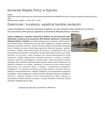 Komenda Miejska Policji w Rybniku Źródło: http://www.rybnik.slaska.policja.gov.pl/k22/informacje/wiadomosci/54669,Dzielnicowi-i-kuratorzy-wspolnie-bardziej-skuteczni. html Wygenerowano: Wtorek, 7 marca 2017, 18:34 Dzielnicowi i kuratorzy- wspólnie bardziej skuteczni Lepsza współpraca i wymiana informacji to główny cel, jaki postawili sobie dzielnicowi, kuratorzy oraz pracownicy OPS podczas spotkania w Komendzie Miejskiej Policji w Rybniku. Lepsza współpraca i wymiana informacji to główny cel, jaki postawili sobie dzielnicowi, kuratorzy oraz pracownicy OPS podczas spotkania w Komendzie Miejskiej Policji w Rybniku. Dla efektywniejszej pracy kuratorów, dzielnicowych i pracowników pomocy społecznej ważna jest dobra współpraca i przepływ informacji pomiędzy wszystkimi stronami. Wczoraj Pierwszy Zastępca Komendanta Miejskiego Policji w Rybniku mł.insp.dr Paweł Zając zaprosił do rybnickiej komendy sędziów, kuratorów Zespołu Kuratorskiej Służby d/s Karnych, przedstawicieli OPS oraz komendantów komisariatów i kierowników rewirów dzielnicowych. Było to już kolejne spotkanie w tym gronie. Celem inicjatywy jest ochrona pokrzywdzonych przez stanowczą i szybką reakcję wobec sprawców przemocy w rodzinie, uprzednio skazanych przez sąd i pozostających w okresie próby, często pod dozorem kuratora sądowego, którzy ponownie dokonują aktów przemocy wobec swoich najbliższych. Na spotkaniu omówiono m.in.zasady współpracy w stosunku do osób, wobec których wykonywane jest orzeczenie sądu, w związku z popełnieniem przestępstw, polegających na stosowaniu przemocy lub groźby karalnej. Działanie takie ma zwiększyć bezpieczeństwo ofiar i zapobiec popełnianiu przez dozorowanych kolejnych przestępstw. Lepsza współpraca to przede wszystkim łatwiejszy dostęp do niezbędnych informacji i regularny kontakt na linii kurator-dzielnicowy. Mamy nadzieję, że wypracowane zasady pozwolą na szybką, a przede wszystkim skuteczną reakcję wszystkich współpracujących służb. Zainstaluj wtyczkę Flash, aby zobaczyć odtwarzacz. pobierz film - 4.69 MB Ocena: 0/5 (0) Tweetnij