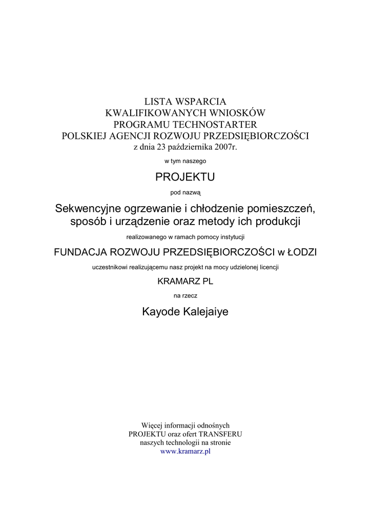 LISTA WSPARCIA KWALIFIKOWANYCH WNIOSKÓW PROGRAMU TECHNOSTARTER POLSKIEJ AGENCJI ROZWOJU PRZEDSIĘBIORCZOŚCI z dnia 23 października 2007r. w tym naszego PROJEKTU pod nazwą Sekwencyjne ogrzewanie i chłodzenie pomieszczeń, sposób i urządzenie oraz metody ich produkcji realizowanego w ramach pomocy instytucji FUNDACJA ROZWOJU PRZEDSIĘBIORCZOŚCI w ŁODZI uczestnikowi realizującemu nasz projekt na mocy udzielonej licencji KRAMARZ PL na rzecz Kayode Kalejaiye Więcej informacji odnośnych PROJEKTU oraz ofert TRANSFERU naszych technologii na stronie www.kramarz.pl W ramach programu „Wsparcie na rozwój Technostarterów i dla Technostarterów” do Polskiej Agencji Rozwoju Przedsiębiorczości wpłynęły 44 wnioski. Po ocenie formalnej i kwalifikacyjnej, do wsparcia zakwalifikowało się 40 wniosków: Lp. Nazwa Instytucji Tytuł Projektu 1 FUNDACJA ROZWOJU PRZEDSIĘBIORCZOŚCI ŁÓDŹ Sekwencyjne ogrzewanie i chłodzenie pomieszczeń, sposób i urządzenie oraz metody ich produkcji 2 3 4 FUNDACJA ROZWOJU PRZEDSIĘBIORCZOŚCI ŁÓDŹ FUNDACJA ROZWOJU PRZEDSIĘBIORCZOŚCI ŁÓDŹ FUNDACJA ROZWOJU PRZEDSIĘBIORCZOŚCI ŁÓDŹ Celulozowy materiał opatrunkowy - CelMat Modelina samoutwardzalna Osłonka termiczna 5 FUNDACJA ROZWOJU PRZEDSIĘBIORCZOŚCI ŁÓDŹ Nowa technologia oczyszczania spalin z głębokim odzyskiem ciepła od silnie zawilgoconych spalin powstałych w suszarniach bądź w spalarniach osadów pościekowych bądź spalarniach stałych odpadów komunalnych 6 ODDZIAŁ TERENOWY STOWARZYSZENIA "WOLNA PRZEDSIĘBIORCZOŚĆ" ŚWIDNICA Technologia produkcji kształtek masy włókienniczej 7 ODDZIAŁ TERENOWY STOWARZYSZENIA "WOLNA PRZEDSIĘBIORCZOŚĆ" ŚWIDNICA Systemy lokalizacji, identyfikacji i antykolizacji na bazie technologii RFID 8 ODDZIAŁ TERENOWY STOWARZYSZENIA "WOLNA PRZEDSIĘBIORCZOŚĆ" ŚWIDNICA System wymiany plików nowej generacji Chomik 9 ODDZIAŁ TERENOWY STOWARZYSZENIA "WOLNA PRZEDSIĘBIORCZOŚĆ" ŚWIDNICA Projektowanie interfejsów uŜytkownika w systemach informatycznych 10 11 PONADREGIONALNA FSNT NOT SŁUPSK PONADREGIONALNA FSNT NOT SŁUPSK 12 PONADREGIONALNA FSNT NOT SŁUPSK Urządzenie serowarskie Łącznik profili kasetonowych Nowa metoda i urządzenie do nauki za pomocą skojarzeń parami 13 14 ŚWIĘTOKRZYSKIE CENTRUM INNOWACJI I TRANFSFERU TECHNOLOGII KIELCE ŚWIĘTOKRZYSKIE CENTRUM INNOWACJI I TRANFSFERU TECHNOLOGII KIELCE Otwarty portal internetowy Przenośne urządzenie oczyszczające powietrze-Cair 15 ŚWIĘTOKRZYSKIE CENTRUM INNOWACJI I TRANFSFERU TECHNOLOGII KIELCE Polimerobetonowy na bazie produktów pozyskiwanych w procesie oczyszczania ropy naftowej oraz innych odpadów stałych 16 ŚWIĘTOKRZYSKIE CENTRUM INNOWACJI I TRANFSFERU TECHNOLOGII KIELCE LogiCom 17 ŚWIĘTOKRZYSKIE CENTRUM INNOWACJI I TRANFSFERU TECHNOLOGII KIELCE Rozszerzenie metodyki trzech zbiorów (MTZ) jako nowe narzędzie kompleksowej realizacji polityki jakości RZESZOWSKA AGENCJA ROZWOJU REGIONALNEGO RZESZOWSKA AGENCJA ROZWOJU REGIONALNEGO Autonomiczne systemy hybrydowe pozyskiwania energii odnawialnej 18 19 Sieć digital signage 20 21 22 23 24 25 CENTRUM TRANSFERU TECHNOLOGII POLITECHNIKA KRAKOWSKA CENTRUM TRANSFERU TECHNOLOGII POLITECHNIKA KRAKOWSKA CENTRUM TRANSFERU TECHNOLOGII POLITECHNIKA KRAKOWSKA AGENCJA ROZWOJU REGIONALNEGO BIELSKO-BIAŁA AGENCJA ROZWOJU REGIONALNEGO BIELSKO-BIAŁA AGENCJA ROZWOJU REGIONALNEGO BIELSKO-BIAŁA Bio-Sensory do szybkiej diagnostyki czynników patogennych dla zastosowań bio-medycznych i farmaceutycznych Projektowanie i budowa systemów światłowodowych w infrastrukturze ciepłowniczej Uruchomienie produkcji elektronicznych analizatorów kondycji oleju D.O.C.Test Kominkowy wkład wędzący "CONVERTER" - telefoniczny system tłumaczeniowy Uniwersalny kompleks strzelniczy do treningu 26 AGENCJA ROZWOJU REGIONALNEGO "MARR" MIELEC Implementacja nowoczesnych metod diagnostycznych oraz rehabilitacyjnych konstrukcji Ŝelbetonowych na rynku polskim 27 AGENCJA ROZWOJU REGIONALNEGO "MARR" MIELEC Tworzenie laboratorium badawczo-projektowego dla zastosowań nowych technik pomiarowych, analitycznych i konstrukcyjnych w obszarze procesów elektrotermicznych 28 AGENCJA ROZWOJU REGIONALNEGO "MARR" MIELEC Recykling sprzętu elektronicznego 29 AGENCJA ROZWOJU REGIONALNEGO "MARR" MIELEC Tworzenie informatycznych systemów detekcyjnoanalitycznych do określania struktury wewnętrznej obiektów, na podstawie ich obrazów termograficznych 30 AGENCJA ROZWOJU REGIONALNEGO "MARR" MIELEC Kontener antygrawitacyjny i płaszcz antygrawitacyjny 31 BEŁCHATOWSKO KLESZCZOWSKI PARK PRZEMYSŁOWO TECHNOLOGICZNY BEŁCHATÓW WdroŜenie do sprzedaŜy systemu zarządzania szkołą/przedszkolem z wykorzystaniem aplikacji na komórki GSM i przeglądarki internetowe 32 BEŁCHATOWSKO KLESZCZOWSKI PARK PRZEMYSŁOWO TECHNOLOGICZNY BEŁCHATÓW WdroŜenie do sprzedaŜy kompleksowego systemu zarządzania zakładem z wykorzystaniem aplikacji na telefony komórkowe 33 BEŁCHATOWSKO KLESZCZOWSKI PARK PRZEMYSŁOWO TECHNOLOGICZNY BEŁCHATÓW WdroŜenie do sprzedaŜy kompleksowego systemu zarządzania zakładem z wykorzystaniem aplikacji na telefony komórkowe 34 BEŁCHATOWSKO KLESZCZOWSKI PARK PRZEMYSŁOWO TECHNOLOGICZNY BEŁCHATÓW Platforma wiedzy - najlepsze produkty i usługi w swoich kategoriach 35 BEŁCHATOWSKO KLESZCZOWSKI PARK PRZEMYSŁOWO TECHNOLOGICZNY BEŁCHATÓW Zmniejszenie zuŜycia substancji szkodliwych w przemyśle poligraficznym 36 37 38 39 40 AKADEMICKIE INKUBATORY PRZEDSIĘBIORCZOŚCI WARSZAWA AKADEMICKIE INKUBATORY PRZEDSIĘBIORCZOŚCI WARSZAWA AKADEMICKIE INKUBATORY PRZEDSIĘBIORCZOŚCI WARSZAWA AKADEMICKIE INKUBATORY PRZEDSIĘBIORCZOŚCI WARSZAWA AKADEMICKIE INKUBATORY PRZEDSIĘBIORCZOŚCI WARSZAWA Urządzenie do korygowania danych nawigacyjnych systemu GPS Kompresor obrazów medycznych DICOM-J2K Zestaw do samodzielnej kontroli diety w leczeniu cukrzycy w warunkach domowych Innowacyjne narzędzie do telepracy świadczone w modelu SaaS Serwis internetowy automatycznie