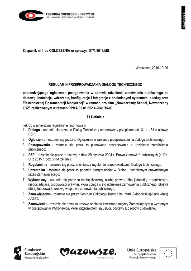 WWW.COI.PL Załącznik nr 1 do OGŁOSZENIA nr sprawy: DT/1/2016/MS Warszawa, 2016-10-26 REGULAMIN PRZEPROWADZANIA DIALOGU TECHNICZNEGO poprzedzającego ogłoszenie postępowania w sprawie udzielenia zamówienia publicznego na dostawę, instalację, wdrożenie, konfigurację i integrację z posiadanymi systemami e-usług oraz Elektronicznej Dokumentacji Medycznej” w ramach projektu „Nowoczesny Szpital, Nowoczesny ZOZ” realizowanym w ramach RPMA.02.01.01-14-2641/15-00 §1 Definicje Ilekroć w niniejszym regulaminie jest mowa o: 1. Dialogu - rozumie się przez to Dialog Techniczny unormowany przepisami art. 31 a - 31 c ustawy PZP; 2. Ogłoszeniu - rozumie się przez to Ogłoszenie o zamiarze przeprowadzenia dialogu technicznego; 3. Postępowaniu - rozumie się przez to planowane postępowanie o udzielenie zamówienia publicznego; 4. PZP - rozumie się przez to ustawę z dnia 29 stycznia 2004 r. Prawo zamówień publicznych (tj. Dz. U. z 2015 r. poz. 2164 ze zm.); 5. Regulaminie - rozumie się przez to niniejszy regulamin przeprowadzania Dialogu technicznego; 6. Uczestniku - rozumie się przez to podmiot biorący udział w Dialogu technicznym prowadzonym przez Zamawiającego; 7. Wykonawcy - rozumie się przez to osobę fizyczną, osobę prawną albo jednostkę organizacyjną nieposiadającą osobowości prawnej, która ubiega się o udzielenie zamówienia publicznego, złożyła ofertę lub zawarła umowę w sprawie zamówienia publicznego; 8. Zamawiającym - rozumie się przez Centrum Onkologii- Instytut im. Marii Skłodowskiej-Curie (dalej „CO-I”); 9. Zamówieniu - rozumie się przez to umowę odpłatną zawieraną między Zamawiającym a wybranym w postępowaniu Wykonawcą, której przedmiotem są usługi, dostawy lub roboty budowlane. 1. Regulamin określa zasady prowadzenia przez Zamawiaj ącego Dialogu technicznego, poprzedzającego postępowanie o udzielenie zamówienia publicznego. 2. Wybór Wykonawcy Zamówienia zostanie dokonany w trakcie odr ębnego postępowania prowadzonego na podstawie przepisów ustawy PZP. 3. Dialog prowadzony jest na podstawie i zgodnie z art. 31 a - 31 c ustawy PZP. 4. Dialog prowadzi się w sposób zapewniający zachowanie zasady przejrzysto ści, uczciwej konkurencji oraz równego traktowania Uczestników i oferowanych przez nich rozwi ązań. 5. Wszelkie czynności, o których mowa w niniejszym Regulaminie, w imieniu i na rzecz Zamawiającego wykonuje osoba lub osoby wyznaczone w tym celu przez Zamawiaj ącego. §3 Przedmiot Dialogu Technicznego 1. Zamawiający przed wszczęciem postępowania może przeprowadzić Dialog Techniczny, zwracając się o: a. doradztwo; b. udzielenie informacji technicznej i użytkowej; c. prezentacja działającego oprogramowania w siedzibie Zamawiającego, d. omówienie zarządzania bezpieczeństwem informacji, które mają posłużyć Zamawiającemu do przygotowania Opisu Przedmiotu Zamówienia, Specyfikacji Istotnych Warunków Zamówienia i określenia warunków umowy w sprawie zamówienia. 2. Przedmiotem Dialogu Technicznego mogą być w szczególności: a. zagadnienia techniczne, technologiczne, zwi ązane z bezpieczeństwem przetwarzania i gromadzenia dokumentacji medycznej, prawne, wykonawcze, organizacyjne, handlowe, ekonomiczne oraz logistyczne, zwi ązane z realizacją zamówienia zgodnie z potrzebami Zamawiającego; b. oszacowanie wartości Zamówienia; c. najnowsze, najkorzystniejsze, najtańsze oraz najlepsze rozwiązania techniczne, technologiczne, prawne, wykonawcze, organizacyjne, handlowe, ekonomiczne oraz logistyczne w dziedzinie będącej przedmiotem Zamówienia; d. prezentacje działającego oprogramowania w siedzibie Zamawiającego; e. zebranie informacji służących do opracowania dokumentacji Zamówienia. §4 Ogłoszenie o zamiarze przeprowadzenia Dialogu Technicznego 1. Zamawiający zamieszcza Ogłoszenie o Zamiarze Przeprowadzenia Dialogu Technicznego oraz o jego przedmiocie na swojej stronie internetowej. Zamawiający może również opublikować dodatkowe Ogłoszenie w wybranej przez siebie formie. 2. W Ogłoszeniu Zamawiający wskazuje w szczególno ści: a. przedmiot zamówienia i cel prowadzenia Dialogu; b. zakres informacji, które chce uzyskać Zamawiający; WWW.COI.PL §2 Zakres Regulaminu przeprowadzenia Dialogu Technicznego 3. 4. 5. 6. §5 Organizacja Dialogu technicznego 1. Zamawiający zaprosi do Dialogu Technicznego Uczestników, którzy z łożą prawidłowo sporządzone, w języku polskim ZGŁOSZENIE do udziału w Dialogu Technicznym oraz ewentualnie dodatkowe oświadczenia, stanowiska lub dokumenty, których Zamawiaj ący zażąda w Ogłoszeniu, w terminie i w trybie w nim wskazanym, który nie może być krótszy niż 7 dni od publikacji Ogłoszenia o zamiarze przeprowadzenia Dialogu Technicznego. 2. Zamawiający w Ogłoszeniu o zamiarze przeprowadzenia Dialogu Technicznego mo że określić WZÓR ZGŁOSZENIA do udziału w Dialogu Technicznym. 3. Uczestnicy zaproszeni do udzia łu w Dialogu Technicznym zostaną poinformowani o tym fakcie przez Zamawiającego, w sposób określony w treści niniejszego Regulaminu. 4. Zamawiający nie jest zobowiązany do prowadzenia Dialogu Technicznego w okre ślonej formie ze wszystkimi Uczestnikami oraz może decydować o różnych formach Dialogu z różnymi Uczestnikami, w zależności od merytorycznej treści stanowisk przedstawionych przez Uczestników w związku z Dialogiem, z poszanowaniem zasad przejrzysto ści, uczciwej konkurencji i równego traktowania Uczestników. 5. Zamawiający komunikuje się z Uczestnikami za pomocą korespondencji wysłanej na podany przez Uczestnika adres do korespondencji, faks lub adres poczty elektronicznej. Potwierdzeniem doręczenia korespondencji wys łanej w drodze: a. pisemnej (za pośrednictwem operatora pocztowego) - jest potwierdzenie dor ęczenia korespondencji adresatowi; b. faksu - jest raport z jego transmisji; c. elektronicznej - jest data wskazana w elektronicznym potwierdzeniu odbioru k