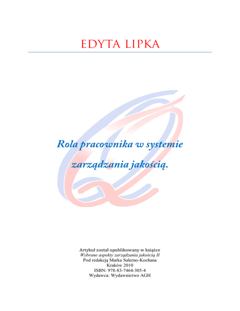 Artykuł został opublikowany w książce Wybrane aspekty zarządzania jakością II Pod redakcją Marka Salerno-Kochana Kraków 2010 ISBN: 978-83-7464-305-4 Wydawca: Wydawnictwo AGH Wstęp Skuteczność działań projakościowych wszystkich organizacji, a w szczególności tych, które mają wdrożony system zarządzania jakością, zależy w dużym stopniu od osób w nich zatrudnionych, czyli pracowników, których można określić mianem klientów wewnętrznych. Pracownicy biorą udział w procesach przetwarzania składników wejściowych w gotowe wyjściowe wyroby lub usługi. Bezbłędne wykonanie pracy przez klienta wewnętrznego powoduje, że produkt finalny, cechujący się wysoką jakością trafia do klienta zewnętrznego i wywołuje u niego zadowolenie. Klient wewnętrzny w organizacji Na prawidłowe funkcjonowanie organizacji ma wpływ wiele czynników, zarówno zewnętrznych jaki i wewnętrznych. Kluczowym czynnikiem, który również ma wpływ na poprawę jakości przedsiębiorstwa jest jednak klient wewnętrzny, czyli inaczej mówiąc, pracownik firmy, ponieważ to właśnie wiedza i zaangażowanie pracownika są jednym z pewników realizacji zamierzeń organizacji [7]. Pracownik, jako ważna dla organizacji jednostka, żyje w określonym środowisku. Środowisko jest układem takich elementów otoczenia, które są ważne zarówno dla życia człowieka, jak i jego zachowania się. Fakt życia człowieka i jego funkcjonowania w określonym środowisku jest znaczący w psychologii jako nauce behawiorystycznej, jak również w psychologii pracy będącej nauką o zachowaniu się człowieka w miejscu pracy. [4] Na pojęcie sytuacji pracownika w środowisku pracy składają się cztery elementy: on sam jako podmiot działania, zadania, które przydziela pracodawca, a także czynności i warunki ich wykonywania. Można wyróżnić trzy sytuacje: [4]. sytuację normalną, sytuację trudną sytuację kryzysową. Koło Naukowe Zarządzania Jakością Katedra Zarządzania Jakością Uniwersytet Ekonomiczny w Krakowie knzj.uek.krakow.pl [email protected] 2 Sytuacja kryzysowa natomiast, gdy wszystkie te cztery elementy równoważą się, czyli dopasowują do siebie. Ta spójność znajduje odzwierciedlenie w momencie, gdy pracownik ma stosowne kompetencje i bez trudu wykonuje powierzone mu zadania. Zadania w sytuacji normalnej nie są ani zbyt łatwe, ale też nie trudne, czynności są wykonywalne a warunki pracy sprzyjają wykonywaniu tych czynności. Sytuacja trudna występuje, gdy w każdym z elementów występują zakłócenia. Zakłócenia te utrudniają aktywność pracownika, a na drodze do wyznaczonego celu pojawiają się różne przeszkody. Powierzone zadania stają się trudne, a pracownik może doznać uszczerbku na zdrowiu (np. zasłabnąć), zniechęcić się czy nawet świadomie zaszkodzić pracodawcy, gdy ten np. złamałby kontrakt. Sytuacja kryzysowa natomiast występuje w środowisku pracy wtedy, kiedy w sytuacji trudnej nie wystąpi odpowiednia interwencja zapobiegająca zakłóceniom. Klienci wewnętrzni nie są więc bezpośrednimi nabywcami produktu, ale mają z nim kontakt na wielu etapach jego powstawania i to właśnie między innymi od nich zależy, w jakim stopniu ów produkt będzie spełniał wymagania, jakie stawia klient zewnętrzny, czyli ostateczny nabywca produktu finalnego [2]. Techniki doskonalenia umiejętności pracowników Techniki doskonalenia umiejętności pracowników można podzielić na takie, które odbywają się na stanowisku pracy (on the job), bądź poza nim (off the job). Do tych pierwszych zaliczyć można takie techniki, jak: rotacja na stanowiskach pracy, udział w projektach, wzorowanie się, instruktaż na stanowisku pracy, coaching. Techniki, które odbywają się poza stanowiskiem pracy to, np.: wykład, seminarium, konferencja, kursy „na świeżym powietrzu”, czy też trening wrażliwości [5]. Stosowanie niektórych technik doskonalenia zawodowego ma sens głównie w odniesieniu do zespołów pracowniczych. Techniki te służą temu, by stworzyć spójną zbiorowość pracowników. Efektem zwartego zespołu jest przede wszystkim to, że jej Koło Naukowe Zarządzania Jakością Katedra Zarządzania Jakością Uniwersytet Ekonomiczny w Krakowie knzj.uek.krakow.pl [email protected] 3 członkowie są gotowi do dzielenia się wiedzą. Już poprzez sam wysiłek włożony w rozwiązanie problemu, nawet jeśli problemu nie uda się rozwiązać, pracownik uczy się, pod warunkiem, że została mu przekazana informacja o efektach określonego działania. Nowe doświadczenie pracownik może zdobyć także w trakcie obserwacji innych pracowników, grup czy organizacji, które to doświadczenie można później wykorzystać przy rozwiązywaniu określonego zadania [5]. Szkolenia jako wynik zidentyfikowanej luki, jaka istnieje pomiędzy stanem aktualnym, a pożądanym przez organizację, w zakresie wyników pracy, czy też postaw pracownika, pełnią rolę korygującą w aktywności przedsiębiorstwa. Z kolei szkolenia rozumiane jako planowane działanie, które wynikają na przykład z rozwoju przedsiębiorstwa, mają charakter działań, które zapobiegają, bądź doskonalą [6]. Cykliczne prowadzenie szkoleń, pogłębiających wiedzę pracowników w zakresie norm, umożliwiających wymianę doświadczeń, wyjaśniających wszelkie wątpliwości i daje szansę pracownikowi na czynny udział we wdrażaniu systemu zarządzania jakością w przedsiębiorstwie. Jedną z technik doskonalenia umiejętności pracowników, inną niż szkolenie, jest coaching. Termin ten wywodzi się ze środowiska sportowego, w którym oznacza specjalistyczny i indywidualny trening, który opiera się głównie na wykorzystaniu wiedzy trenera. Pod koniec lat osiemdziesiątych i w latach dziewięćdziesiątych doskonalenie pracowników na zasadzie coachingu zaczęło być wykorzystywane w organizacjach. Ten proces doskonalenia jest w praktyce realizow