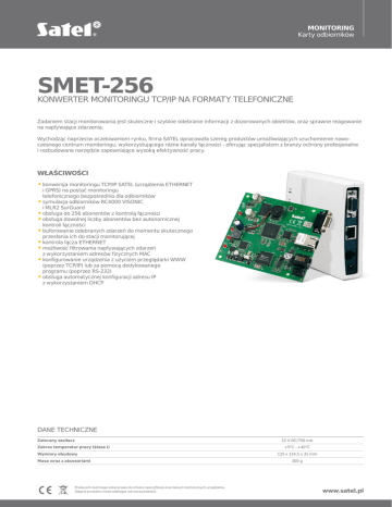 MONITORING Karty odbiorników SMET-256 KONWERTER MONITORINGU TCP/IP NA FORMATY TELEFONICZNE Zadaniem stacji monitorowania jest skuteczne i szybkie odebranie informacji z dozorowanych obiektów, oraz sprawne reagowanie na napływające zdarzenia. Wychodząc naprzeciw oczekiwaniom rynku, firma SATEL opracowała szereg produktów umożliwiających uruchomienie nowoczesnego centrum monitoringu, wykorzystującego różne kanały łączności - oferując specjalistom z branży ochrony profesjonalne i rozbudowane narzędzie zapewniające wysoką efektywność pracy. WŁAŚCIWOŚCI ••konwersja monitoringu TCP/IP SATEL (urządzenia ETHERNET i GPRS) na postać monitoringu telefonicznego bezpośrednio dla odbiorników ••symulacja odbiorników RC4000 VISONIC i MLR2 SurGuard ••obsługa do 256 abonentów z kontrolą łączności ••obsługa dowolnej liczby abonentów bez autonomicznej kontroli łączności ••buforowanie odebranych zdarzeń do momentu skutecznego przesłania ich do stacji monitorującej ••kontrola łącza ETHERNET ••możliwość filtrowania napływających zdarzeń z wykorzystaniem adresów fizycznych MAC ••konfigurowanie urządzenia z użyciem przeglądarki WWW (poprzez TCP/IP) lub za pomocą dedykowanego programu (poprzez RS-232) ••obsługa automatycznej konfiguracji adresu IP z wykorzystaniem DHCP DANE TECHNICZNE Zalecany zasilacz Zakres temperatur pracy (klasa I) Wymiary obudowy Masa wraz z akcesoriami Producent zastrzega sobie prawo do zmiany specyfikacji oraz danych technicznych urządzenia. Zdjęcie produktu może odbiegać od rzeczywistości. 12 V DC/750 mA +5°C...+40°C 125 x 114,5 x 31 mm 300 g www.satel.pl