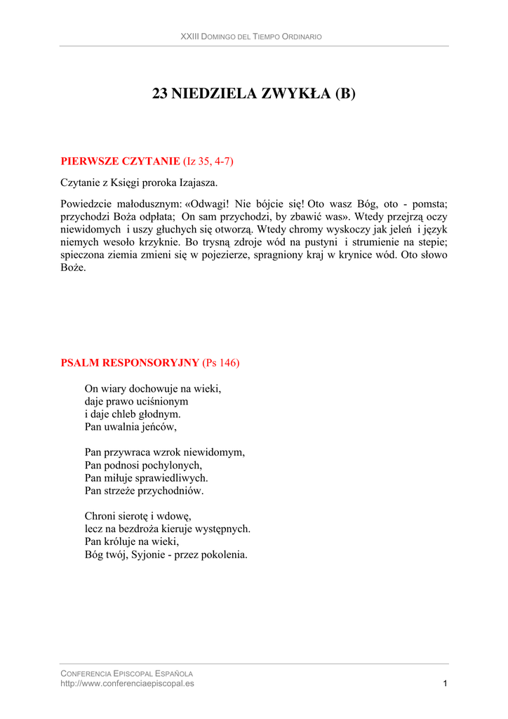 XXIII DOMINGO DEL TIEMPO ORDINARIO 23 NIEDZIELA ZWYKŁA (B) PIERWSZE CZYTANIE (Iz 35, 4-7) Czytanie z Księgi proroka Izajasza. Powiedzcie małodusznym: «Odwagi! Nie bójcie się! Oto wasz Bóg, oto - pomsta; przychodzi Boża odpłata; On sam przychodzi, by zbawić was». Wtedy przejrzą oczy niewidomych i uszy głuchych się otworzą. Wtedy chromy wyskoczy jak jeleń i język niemych wesoło krzyknie. Bo trysną zdroje wód na pustyni i strumienie na stepie; spieczona ziemia zmieni się w pojezierze, spragniony kraj w krynice wód. Oto słowo Boże. PSALM RESPONSORYJNY (Ps 146) On wiary dochowuje na wieki, daje prawo uciśnionym i daje chleb głodnym. Pan uwalnia jeńców, Pan przywraca wzrok niewidomym, Pan podnosi pochylonych, Pan miłuje sprawiedliwych. Pan strzeże przychodniów. Chroni sierotę i wdowę, lecz na bezdroża kieruje występnych. Pan króluje na wieki, Bóg twój, Syjonie - przez pokolenia. CONFERENCIA EPISCOPAL ESPAÑOLA http://www.conferenciaepiscopal.es 1 XXIII DOMINGO DEL TIEMPO ORDINADIO DRUGIE CZYTANIE (Jk 2, 1-5) Czytanie z Listu świętego. Jakuba Apostola. Bracia moi, niech wiara wasza w Pana naszego Jezusa Chrystusa uwielbionego nie ma względu na osoby. Bo gdyby przyszedł na wasze zgromadzenie człowiek przystrojony w złote pierścienie i bogatą szatę i przybył także człowiek ubogi w zabrudzonej szacie, a wy spojrzycie na bogato odzianego i powiecie: «Usiądź na zaszczytnym miejscu!», do ubogiego zaś powiecie: «Stań sobie tam albo usiądź u podnóżka mojego!», to czy nie czynicie różnic między sobą i nie stajecie się sędziami przewrotnymi? Posłuchajcie, bracia moi umiłowani! Czy Bóg nie wybrał ubogich tego świata na bogatych w wierze oraz na dziedziców królestwa przyobiecanego tym, którzy Go miłują?. Oto słowo Boże EWANGELIA (Mk 7, 31-37) Słowa Ewangelii według świętego. Marka. Jezus opuścił okolice Tyru i przez Sydon przyszedł nad Jezioro Galilejskie, przemierzając posiadłości Dekapolu. Przyprowadzili Mu głuchoniemego i prosili Go, żeby położył na niego rękę. On wziął go na bok, osobno od tłumu, włożył palce w jego uszy i śliną dotknął mu języka; a spojrzawszy w niebo, westchnął i rzekł do niego: «Effatha», to znaczy: Otwórz się! Zaraz otworzyły się jego uszy, więzy języka się rozwiązały i mógł prawidłowo mówić. [Jezus] przykazał im, żeby nikomu nie mówili. Lecz im bardziej przykazywał, tym gorliwiej to rozgłaszali. I pełni zdumienia mówili: «Dobrze uczynił wszystko. Nawet głuchym słuch przywraca i niemym mowę». Oto słowo Pańskie. CONFERENCIA EPISCOPAL ESPAÑOLA http://www.conferenciaepiscopal.es 2