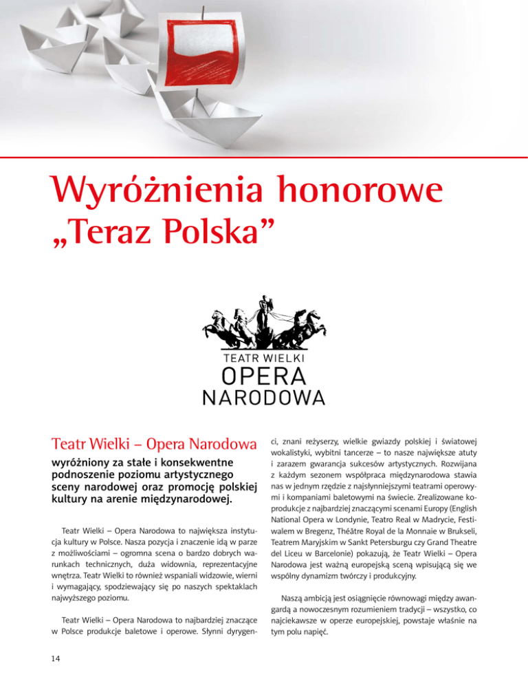 Wyróżnienia honorowe „Teraz Polska” Teatr Wielki – Opera Narodowa wyróżniony za stałe i konsekwentne podnoszenie poziomu artystycznego sceny narodowej oraz promocję polskiej kultury na arenie międzynarodowej. Teatr Wielki – Opera Narodowa to największa instytucja kultury w Polsce. Nasza pozycja i znaczenie idą w parze z możliwościami – ogromna scena o bardzo dobrych warunkach technicznych, duża widownia, reprezentacyjne wnętrza. Teatr Wielki to również wspaniali widzowie, wierni i wymagający, spodziewający się po naszych spektaklach najwyższego poziomu. Teatr Wielki – Opera Narodowa to najbardziej znaczące w Polsce produkcje baletowe i operowe. Słynni dyrygen14 ci, znani reżyserzy, wielkie gwiazdy polskiej i światowej wokalistyki, wybitni tancerze – to nasze największe atuty i zarazem gwarancja sukcesów artystycznych. Rozwijana z każdym sezonem współpraca międzynarodowa stawia nas w jednym rzędzie z najsłynniejszymi teatrami operowymi i kompaniami baletowymi na świecie. Zrealizowane koprodukcje z najbardziej znaczącymi scenami Europy (English National Opera w Londynie, Teatro Real w Madrycie, Festiwalem w Bregenz, Théătre Royal de la Monnaie w Brukseli, Teatrem Maryjskim w Sankt Petersburgu czy Grand Theatre del Liceu w Barcelonie) pokazują, że Teatr Wielki – Opera Narodowa jest ważną europejską sceną wpisującą się we wspólny dynamizm twórczy i produkcyjny. Naszą ambicją jest osiągnięcie równowagi między awangardą a nowoczesnym rozumieniem tradycji – wszystko, co najciekawsze w operze europejskiej, powstaje właśnie na tym polu napięć. Program 3 Polskiego Radia wyróżniony za konsekwentną realizację misji radia publicznego w zakresie kształtowania wysokiego poziomu wrażliwości kulturalnej wielu pokoleń Polaków. Program 3 Polskiego Radia to przede wszystkim wierni słuchacze, ludzie o różnych gustach muzycznych, poglądach politycznych i zainteresowaniach. Wszystkich łączy jedno: miłość do radia, które pięknie mówi, szanuje cudze zdanie i poglądy oraz uczy wrażliwości na słowo i muzykę. Program 3 powstał w 1962 r. Od początku stawiał na jakość, kształtując gusta muzyczne i literackie kolejnych pokoleń słuchaczy. Muzyka stanowi znak rozpoznawczy Trójki, a w autorskich audycjach można usłyszeć niemal wszystkie muzyczne gatunki. Magia Studia Muzycznego im. Agnieszki Osieckiej przyciąga artystów o międzynarodowej sławie. Poranne i popołudniowe audycje dostarczają rzetelnych informacji o bieżących wydarzeniach społecznych i politycznych. Od 1992 r. Trójka organizuje popularny plebiscyt „Srebrne Usta”, w którym słuchacze wybierają najzabawniejsze wypowiedzi polityków. Program 3 oferuje również znakomite autorskie audycje satyryczne – wiele pochodzących z nich dialogów na stałe weszło do języka polskiego. Trójka ma niekwestionowaną pozycję na trudnym rynku radiowym – jest jedną z najsilniejszych marek i laureatką prestiżowych nagród. W ostatnich latach przeżywa prawdziwy rozkwit, nie tylko z uwagi na ambitny program, ale także z powodu inicjowania ważnych akcji społecznych, takich jak „Adopcja po polsku”, „Wybory dla wszystkich”, „Nie trać słuchu” czy „Orzeł może”, organizowania konkursów wpierających młodych artystów z różnych dziedzin sztuki (Talenty Trójki) czy aktywnego angażowania się w promowanie ambitnej twórczości, m.in. dzięki Trójkowemu Znakowi Jakości. Niezwykłym wydarzeniem było powstanie Komitetu Miłośników Trójki, który przeprowadził zbiórkę publiczną, a pozyskane środki przekazał na promowanie młodych autorów oraz niszową kulturę. Rok 2012 – rok jubileuszu 50-lecia istnienia Programu 3 i jednocześnie 30-lecia „Listy Przebojów” – był dla Trójki niezwykle udany. W warszawskim parku Agrykola otwarto Aleję Radiowej Trójki, w której stanęły dwie grające ławeczki zadedykowane Programowi 3. Teatr Syrena wystawił spektakl „Trójka do potęgi”, a na antenie pojawił się cykl „Trójka z dżemem”, przypominający historię nie tylko Programu 3, ale i całego pokolenia jego słuchaczy. NBP wyemitował dwuzłotową monetę z logo Trójki, a Mennica Polska wybiła kolekcjonerską srebrną monetę o nietypowym nominale trzech dolarów nowozelandzkich. W Teatrze Polskim w Warszawie zorganizowano koncert „Jak być kochaną, czyli 50 lat historii z Trójką”, a dziennikarz Programu 3 Kuba Strzyczkowski na jachcie Delphia Trójka samotnie przepłynął Atlantyk. 15