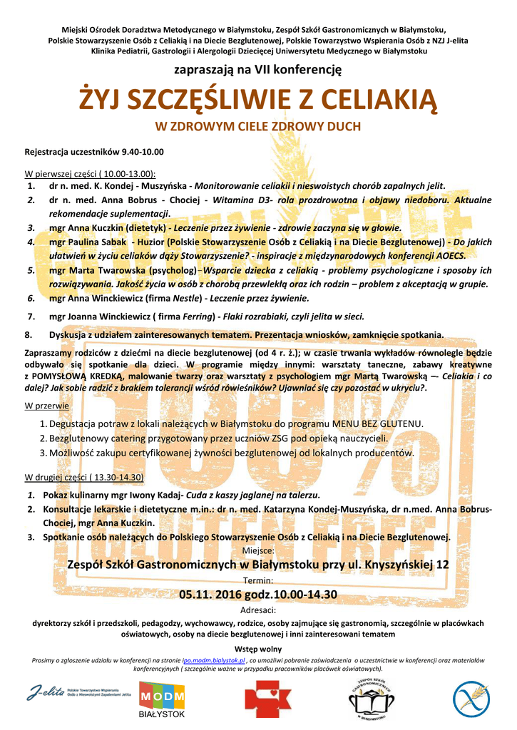 Miejski Ośrodek Doradztwa Metodycznego w Białymstoku, Zespół Szkół Gastronomicznych w Białymstoku, Polskie Stowarzyszenie Osób z Celiakią i na Diecie Bezglutenowej, Polskie Towarzystwo Wspierania Osób z NZJ J-elita Klinika Pediatrii, Gastrologii i Alergologii Dziecięcej Uniwersytetu Medycznego w Białymstoku zapraszają na VII konferencję ŻYJ SZCZĘŚLIWIE Z CELIAKIĄ W ZDROWYM CIELE ZDROWY DUCH Rejestracja uczestników 9.40-10.00 W pierwszej części ( 10.00-13.00): 1. dr n. med. K. Kondej - Muszyńska - Monitorowanie celiakii i nieswoistych chorób zapalnych jelit. 2. dr n. med. Anna Bobrus - Chociej - Witamina D3- rola prozdrowotna i objawy niedoboru. Aktualne rekomendacje suplementacji. 3. mgr Anna Kuczkin (dietetyk) - Leczenie przez żywienie - zdrowie zaczyna się w głowie. 4. mgr Paulina Sabak - Huzior (Polskie Stowarzyszenie Osób z Celiakią i na Diecie Bezglutenowej) - Do jakich ułatwień w życiu celiaków dąży Stowarzyszenie? - inspiracje z międzynarodowych konferencji AOECS. 5. mgr Marta Twarowska (psycholog)-Wsparcie dziecka z celiakią - problemy psychologiczne i sposoby ich rozwiązywania. Jakość życia w osób z chorobą przewlekłą oraz ich rodzin – problem z akceptacją w grupie. 6. mgr Anna Winckiewicz (firma Nestle) - Leczenie przez żywienie. 7. mgr Joanna Winckiewicz ( firma Ferring) - Flaki rozrabiaki, czyli jelita w sieci. 8. Dyskusja z udziałem zainteresowanych tematem. Prezentacja wniosków, zamknięcie spotkania. Zapraszamy rodziców z dziećmi na diecie bezglutenowej (od 4 r. ż.); w czasie trwania wykładów równolegle będzie odbywało się spotkanie dla dzieci. W programie między innymi: warsztaty taneczne, zabawy kreatywne z POMYSŁOWĄ KREDKĄ, malowanie twarzy oraz warsztaty z psychologiem mgr Martą Twarowską –- Celiakia i co dalej? Jak sobie radzić z brakiem tolerancji wśród rówieśników? Ujawniać się czy pozostać w ukryciu?. W przerwie 1. Degustacja potraw z lokali należących w Białymstoku do programu MENU BEZ GLUTENU. 2. Bezglutenowy catering przygotowany przez uczniów ZSG pod opieką nauczycieli. 3. Możliwość zakupu certyfikowanej żywności bezglutenowej od lokalnych producentów. W drugiej części ( 13.30-14.30) 1. Pokaz kulinarny mgr Iwony Kadaj- Cuda z kaszy jaglanej na talerzu. 2. Konsultacje lekarskie i dietetyczne m.in.: dr n. med. Katarzyna Kondej-Muszyńska, dr n.med. Anna BobrusChociej, mgr Anna Kuczkin. 3. Spotkanie osób należących do Polskiego Stowarzyszenie Osób z Celiakią i na Diecie Bezglutenowej. Miejsce: Zespół Szkół Gastronomicznych w Białymstoku przy ul. Knyszyńskiej 12 Termin: 05.11. 2016 godz.10.00-14.30 Adresaci: dyrektorzy szkół i przedszkoli, pedagodzy, wychowawcy, rodzice, osoby zajmujące się gastronomią, szczególnie w placówkach oświatowych, osoby na diecie bezglutenowej i inni zainteresowani tematem Wstęp wolny Prosimy o zgłoszenie udziału w konferencji na stronie ipo.modm.bialystok.pl , co umożliwi pobranie zaświadczenia o uczestnictwie w konferencji oraz materiałów konferencyjnych ( szczególnie ważne w przypadku pracowników placówek oświatowych).