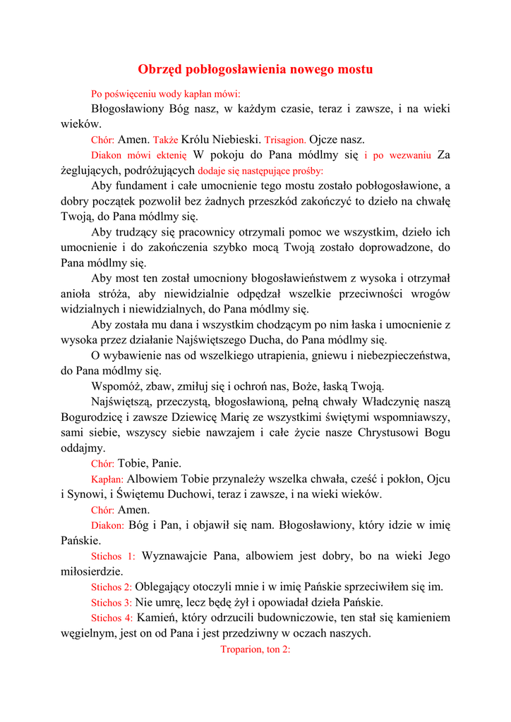 Po poświęceniu wody kapłan mówi: Błogosławiony Bóg nasz, w każdym czasie, teraz i zawsze, i na wieki wieków. Chór: Amen. Także Królu Niebieski. Trisagion. Ojcze nasz. Diakon mówi ektenię W pokoju do Pana módlmy się i po wezwaniu Za żeglujących, podróżujących dodaje się następujące prośby: Aby fundament i całe umocnienie tego mostu zostało pobłogosławione, a dobry początek pozwolił bez żadnych przeszkód zakończyć to dzieło na chwałę Twoją, do Pana módlmy się. Aby trudzący się pracownicy otrzymali pomoc we wszystkim, dzieło ich umocnienie i do zakończenia szybko mocą Twoją zostało doprowadzone, do Pana módlmy się. Aby most ten został umocniony błogosławieństwem z wysoka i otrzymał anioła stróża, aby niewidzialnie odpędzał wszelkie przeciwności wrogów widzialnych i niewidzialnych, do Pana módlmy się. Aby została mu dana i wszystkim chodzącym po nim łaska i umocnienie z wysoka przez działanie Najświętszego Ducha, do Pana módlmy się. O wybawienie nas od wszelkiego utrapienia, gniewu i niebezpieczeństwa, do Pana módlmy się. Wspomóż, zbaw, zmiłuj się i ochroń nas, Boże, łaską Twoją. Najświętszą, przeczystą, błogosławioną, pełną chwały Władczynię naszą Bogurodzicę i zawsze Dziewicę Marię ze wszystkimi świętymi wspomniawszy, sami siebie, wszyscy siebie nawzajem i całe życie nasze Chrystusowi Bogu oddajmy. Chór: Tobie, Panie. Kapłan: Albowiem Tobie przynależy wszelka chwała, cześć i pokłon, Ojcu i Synowi, i Świętemu Duchowi, teraz i zawsze, i na wieki wieków. Chór: Amen. Diakon: Bóg i Pan, i objawił się nam. Błogosławiony, który idzie w imię Pańskie. Stichos 1: Wyznawajcie Pana, albowiem jest dobry, bo na wieki Jego miłosierdzie. Stichos 2: Oblegający otoczyli mnie i w imię Pańskie sprzeciwiłem się im. Stichos 3: Nie umrę, lecz będę żył i opowiadał dzieła Pańskie. Stichos 4: Kamień, który odrzucili budowniczowie, ten stał się kamieniem węgielnym, jest on od Pana i jest przedziwny w oczach naszych. Troparion, ton 2: Stwórco i Twórco wszystkiego, Boże, dzieło rąk naszych szybko wzmocnij błogosławieństwem Twoim i most ten mocą Twoją umocnij, a przechodzących po nim wybaw ze wszelkiego zła, albowiem jesteś Jeden Mocny i Przyjaciel człowieka. Chwała Ojcu i Synowi, i Świętemu Duchowi, i teraz, i zawsze, i na wieki wieków. Amen. Teotokion: Obrono chrześcijan nie do zawstydzenia, orędownictwo ku Stwórcy niezmienne, nie odrzuć głosów próśb grzesznych, ale pospiesz jako dobra na pomoc nam, wiernie wołającym: Zważ na modlitwę i pospiesz na błaganie, Bogurodzico, zawsze orędująca za czczącymi Ciebie. Także Psalm 50 – patrz s. . Do Pana módlmy się. Władco Boże Wszechwładny, Ojcze Pana naszego Jezusa Chrystusa, który stworzyłeś niebo myślą swoją i ziemię założyłeś na jej fundamencie, Stwórco i Twórco wszystkich, wejrzyj na modlitwę nas, niegodnych sług, dzisiaj na tym miejscu modlących się do Ciebie, i ześlij błogosławieństwo Twoje niebieskie na fundament tego mostu, albowiem od Ciebie pochodzi wszelki dar dobry, wszelka moc i siła, i wszystko potrzebne ludziom, więc jak dawno temu stary Izrael przeprowadziłeś przez Morze Czerwone jak po suchym lądzie, i teraz wejrzyj miłosiernie na ten most i otocz go opieką, umocnij go niezachwianie, aby w pokoju, bez lęku i bez wahania przechodzili po nim ludzie i zwierzęta. Prosimy Cię, Panie Boże, otocz ten most i chroń go Twą Bożą Opatrznością, i mocną opieką. Daj mu anioła stróża, aby go chronił i wybawiał od wszelkich zakusów, i burzliwych fal, wybawiając most i chodzących po nim ludzi oraz zwierzęta od wszelkich złych zakusów złego, aby chodzący po nim opiewali i sławili Ciebie, najszczodrobliwszy Panie. Nie zapominaj o Twoim ludzie i zmiłuj się nad nami, daj nam wszystkim zdrowie i długie dni życia, pokój i spokój, domy nasze napełnij wszystkim potrzebnym do życia, obroń i ochroń ubogich oraz wędrowców, daj nam pomyślne wiatry, plony ziemi i we wszystkim pospiesz nam na zbawienie, błogosławiąc nasze wejścia i wyjścia, gdy chodzimy i przechodzimy przez ten most jak po ziemi, dla modlitw najczystszej Władczyni naszej Bogurodzicy, mocą czcigodnego i życiodajnego krzyża, opieką czcigodnych niebieskich mocy bezcielesnych, czcigodnego sławnego Proroka, Poprzednika i Chrzciciela Jana, świętych zwycięskich męczenników, świętego widzącego Boga proroka Mojżesza i wszystkich świętych. Albowiem Ty jesteś Mocą i umocnieniem naszym, i Tobie chwałę, i dziękczynienie oddajemy, z Jednorodzonym Twoim Synem, i z Najświętszym, i Dobrym, i Życiodajnym Twoim Duchem, teraz i zawsze, i na wieki wieków. Amen. Diakon mówi ektenię: Zmiłuj się nad nami, Boże, według wielkiego miłosierdzia Twego, błagamy Cię, wysłuchaj i zmiłuj się. Chór: Panie, zmiłuj się (trzy razy). Jeszcze modlimy się do Pana Boga naszego, aby usłyszał głos modlitwy nas grzesznych i zmiłował się nad sługami swoimi N. N., i ochronił ich od wszelkiej troski, nieszczęść, gniewu i potrzeb, od wszelkie choroby duchowej i cielesnej, dając im zdrowie z długimi latami życia, wołajmy wszyscy: szybko wysłuchaj i miłosiernie zmiłuj się. Jeszcze modlimy się o zachowanie tego miasta (lub: tej wsi; lub: tego monasteru) i każdego miasta, i krainy, od głodu, zarazy, trzęsienia ziemi, potopu, ognia, miecza, napaści obcych plemion i walk bratobójczych, aby miłosierny i łaskawy Przyjaciel człowieka, Bóg nasz, odwrócił wszelki gniew na nas nadciągający i wybawił nas od należnego i sprawiedliwego osądzenia, i zmiłował się nad nami. Jeszcze módlmy się, aby Pan Bóg usłyszał głos modlitwy nas grzesznych i zmiłował się nad nami. Kapłan: Usłysz nas, Boże, Zbawicielu nasz, Nadziejo wszystkich krańców ziemi i pozostających daleko na morzu, i miłosierny, miłosierny bądź, Władco, dla naszych grzechów i z