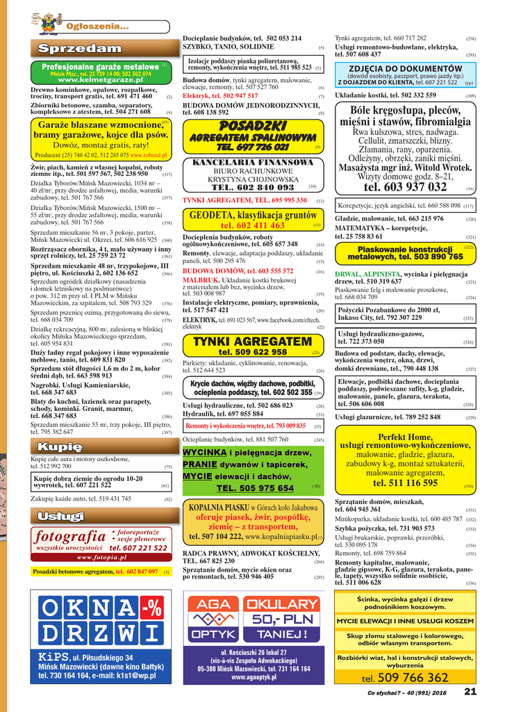Ogłoszenia... Docieplanie budynków, tel. 502 053 214 SZYBKO, TANIO, SOLIDNIE Sprzedam Profesjonalne garaże metalowe (1) Mińsk Maz., tel. 25 759 14 00; 502 502 074 www.kelmetgaraze.pl Drewno kominkowe, opałowe, rozpałkowe, trociny, transport gratis, tel. 691 471 460 Zbiorniki betonowe, szamba, separatory, kompleksowo z atestem, tel. 504 271 608 (6) Elektryk, tel. 502 947 517 (7) (4) BUDOWA DOMÓW JEDNORODZINNYCH, (8) tel. 608 138 592 Dowóz, montaż gratis, raty! Producent (25) 740 42 02, 512 245 075 www.robstal.pl Żwir, piach, kamień z własnej kopalni, roboty (317) ziemne itp., tel. 501 597 567, 502 238 950 Działka Tyborów/Mińsk Mazowiecki, 1034 m2 – 40 zł/m2, przy drodze asfaltowej, media, warunki (357) zabudowy, tel. 501 767 566 Działka Tyborów/Mińsk Mazowiecki, 1500 m2 – 55 zł/m2, przy drodze asfaltowej, media, warunki (358) zabudowy, tel. 501 767 566 Sprzedam mieszkanie 56 m2, 3 pokoje, parter, Mińsk Mazowiecki ul. Okrzei, tel. 606 616 925 (360) Roztrząsacz obornika, 4 t, mało używany i inny sprzęt rolniczy, tel. 25 759 23 72 (361) Sprzedam mieszkanie 48 m2, trzypokojowe, III (366) piętro, ul. Kościuszki 2, 602 136 652 Sprzedam ogródek działkowy (nasadzenia i domek letniskowy na podmurówce) o pow. 312 m przy ul. I PLM w Mińsku Mazowieckim, za szpitalem, tel. 508 793 329 (376) Sprzedam pszenicę ozimą, przygotowaną do siewu, (378) tel. 668 034 709 Działkę rekreacyjną, 800 m2, zalesioną w bliskiej okolicy Mińska Mazowieckiego sprzedam, (381) tel. 605 954 831 Duży ładny regał pokojowy i inne wyposażenie (382) meblowe, tanio, tel. 609 831 820 Sprzedam stół długości 1,6 m do 2 m, kolor (384) średni dąb, tel. 663 598 913 (385) Blaty do kuchni, łazienek oraz parapety, schody, kominki. Granit, marmur, (386) tel. 668 347 683 Sprzedam mieszkanie 55 m2, trzy pokoje, III piętro, (387) tel. 795 382 647 Kupię Kupię dobrą ziemię do ogrodu 10-20 wywrotek, tel. 607 221 522 Zakupię każde auto, tel. 519 431 745 wszystkie uroczystości (81) (82) • fotoreportaże • sesje plenerowe tel. 607 221 522 www.fotopia.pl Posadzki betonowe agregatem, tel. 602 847 097 Posadzki agregatem spalinowym tel. 697 726 021 (9) KANCELARIA FINANSOWA BIURO RACHUNKOWE KRYSTYNA CHOJNOWSKA TEL. 602 840 093 TYNKI AGREGATEM, TEL. 695 995 330 (11) GEODETA, klasyfikacja gruntów tel. 602 411 463 (13) Docieplenia budynków, roboty (14) ogólnowykończeniowe, tel. 605 657 348 Remonty, elewacje, adaptacja poddaszy, układanie paneli, tel. 500 295 476 (15) BUDOWA DOMÓW, tel. 603 555 572 (16) MALBRUK. Układanie kostki brukowej z materiałem lub bez, wycinka drzew, (19) tel. 503 008 987 Instalacje elektryczne, pomiary, uprawnienia, tel. 517 547 421 (20) ELEKTRYK, tel. 691 023 567, www.facebook.com/eltech. (22) elektryk TYNKI AGREGATEM tel. 509 622 958 Parkiety: układanie, cyklinowanie, renowacja, tel. 512 644 523 (23) (26) Krycie dachów, więźby dachowe, podbitki, ocieplenia poddaszy, tel. 602 502 355 (29) Usługi hydrauliczne, tel. 502 686 023 Hydraulik, tel. 697 055 884 Remonty i wykończenia wnętrz, tel. 793 009 835 Ocieplanie budynków, tel. 881 507 760 (3) Tynki agregatem, tel. 660 717 282 Usługi remontowo-budowlane, elektryka, tel. 507 608 437 (258) (293) ZDJĘCIA DO DOKUMENTÓW (dowód osobisty, paszport, prawo jazdy itp.) Z DOJAZDEM DO KLIENTA, tel. 607 221 522 (pp) Układanie kostki, tel. 502 332 559 (309) Bóle kręgosłupa, pleców, mięśni i stawów, fibromialgia Rwa kulszowa, stres, nadwaga. Cellulit, zmarszczki, blizny. Złamania, rany, oparzenia. Odleżyny, obrzęki, zaniki mięśni. Masażysta mgr inż. Witold Wrotek. Wizyty domowe godz. 8–21, tel. 603 937 032 (10) (28) (31) (34) Korepetycje, język angielski, tel. 660 588 098 (317) Gładzie, malowanie, tel. 663 215 976 (320) MATEMATYKA – korepetycje, tel. 25 758 83 61 (321) Piaskowanie konstrukcji metalowych, tel. 503 890 765 (322) DRWAL, ALPINISTA, wycinka i pielęgnacja drzew, tel. 510 319 637 (323) Piaskowanie felg i malowanie proszkowe, tel. 668 034 709 (324) Pożyczki Pozabankowe do 2000 zł, Inkaso City, tel. 792 307 229 (325) Usługi hydrauliczno-gazowe, tel. 722 373 050 (326) Budowa od podstaw, dachy, elewacje, wykończenia wnętrz, okna, drzwi, domki drewniane, tel., 790 448 138 (327) Elewacje, podbitki dachowe, docieplania poddaszy, podwieszane sufity, k-g, gładzie, malowanie, panele, glazura, terakota, tel. 506 606 008 (328) Usługi glazurnicze, tel. 789 252 848 (329) (33) (245) (75) Usługi fotografia (5) (2) Garaże blaszane wzmocnione, bramy garażowe, kojce dla psów. Kupię całe auta i motory uszkodzone, tel. 512 992 700 Izolacje poddaszy pianką poliuretanową, remonty, wykończenia wnętrz, tel. 511 985 523 Budowa domów, tynki agregatem, malowanie, elewacje, remonty, tel. 507 527 760 (43) Nagrobki. Usługi Kamieniarskie, tel. 668 347 683 (4) (30) KOPALNIA PIASKU w Górach koło Jakubowa oferuje piasek, żwir, pospółkę, ziemię – z transportem, tel. 507 104 222, www.kopalniapiasku.pl(27) RADCA PRAWNY, ADWOKAT KOŚCIELNY, TEL. 667 825 230 (266) Sprzątanie domów, mycie okien oraz (285) po remontach, tel. 530 946 405 Perfekt Home, usługi remontowo-wykończeniowe, malowanie, gładzie, glazura, zabudowy k-g, montaż sztukaterii, malowanie agregatem, tel. 511 116 595 Sprzątanie domów, mieszkań, tel. 604 945 361 (330) (331) Minikoparka, układanie kostki, tel. 600 485 787 (332) Szybka pożyczka, tel. 731 903 573 Usługi brukarskie, poprawki, przeróbki, tel. 530 095 178 Remonty, tel. 698 759 864 (333) (334) (335) Remonty kapitalne, malowanie, gładzie gipsowe, K-G, glazura, terakota, panele, tapety, wszystko solidnie osobiście, (336) tel. 511 006 628 Ścinka, wycinka gałęzi i drzew podnośnikiem koszowym. MYCIE ELEWACJI I INNE USŁUGI KOSZEM Skup złomu stalowego i kolorowego, odbiór własnym transportem. Rozbiórki wiat, hal i konstrukcji stalowych, wyburzenia tel. 509 766 362 Co słychać? – 40 (991) 2016 21