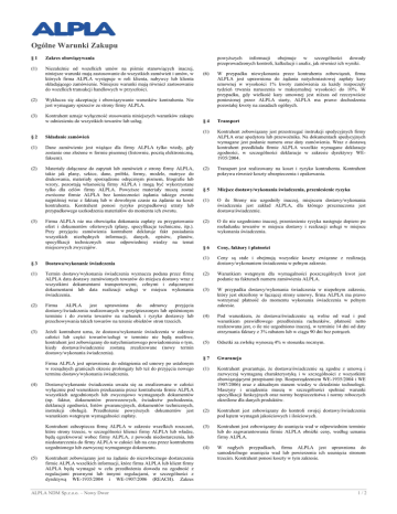 Ogólne Warunki Zakupu §1 Zakres obowiązywania (1) Niezależnie od wszelkich umów na piśmie stanowiących inaczej, niniejsze warunki mają zastosowanie do wszystkich zamówień i umów, w których firma ALPLA występuje w roli klienta, nabywcy lub klienta składającego zamówienie. Niniejsze warunki mają również zastosowanie do wszelkich transakcji handlowych w przyszłości. (2) Wyklucza się akceptację i obowiązywanie warunków kontrahenta. Nie jest wymagany sprzeciw ze strony firmy ALPLA. (3) Kontrahent uznaje wyłączność stosowania niniejszych warunków zakupu w odniesieniu do wszystkich towarów lub usług. powyższych informacji obejmuje w szczególności dowody przeprowadzonych kontroli, kalkulacji i analiz, jak również ich wyniki. (6) W przypadku niewykonania przez kontrahenta zobowiązań, firma ALPLA jest uprawniona do żądania natychmiastowej zapłaty kary umownej w wysokości 1% kwoty zamówienia za każdy rozpoczęty tydzień trwania naruszenia w maksymalnej wysokości do 10%. W przypadku, gdy wielkość kary umownej jest niższa od rzeczywiście poniesionej przez ALPLA starty, ALPLA ma prawo dochodzenia pozostałej kwoty na zasadach ogólnych. §4 Transport (1) Kontrahent zobowiązany jest przestrzegać instrukcji spedycyjnych firmy ALPLA oraz spedytora lub przewoźnika. Na dokumentach spedycyjnych wymagane jest podanie numeru oraz daty zamówienia. Wraz z dostawą kontrahent przedkłada firmie ALPLA wszelkie wymagane deklaracje zgodności, w szczególności deklaracje w zakresie dyrektywy WE1935/2004. §2 Składanie zamówień (1) Dane zamówienie jest wiążące dla firmy ALPLA tylko wtedy, gdy zostanie ono złożone w formie pisemnej (listownie, pocztą elektroniczną, faksem). (2) Materiały dołączane do zapytań lub zamówień z strony firmy ALPLA, takie jak plany, szkice, dane, próbki, formy, modele, matryce do drukowania, materiały sporządzone odręcznym pismem, litografie lub wzory, pozostają własnością firmy ALPLA i mogą być wykorzystane tylko dla celów firmy ALPLA. Powyższe materiały muszą zostać zwrócone firmie ALPLA bez konieczności żądania takiego zwrotu najpóźniej wraz z fakturą lub w dowolnym czasie na żądanie na koszt kontrahenta. Kontrahent ponosi ryzyko przypadkowej utraty lub przypadkowego uszkodzenia materiałów do momentu ich zwrotu. (2) Transport jest realizowany na koszt i ryzyko kontrahenta. Kontrahent pokrywa również koszty ubezpieczenia i opakowania. §5 Miejsce dostawy/wykonania świadczenia, przeniesienie ryzyka (1) O ile Strony nie uzgodniły inaczej, miejscem dostawy/wykonania świadczenia jest zakład ALPLA, dla którego przeznaczona jest dostawa/świadczenie. Firma ALPLA nie ma obowiązku dokonania zapłaty za przygotowanie ofert i dokumentów ofertowych (plany, specyfikacje techniczne, itp.). Przy przyjęciu zamówienia kontrahent deklaruje fakt posiadania wszystkich niezbędnych informacji, danych, opisów, planów, specyfikacji technicznych oraz odpowiedniej wiedzy na temat miejscowych zwyczajów. (2) O ile nie uzgodniono inaczej, przeniesienie ryzyka następuje dopiero po rozładunku towarów w miejscu dostawy i realizacji usługi w miejscu wykonania świadczenia. §6 Ceny, faktury i płatności (1) Ceny są stałe i obejmują wszystkie koszty związane z realizacją dostawy/wykonaniem świadczenia w pełnym zakresie. (2) Warunkiem wstępnym dla wymagalności poszczególnych kwot jest podanie na fakturach numeru zamówienia ALPLA. (3) W przypadku dostawy/wykonania świadczenia w niepełnym zakresie, który jest określony w łączącej strony umowy, firma ALPLA ma prawo wstrzymać płatność do momentu wykonania świadczenia w pełnym zakresie. (4) Pod warunkiem, że dostawa/świadczenie są wolne od wad i pod warunkiem prawidłowego przedłożenia rachunków, płatność netto realizowana jest, o ile nie uzgodniono inaczej, w terminie 14 dni od daty otrzymania faktury z 3% rabatem lub w ciągu 90 dni bez potrąceń. (5) Odsetki za zwłokę wynoszą 4% w stosunku rocznym. §7 Gwarancja (1) Kontrahent gwarantuje, że dostawa/świadczenie są zgodne z umową i zazwyczaj wymaganą charakterystyką i w szczególności z wszystkimi obowiązującymi przepisami (np. Rozporządzeniem WE-1935/2004 i WE 1907/2006) oraz z aktualnym stanem wiedzy w dziedzinie technologii. Maszyny i urządzenia muszą w szczególności spełniać warunki specyfikacji funkcyjnych oraz normy bezpieczeństwa i normy roboczych określone dla danych produktów. (2) Kontrahent jest zobowiązany do kontroli swojej dostawy/świadczenia pod kątem wymagań jakościowych i ilościowych. (3) Kontrahent jest zobowiązany do usunięcia wad w odpowiednim terminie lub do zagwarantowania firmie ALPLA obniżki ceny, według uznania firmy ALPLA. (4) W nagłych przypadkach, firma ALPLA jest uprawniona do samodzielnego usunięcia wad lub powierzenia ich usunięcia stronom trzecim. Kontrahent ponosi koszty w tym zakresie. (3) §3 Dostawa/wykonanie świadczenia (1) Termin dostawy/wykonania świadczenia wyznacza podana przez firmę ALPLA data dostawy zamówionych towarów do miejsca dostawy wraz z wszystkimi dokumentami transportowymi, celnymi i załączanymi dokumentami lub data realizacji usługi w miejscu wykonania świadczenia. (2) (3) Firma ALPLA jest uprawniona do odmowy przyjęcia dostawy/świadczenia realizowanych w przyśpieszonym lub opóźnionym terminie i do zwrotu towarów na rachunek i ryzyko dostawcy lub przechowywania takich towarów na terenie obiektów stron trzecich. Jeżeli kontrahent uzna, że dostawa/wykonanie świadczenia w zakresie całości lub części towarów/usługi w terminie nie będą możliwe, kontrahent jest zobowiązany do natychmiastowego powiadomienia o tym, kiedy dostawa/świadczenie zostaną zrealizowane (nowy termin dostawy/wykonania świadczenia). Firma ALPLA jest uprawniona do odstąpienia od umowy po ustalonym w rozsądnych granicach okresie prolongaty lub też do przyjęcia nowego terminu dostawy/wykona