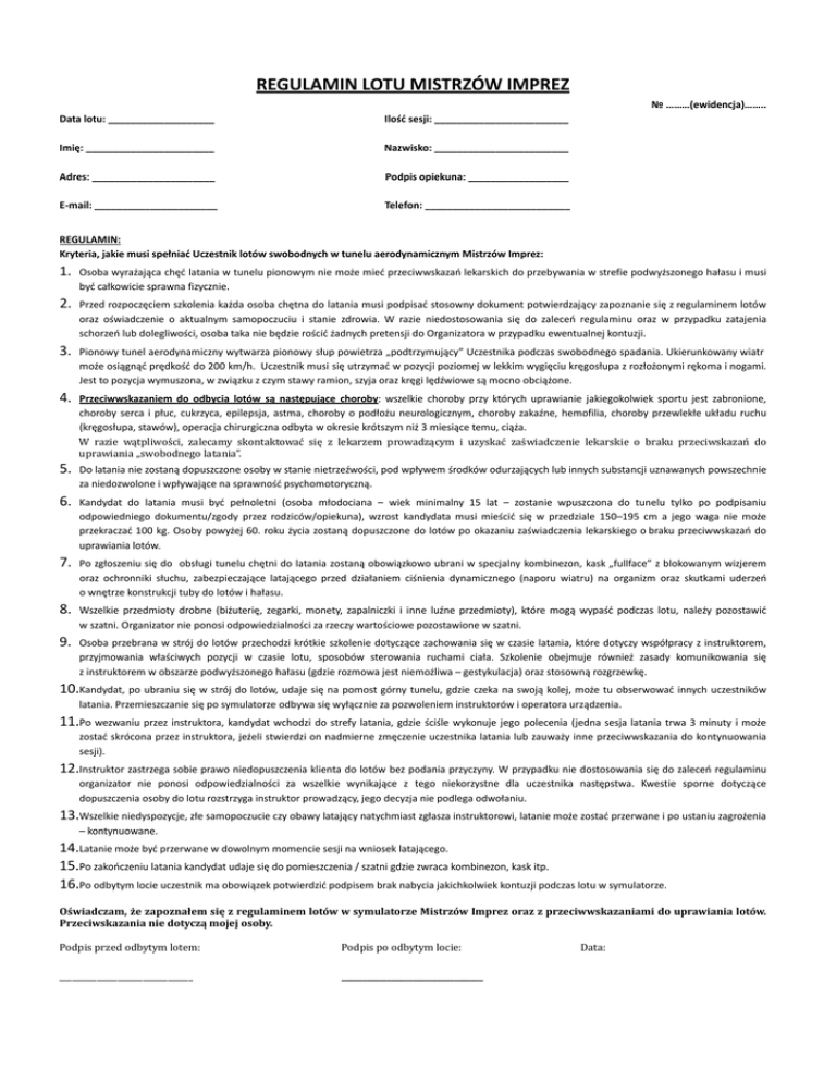 REGULAMIN LOTU MISTRZÓW IMPREZ № ………(ewidencja)…….. Data lotu: ___________________ Ilość sesji: ________________________ Imię: _______________________ Nazwisko: ________________________ Adres: ______________________ Podpis opiekuna: __________________ E-mail: ______________________ Telefon: __________________________ REGULAMIN: Kryteria, jakie musi spełniać Uczestnik lotów swobodnych w tunelu aerodynamicznym Mistrzów Imprez: 1. Osoba wyrażająca chęć latania w tunelu pionowym nie może mieć przeciwwskazań lekarskich do przebywania w strefie podwyższonego hałasu i musi być całkowicie sprawna fizycznie. 2. Przed rozpoczęciem szkolenia każda osoba chętna do latania musi podpisać stosowny dokument potwierdzający zapoznanie się z regulaminem lotów oraz oświadczenie o aktualnym samopoczuciu i stanie zdrowia. W razie niedostosowania się do zaleceń regulaminu oraz w przypadku zatajenia schorzeń lub dolegliwości, osoba taka nie będzie rościć żadnych pretensji do Organizatora w przypadku ewentualnej kontuzji. 3. Pionowy tunel aerodynamiczny wytwarza pionowy słup powietrza „podtrzymujący” Uczestnika podczas swobodnego spadania. Ukierunkowany wiatr może osiągnąć prędkość do 200 km/h. Uczestnik musi się utrzymać w pozycji poziomej w lekkim wygięciu kręgosłupa z rozłożonymi rękoma i nogami. Jest to pozycja wymuszona, w związku z czym stawy ramion, szyja oraz kręgi lędźwiowe są mocno obciążone. 4. Przeciwwskazaniem do odbycia lotów są następujące choroby: wszelkie choroby przy których uprawianie jakiegokolwiek sportu jest zabronione, choroby serca i płuc, cukrzyca, epilepsja, astma, choroby o podłożu neurologicznym, choroby zakaźne, hemofilia, choroby przewlekłe układu ruchu (kręgosłupa, stawów), operacja chirurgiczna odbyta w okresie krótszym niż 3 miesiące temu, ciąża. W razie wątpliwości, zalecamy skontaktować się z lekarzem prowadzącym i uzyskać zaświadczenie lekarskie o braku przeciwskazań do uprawiania „swobodnego latania”. 5. Do latania nie zostaną dopuszczone osoby w stanie nietrzeźwości, pod wpływem środków odurzających lub innych substancji uznawanych powszechnie za niedozwolone i wpływające na sprawność psychomotoryczną. 6. Kandydat do latania musi być pełnoletni (osoba młodociana – wiek minimalny 15 lat – zostanie wpuszczona do tunelu tylko po podpisaniu odpowiedniego dokumentu/zgody przez rodziców/opiekuna), wzrost kandydata musi mieścić się w przedziale 150–195 cm a jego waga nie może przekraczać 100 kg. Osoby powyżej 60. roku życia zostaną dopuszczone do lotów po okazaniu zaświadczenia lekarskiego o braku przeciwwskazań do uprawiania lotów. 7. Po zgłoszeniu się do obsługi tunelu chętni do latania zostaną obowiązkowo ubrani w specjalny kombinezon, kask „fullface” z blokowanym wizjerem oraz ochronniki słuchu, zabezpieczające latającego przed działaniem ciśnienia dynamicznego (naporu wiatru) na organizm oraz skutkami uderzeń o wnętrze konstrukcji tuby do lotów i hałasu. 8. Wszelkie przedmioty drobne (biżuterię, zegarki, monety, zapalniczki i inne luźne przedmioty), które mogą wypaść podczas lotu, należy pozostawić w szatni. Organizator nie ponosi odpowiedzialności za rzeczy wartościowe pozostawione w szatni. 9. Osoba przebrana w strój do lotów przechodzi krótkie szkolenie dotyczące zachowania się w czasie latania, które dotyczy współpracy z instruktorem, przyjmowania właściwych pozycji w czasie lotu, sposobów sterowania ruchami ciała. Szkolenie obejmuje również zasady komunikowania się z instruktorem w obszarze podwyższonego hałasu (gdzie rozmowa jest niemożliwa – gestykulacja) oraz stosowną rozgrzewkę. 10.Kandydat, po ubraniu się w strój do lotów, udaje się na pomost górny tunelu, gdzie czeka na swoją kolej, może tu obserwować innych uczestników latania. Przemieszczanie się po symulatorze odbywa się wyłącznie za pozwoleniem instruktorów i operatora urządzenia. 11.Po wezwaniu przez instruktora, kandydat wchodzi do strefy latania, gdzie ściśle wykonuje jego polecenia (jedna sesja latania trwa 3 minuty i może zostać skrócona przez instruktora, jeżeli stwierdzi on nadmierne zmęczenie uczestnika latania lub zauważy inne przeciwwskazania do kontynuowania sesji). 12.Instruktor zastrzega sobie prawo niedopuszczenia klienta do lotów bez podania przyczyny. W przypadku nie dostosowania się do zaleceń regulaminu organizator nie ponosi odpowiedzialności za wszelkie wynikające z tego niekorzystne dla uczestnika następstwa. Kwestie sporne dotyczące dopuszczenia osoby do lotu rozstrzyga instruktor prowadzący, jego decyzja nie podlega odwołaniu. 13.Wszelkie niedyspozycje, złe samopoczucie czy obawy latający natychmiast zgłasza instruktorowi, latanie może zostać przerwane i po ustaniu zagrożenia – kontynuowane. 14.Latanie może być przerwane w dowolnym momencie sesji na wniosek latającego. 15.Po zakończeniu latania kandydat udaje się do pomieszczenia / szatni gdzie zwraca kombinezon, kask itp. 16.Po odbytym locie uczestnik ma obowiązek potwierdzić podpisem brak nabycia jakichkolwiek kontuzji podczas lotu w symulatorze. Oświadczam, że zapoznałem się z regulaminem lotów w symulatorze Mistrzów Imprez oraz z przeciwwskazaniami do uprawiania lotów. Przeciwskazania nie dotyczą mojej osoby. Podpis przed odbytym lotem: Podpis po odbytym locie: ________________________________ __________________________________ Data: