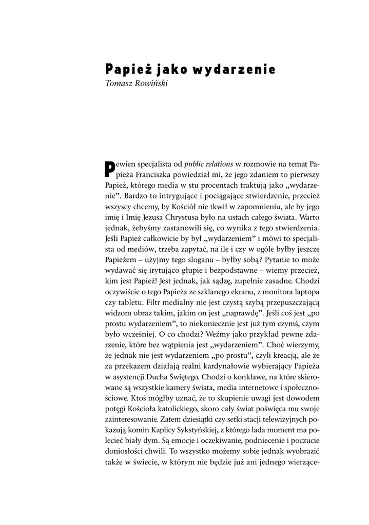 Pa p i e ż j a k o w y d a r z e n i e Tomasz Rowiński P ewien specjalista od public relations w rozmowie na temat Papieża Franciszka powiedział mi, że jego zdaniem to pierwszy Papież, którego media w stu procentach traktują jako „wydarzenie”. Bardzo to intrygujące i pociągające stwierdzenie, przecież wszyscy chcemy, by Kościół nie tkwił w zapomnieniu, ale by jego imię i Imię Jezusa Chrystusa było na ustach całego świata. Warto jednak, żebyśmy zastanowili się, co wynika z tego stwierdzenia. Jeśli Papież całkowicie by był „wydarzeniem” i mówi to specjalista od mediów, trzeba zapytać, na ile i czy w ogóle byłby jeszcze Papieżem – użyjmy tego sloganu – byłby sobą? Pytanie to może wydawać się irytująco głupie i bezpodstawne – wiemy przecież, kim jest Papież! Jest jednak, jak sądzę, zupełnie zasadne. Chodzi oczywiście o tego Papieża ze szklanego ekranu, z monitora laptopa czy tabletu. Filtr medialny nie jest czystą szybą przepuszczającą widzom obraz takim, jakim on jest „naprawdę”. Jeśli coś jest „po prostu wydarzeniem”, to niekoniecznie jest już tym czymś, czym było wcześniej. O co chodzi? Weźmy jako przykład pewne zdarzenie, które bez wątpienia jest „wydarzeniem”. Choć wierzymy, że jednak nie jest wydarzeniem „po prostu”, czyli kreacją, ale że za przekazem działają realni kardynałowie wybierający Papieża w asystencji Ducha Świętego. Chodzi o konklawe, na które skierowane są wszystkie kamery świata, media internetowe i społecznościowe. Ktoś mógłby uznać, że to skupienie uwagi jest dowodem potęgi Kościoła katolickiego, skoro cały świat poświęca mu swoje zainteresowanie. Zatem dziesiątki czy setki stacji telewizyjnych pokazują komin Kaplicy Sykstyńskiej, z którego lada moment ma polecieć biały dym. Są emocje i oczekiwanie, podniecenie i poczucie doniosłości chwili. To wszystko możemy sobie jednak wyobrazić także w świecie, w którym nie będzie już ani jednego wierzące- 23 To m a s z R o w i ń s k i Pa p i e ż j a k o w y d a r z e n i e go, ani jednego katolika, w świecie, w którym medialna kreacja ludzkiego doświadczenia przejmie dawne zwyczaje i obrzędy, by uczynić z nich jedynie widowisko – „wydarzenie po prostu”. Wydarzenie po prostu Widzowie wystawieni na jego oddziaływanie będą wciąż myśleć o tym, jak potężny jest Papież, jak potężny jest Kościół. To fałszywe spojrzenie mogłoby być dobrą charakterystyką czasów antychrysta. Konklawe, które tak naprawdę byłoby czymś w rodzaju „antykonklawe”. Papież mediów wystawiony na widok publiczny, przyjmujący chwałę tego świata, korzystający ze skradzionej symboliki Kościoła, a prawdziwy Papież z prawdziwego Kościoła odepchnięty od świata w gronie kardynałów przypominających żebraków. Możemy to sobie wyobrazić. Wystarczyłoby w zasadzie przeformułować pewne wątki Pierścienia rybaka Jeana Raspaila. Temat medialnego antypapieża to jest zdecydowanie temat literacki – może cyberpunkowy. Jednak jest to też temat publicystyczny. Jego elementy możemy zobaczyć już dziś w narracji sączonej nam do głów. W narracji tej Papież Franciszek pospołu z liberałami rozmontowuje („reformuje w duchu Ewangelii”) Kościół. Ta wyobrażona możliwość medialnego antykonklawe i antypapieża, nawet dziś, gdy nie mamy, póki co, rozdwojenia osób, gdy nie spodziewamy się, by ktoś taki mógł się pojawić, jakiś antypapież-antychryst zupełnie uległy wobec świata i jego oczekiwań, powinniśmy pamiętać, że „papież jako wydarzenie”, jako „wydarzenie po prostu” jest w znacznym stopniu zagrożeniem podążania w stronę niepapiestwa. Kim bowiem jest Papież? Wiemy czy nie wiemy? Nie odpowiem na to pytanie1, ale wskażę elementy, które łatwo możemy uchwycić – Papież to Biskup Rzymu, pasterz Kościoła, Papież to ten, który jest autorem lub sygnatariuszem dokumentów będących głosem Magisterium, głosem nauczania o wierze. Wreszcie to osoba, nie tylko urząd. Jest też kapłanem, którego widzimy, jak odprawia liturgię u grobu św. Piotra i jego następców. „Papież jako wydarzenie” jednak coraz rzadziej spotyka się z Papieżem rzeczywistym. Encykliki czy wypowiedzi Magisterium sygnowane przez rzeczywistego Papieża mają coraz krótszy żywot. Prawie nie są komentowane – za to komentuje się wpisy na Twitterze wypuszczane przez PR-owców Stolicy Apostol- 1 Znaleźć tę odpowiedź można w „Christianitas” nr 51, pt. Kim jest papież? 24 C h r i s t i a n i t a s 5 2 / 2 0 1 3 p u ł a p k a n a pa p i e ż a skiej. Komentuje się zdjęcia Papieża z teczką, Papieża obok starego renault 4, Papieża na Copacabanie, Papieża wśród robotników. Nie wystarczy już na odtrutkę powiedzieć, że przecież Papież jest z nami, z Kościołem – wręcz jego Kościołem. Owszem, to prawda, i trzeba to powtarzać, ale to nie wystarczy. Papież bowiem sam wchodzi w grę tego świata, która nie jest zabawą. Obcując ze światem mediów, które wyćwiczyły nas w rozrywce zbudowanej nawet ze spraw najważniejszych, z większym trudem dostrzegamy zagrożenie tym nowym typem religijnej rozrywki. Może nawet czasem tam, gdzie wydaje nam się, że widzimy światło ewangelizacji, wygląda ku nam antytwarz. Także w przypadku Kościoła i Papieża warto pamiętać o formule McLuhana – medium is a message. Kolejne odsłony papieskiego wydarzenia wywołują reakcje entuzjazmu, zachwytu, ale także kontrofensywy wobec tych, którzy obawiają się rozdzielania Papieża – tego, czym on jest faktycznie, od Papieża-wydarzenia, czyli tworzonego przez media papieskiego wizerunku. Nie twórzmy jednak wrażenia, że to tylko media. Ci, którzy mogliby próbować rozwiązywać ten dziwny węzeł komunikacyjny, wchodzą w niego, podsycając narracje, wedle których żyjemy w czasach medialnego antychrysta. Przychodzą ze swoim entuzjaz