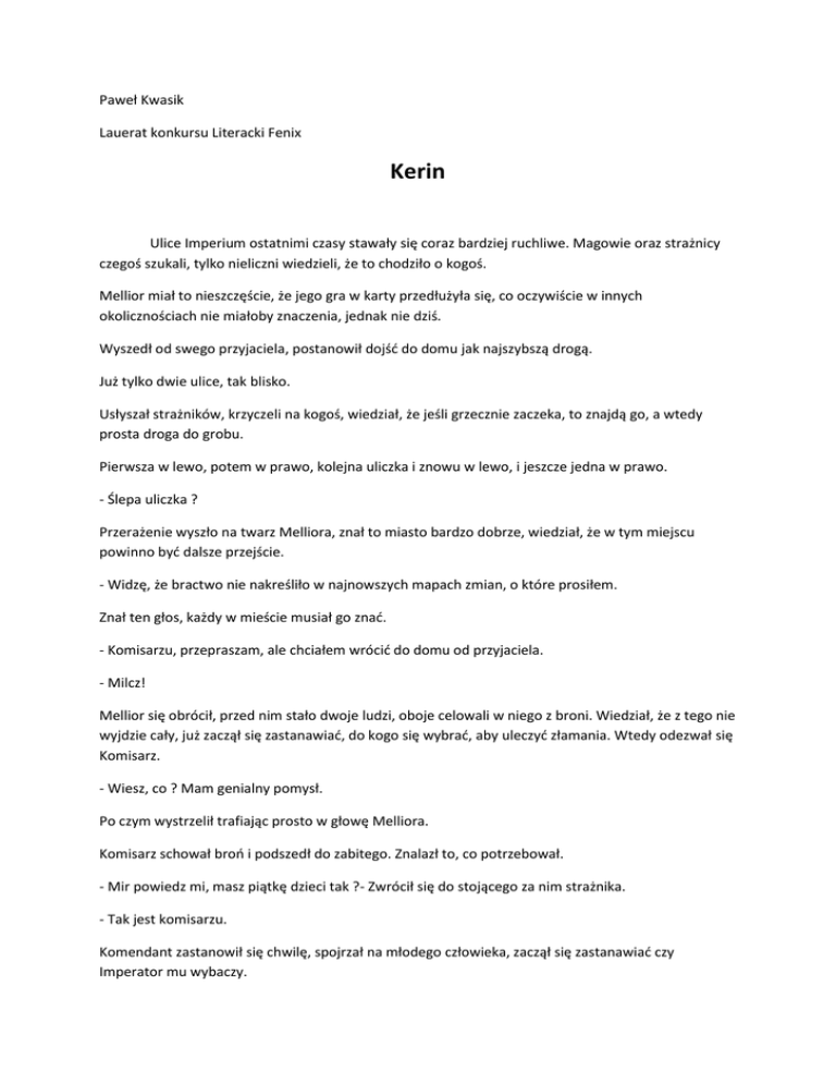 Paweł Kwasik Lauerat konkursu Literacki Fenix Kerin Ulice Imperium ostatnimi czasy stawały się coraz bardziej ruchliwe. Magowie oraz strażnicy czegoś szukali, tylko nieliczni wiedzieli, że to chodziło o kogoś. Mellior miał to nieszczęście, że jego gra w karty przedłużyła się, co oczywiście w innych okolicznościach nie miałoby znaczenia, jednak nie dziś. Wyszedł od swego przyjaciela, postanowił dojść do domu jak najszybszą drogą. Już tylko dwie ulice, tak blisko. Usłyszał strażników, krzyczeli na kogoś, wiedział, że jeśli grzecznie zaczeka, to znajdą go, a wtedy prosta droga do grobu. Pierwsza w lewo, potem w prawo, kolejna uliczka i znowu w lewo, i jeszcze jedna w prawo. - Ślepa uliczka ? Przerażenie wyszło na twarz Melliora, znał to miasto bardzo dobrze, wiedział, że w tym miejscu powinno być dalsze przejście. - Widzę, że bractwo nie nakreśliło w najnowszych mapach zmian, o które prosiłem. Znał ten głos, każdy w mieście musiał go znać. - Komisarzu, przepraszam, ale chciałem wrócić do domu od przyjaciela. - Milcz! Mellior się obrócił, przed nim stało dwoje ludzi, oboje celowali w niego z broni. Wiedział, że z tego nie wyjdzie cały, już zaczął się zastanawiać, do kogo się wybrać, aby uleczyć złamania. Wtedy odezwał się Komisarz. - Wiesz, co ? Mam genialny pomysł. Po czym wystrzelił trafiając prosto w głowę Melliora. Komisarz schował broń i podszedł do zabitego. Znalazł to, co potrzebował. - Mir powiedz mi, masz piątkę dzieci tak ?- Zwrócił się do stojącego za nim strażnika. - Tak jest komisarzu. Komendant zastanowił się chwilę, spojrzał na młodego człowieka, zaczął się zastanawiać czy Imperator mu wybaczy. - Powiedz mi Mirze, a czy chciałbyś awansować ? - Oczywiście komisarzu. - No to gratuluję awansu, od dzisiaj twój stopień to męczennik. Na twarzy Mira nie zdążyło się nawet pojawić zdziwienie. Komisarz szybko i idealnie wycelował, po czym wystrzelił w bezbronnego Mira. - Zaczynamy- powiedział sam do siebie, po czym ruszył na najbliższy posterunek. *** Kerin siedział w swoim pokoju. Wiedział, że ten dzień jest ostatnim w tym miejscu, a może i nawet mieście. Uśmiechał się do siebie i patrzył na drzwi. Z okna za jego plecami padały promienie wstającego słońca. Cały pokój powoli się rozjaśniał wyłaniając z cienia stosy książek i papierów. Kerin już wiedział, że na dole stoi Komisarz razem z dziesięcioma ludźmi. Wyciągnął z biurka dwie filiżanki i wrzucił do nich zioła z puszeczki. Zakrył je ręką i już po sekundzie było czuć zapach herbaty. Nastąpił huk, w drzwiach pojawiły się cztery dziury, jedna z filiżanek została trafiona i biurko zostało zalane herbatą. - Komisarzu, pańscy ludzie zniszczyli pańską ulubiona filiżankę! Po tych słowach przez drzwi weszło czterech ludzi z pistoletami w rękach i celowali w Kerina, na plecach mieli jeszcze dymiące się strzelby. Zaraz za nimi do pokoju wszedł Komisarz i wyciągnął z kieszeni papier. Zrobił to tak, aby można było zauważyć pistolet przy jego pasie. - Kerinie, przywódco Bractwa Nocri. Jesteś oskarżony o działalność przeciwko Imperium. Karą za to … - A liczyłem, że najpierw będzie mniej oficjalnie, nie napijesz się herbaty jak zawsze ?- I podał mu pozostała filiżankę. - To nie jest moja kontrola, zostałeś skazany i mam ciebie zabrać. - Wiem o tym. Ale naprawdę liczyłem, że napijemy się herbaty, to już będzie nasza ostatnia rozmowa. Na twarzy komisarza pojawiło się zdziwienie, jednak domyślał się już od początku tej akcji, że Bractwo wie o niej. - A więc pójdziesz po dobroci ? - A możesz mi tylko powiedzieć, na kiedy jest wyznaczona data egzekucji ? Komisarz podał Kerinowi kartkę, a ten zaczął ją szybko czytać. - A więc jeszcze dwa dni. Mam nadzieję, że napijesz się ze mną herbaty w areszcie. Po tych słowach wstał ze swojego krzesła i ruszył w kierunku drzwi. - Idziemy ? - Panie Az, proszę pana! Az zatrzymał się, nie znał tego głosu, a ostatnie wydarzenia wyostrzyły w nim, dlatego już trzymał rękę na pistolecie. Biegło za nim jakieś dziecko z listem w ręce, podeszło i bez zbędnych słów wręczyło przesyłkę, i uciekło. „A więc zaczęło się”- pomyślał sobie Az. List był adresowany oczywiście do niego. Informował on go o tym, że nastąpiła całkowita dekonspiracja Bractwa, a Kerin został pojmany i ma zostać stracony. Jednak to już było wiadome od kilku godzin. Wszyscy zostali postawieni w stan gotowości i tylko czekali na sygnał do ewakuacji z Imperii. Nareszcie dotarł na miejsce spotkania. Przeszedł na tył karczmy i założył maskę na twarz. Zapukał w drzwi i otworzył mu karczmarz. Poprowadził go do piwnicy, gdzie czekało na niego już pięciu innych ludzi tak samo ubranych jak on. Jeden okrągły stół, na nim wielka świeca dająca nienaturalnie dużo światła, a w koło stołu osiem siedzeń. Usiadł na wolnym miejscu i już chciał przemówić, kiedy podniósł rękę inny człowiek. - Witam wszystkich. Jak już wiemy Kerin został pojmany, przez co automatycznie rozpoczęła się procedura ewakuacji. Teraz naszym priorytetem będzie… - Mek możemy zdjąć maski ? Wiesz jak ich nienawidzę- był to człowiek siedzący naprzeciwko Meka. - Nie przerywaj mi ! I nie możemy zdjąć masek, jeśli wejdzie tu gwardia musimy dalej pozostać anonimowi. - Dlaczego rozpoczynasz spotkanie skoro nie ma jeszcze Zella ?- Był to głos kobiety siedzącej na prawo od Meka. - Zella nie będzie- Az wiedział, że ta odpowiedź nikogo nie usatysfakcjonuje, ale liczył, że nikt nie będzie go pytał o szczegóły. - Możecie przestać przerywać ? Wiem, że Zella nie będzie. Jakbym nie wiedział, to bym dalej czekał na jego przybycie. Możemy kontynuować normalnie ? Wszyscy kiwnęli głową na znak zgody. - Dobrze. Naszym priorytetem jest odbicie Kerina podczas egzekucji. 