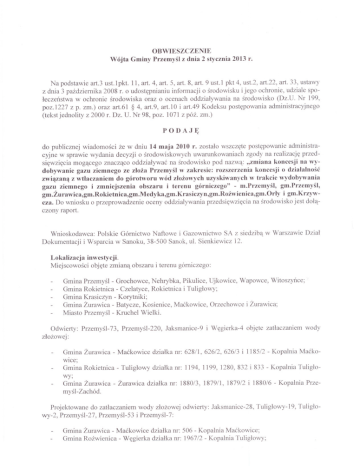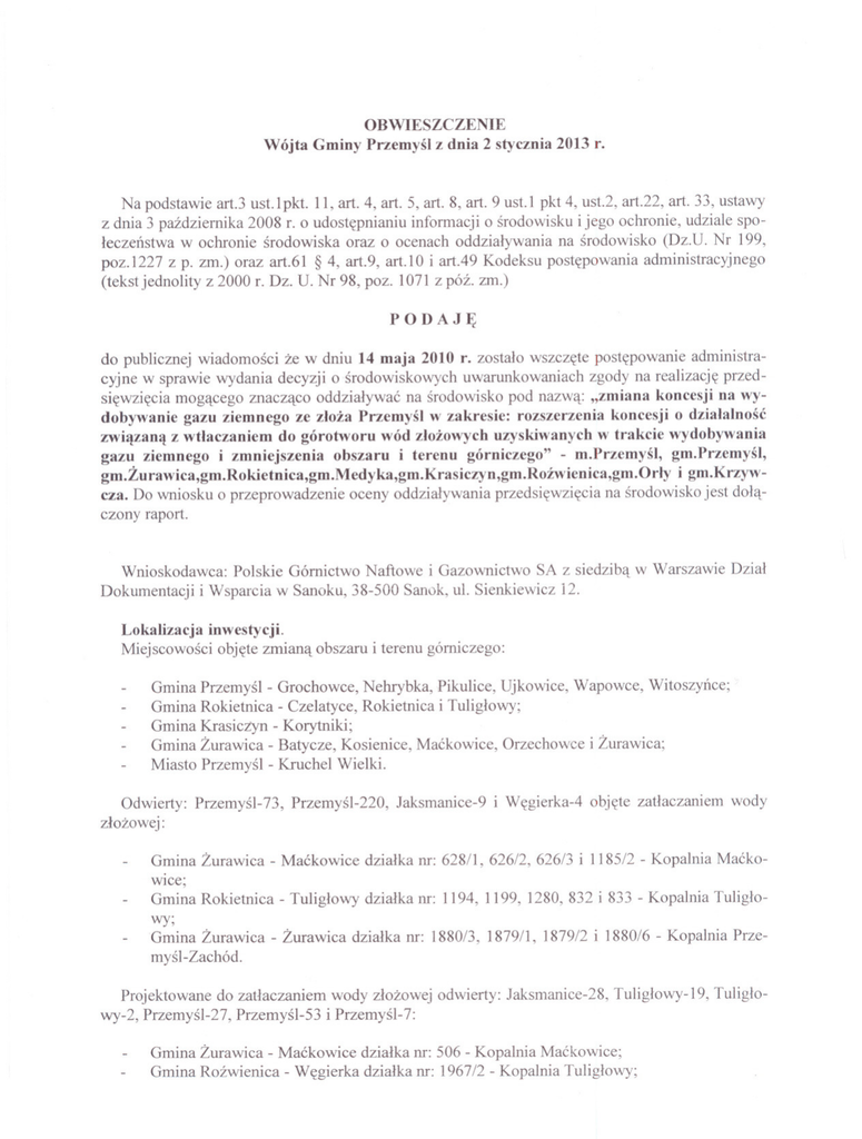 OBWIESZCZENIE Wójta Gminy Przemysl z dnia 2 stycznia 2013 r. Na podstawie art.3 ust. 1pkt. 11, art. 4, art. 5, art. 8, art. 9 ust. 1 pkt 4, us1.2, art.22, art. 33, ustawy z dnia 3 pazdziernika 2008 r. o udostepnianiu informacji o srodowisku i jego ochronie, udziale spoleczenstwa w ochronie srodowiska oraz o ocenach oddzialywania na srodowisko (Dz.U. Nr 199, poz. 1227 z p. zm.) oraz art.61 § 4, art.9, art.10 i art.49 Kodeksu postepowania administracyjnego (tekst jednolity z 2000 r. Dz. U. Nr 98, poz. 1071 z póz. zm.) PODAJE do publicznej wiadomosci ze w dniu 14 maja 2010 r. zostalo wszczete postepowanie administracyjne w sprawie wydania decyzji o srodowiskowych uwarunkowaniach zgody na realizacje przedsiewziecia mogacego znaczaco oddzialywac na srodowisko pod nazwa: "zmiana koncesji na wydobywanie gazu ziemnego ze zloza Przemysl w zakresie: rozszerzenia koncesji o dzialalnosc zwiazana z wtlaczaniem do górotworu wód zlozowych uzyskiwanych w trakcie wydobywania gazu ziemnego i zmniejszenia obszaru i terenu górniczego" - m.Przemysl, gm. Przemysl, gm.Zu rawica,gm.Ro kietnica,gm.Medy ka,gm.Krasiczyn,gm .Rozwienica,gm. O rly i gm. Krzywcza. Do wniosku o przeprowadzenie oceny oddzialywania przedsiewziecia na srodowisko jest dolaczony raport. Wnioskodawca: Dokumentacji Polskie Górnictwo Naftowe i Gazownictwo SA z siedziba w Warszawie i Wsparcia w Sanoku, 38-500 Sanok, ul. Sienkiewicz i2. Dzial Lokalizacja inwestycji. Miejscowosci objete zmiana obszaru i terenu górniczego: Gmina Gmina Gmina Gmina Miasto Odwierty: zlozowej: Przemysl Rokietnica Krasiczyn Zurawica Przemysl - Grochowce, Nehrybka, Pikulice, Ujkowice, Wapowce, Witoszynce; - Czelatyce, Rokietnica i Tuliglowy; - Korytniki; - Batycze, Kosienice, Mackowice, Orzechowce i Zurawica; - Kruche! Wielki. Przemysl-73, Gmina Zurawica Przemysl-220, - Mackowice laksmanice-9 i Wegierka-4 dzialka nr: 628/1, 626/2, 626/3 i objete zatlaczaniem 11 wody 85/2 - Kopalnia Macko- WIce; Gmina Rokietnica - Tuliglowy dzialka nr: 1194, 1199, 1280, 832 i 833 - Kopalnia Tuliglowy; Gmina Zurawica - Zurawica dzialka nr: 1880/3, 1879/1, 1879/2 i 1880/6 - Kopalnia Przemysl-Zachód. Projektowane do zatlaczaniem wody zlozowej odwierty: Jaksmanice-28, wy-2, Przemysl-27, Przemysl-53 i Przemysl-7: Tuliglowy-19, Gmina Zurawica - Mackowice dzialka nr: 506 - Kopalnia Mackowice; Gmina Rozwienica - Wegierka dzialka nr: 1967/2 - Kopalnia Tuliglowy; Tuliglo- Gmina Rokietnica - Tuliglowy dzialka nr: 1188 - Kopalnia Tuliglowy; Miasto Przemysl - obreb 202 dzialka nr: 9 - Kopalnia Przemysl-Zachód; Gmina Zurawica - Zurawica dzialka nr: 1880/2 i 1880/1 - Kopalnia Przemysl-Zachód. W zwiazku z powyzszym umozliwia sie stronom: zapoznanie sie ze wszystkimi zebranymi dokumentami, przegladniecie akt sprawy oraz zgloszenie ewentualnych zastrzezen i wniosków w ciagu 21 dni od daty ogloszenia. Calosc akt ww. sprawy znajduje sie Urzedzie Gminy Przemysl przy ul. Borelowskiego 1, 11pietro, pokój nr 2] O,w godzinach pracy tj. od 730 do 1530 od poniedzialku do piatku.