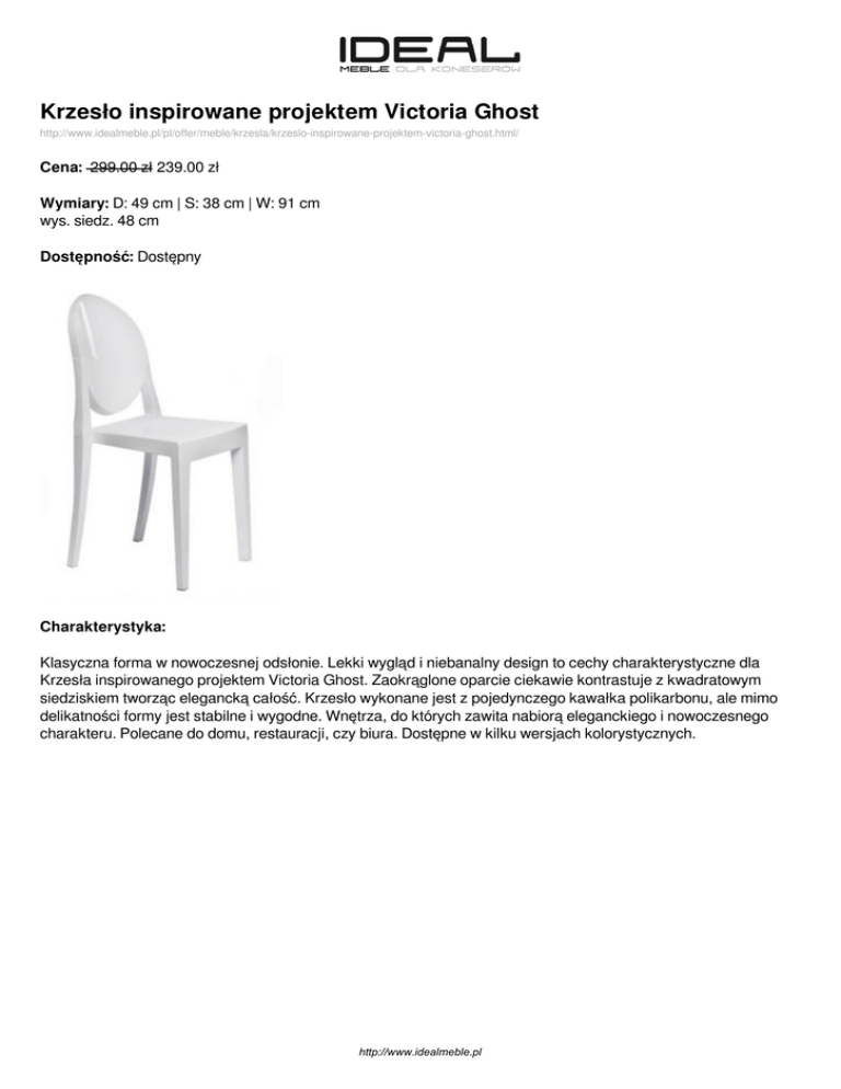 Krzesło inspirowane projektem Victoria Ghost http://www.idealmeble.pl/pl/offer/meble/krzesla/krzeslo-inspirowane-projektem-victoria-ghost.html/ Cena: 299.00 zł 239.00 zł Wymiary: D: 49 cm | S: 38 cm | W: 91 cm wys. siedz. 48 cm Dostępność: Dostępny Charakterystyka: Klasyczna forma w nowoczesnej odsłonie. Lekki wygląd i niebanalny design to cechy charakterystyczne dla Krzesła inspirowanego projektem Victoria Ghost. Zaokrąglone oparcie ciekawie kontrastuje z kwadratowym siedziskiem tworząc elegancką całość. Krzesło wykonane jest z pojedynczego kawałka polikarbonu, ale mimo delikatności formy jest stabilne i wygodne. Wnętrza, do których zawita nabiorą eleganckiego i nowoczesnego charakteru. Polecane do domu, restauracji, czy biura. Dostępne w kilku wersjach kolorystycznych. http://www.idealmeble.pl Dostępne wersje produktu: nazwa produktu Krzesło inspirowane projektem Victoria Ghost warianty kolor biały cena 299.00zł 239.00zł dostępne Dostępny Krzesło inspirowane projektem Victoria Ghost kolor czarny 299.00zł 239.00zł Dostępny Krzesło inspirowane projektem Victoria Ghost kolor czerwony transparentny 299.00zł 299.00zł Dostępny Krzesło inspirowane projektem Victoria Ghost kolor fioletowy transparentny 299.00zł 299.00zł Dostępny Krzesło inspirowane projektem Victoria Ghost kolor niebieski transparentny 299.00zł 299.00zł Na zamówienie Krzesło inspirowane projektem Victoria Ghost kolor różowy transparentny 299.00zł 299.00zł Dostępny Krzesło inspirowane projektem Victoria Ghost kolor szary transparentny 299.00zł 239.00zł Dostępny Krzesło inspirowane projektem Victoria Ghost kolor transparentny 299.00zł 239.00zł Dostępny http://www.idealmeble.pl Zdjęcia produktu: http://www.idealmeble.pl Powered by TCPDF (www.tcpdf.org)