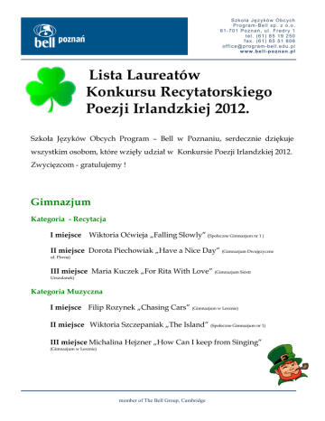 S zk o ł a J ę z yk ó w O b c yc h Program-Bell sp. z o.o. 6 1 - 7 0 1 P o zn a ń , u l . F r e d r y 1 tel. (61) 85 19 250 f a x. ( 6 1 ) 8 5 5 1 8 0 6 [email protected] www.bell-poznan.pl Lista Laureatów Konkursu Recytatorskiego Poezji Irlandzkiej 2012. Szkoła Języków Obcych Program – Bell w Poznaniu, serdecznie dziękuje wszystkim osobom, które wzięły udział w Konkursie Poezji Irlandzkiej 2012. Zwycięzcom - gratulujemy ! Gimnazjum Kategoria - Recytacja I miejsce Wiktoria Oćwieja „Falling Slowly” (Społeczne Gimnazjum nr 1 ) II miejsce Dorota Piechowiak „Have a Nice Day” (Gimnazjum Dwujęzyczne ul. Piwna) III miejsce Maria Kuczek „For Rita With Love” (Gimnazjum Sióstr Urszulanek) Kategoria Muzyczna I miejsce Filip Rozynek „Chasing Cars” (Gimnazjum w Lesznie) II miejsce Wiktoria Szczepaniak „The Island” (Społeczne Gimnazjum nr 1) III miejsce Michalina Hejzner „How Can I keep from Singing” (Gimnazjum w Lesznie) member of The Bell Group, Cambridge S zk o ł a J ę z yk ó w O b c yc h Program-Bell sp. z o.o. 6 1 - 7 0 1 P o zn a ń , u l . F r e d r y 1 tel. (61) 85 19 250 f a x. ( 6 1 ) 8 5 5 1 8 0 6 [email protected] www.bell-poznan.pl Liceum Kategoria - Recytacja I miejsce Zuzanna Saporznikow „A Prayer” (XX LO w Poznaniu) II miejsce Jakub Grabowski „An Elegy On The Death Of A Mad Dog” (Zespół Szkół Komunikacji) III miejsce Paula Rejkiewicz „Blackberry Picking” (III LO w Poznaniu) Kategoria Muzyczna I miejsce Patrycja Kleszcz, Jakub Unolt, Mikołaj Suchanek „Falling Slowly” (III LO w Poznaniu) II miejsce Hanna Rzeszut ‘When You Are Gone” (II LO w Poznaniu) III miejsce Paula Krauze „Mirror In February” (Poznańska Ogólnokształcącą Szkoła Muzyczna II stopnia) Nagrody niespodzianki Warsztaty teatralne ufundowane i prowadzone pod kierunkiem zawodowego aktora - Pana Andrzeja Szczytko Wiktoria Oćwieja, Dorota Piechowiak, Maria Kuczek, Zuzanna Saporznikow, Jakub Grabowski, Paula Rejkiewicz Publiczny występ w czasie obchodów Dnia Św. Patryka w Poznaniu Anna Szpaczyńska, Jakub Pięta, Krzysztof Niemer, Maria Krajewska, Remigiusz Dziechciaro, Maciej Cyranek, Maria Wawrzyniak, Klaudia Malesińska member of The Bell Group, Cambridge
