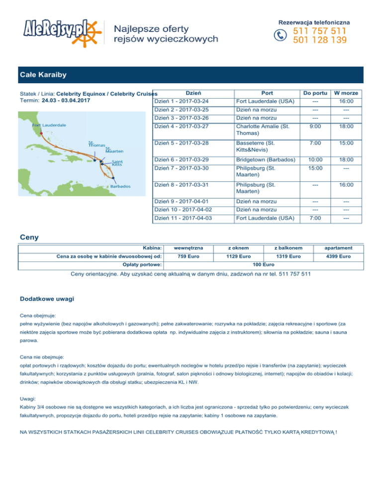 Całe Karaiby Dzień Statek / Linia: Celebrity Equinox / Celebrity Cruises Termin: 24.03 - 03.04.2017 Dzień 1 - 2017-03-24 Do portu W morze Fort Lauderdale (USA) Port --- 16:00 Dzień 2 - 2017-03-25 Dzień na morzu --- --- Dzień 3 - 2017-03-26 Dzień na morzu --- --- Dzień 4 - 2017-03-27 Charlotte Amalie (St. Thomas) 9:00 18:00 Dzień 5 - 2017-03-28 Basseterre (St. Kitts&Nevis) 7:00 15:00 Dzień 6 - 2017-03-29 Bridgetown (Barbados) 10:00 18:00 Dzień 7 - 2017-03-30 Philipsburg (St. Maarten) 15:00 --- Dzień 8 - 2017-03-31 Philipsburg (St. Maarten) --- 16:00 Dzień 9 - 2017-04-01 Dzień na morzu --- --- Dzień 10 - 2017-04-02 Dzień na morzu --- --- Dzień 11 - 2017-04-03 Fort Lauderdale (USA) 7:00 --- Ceny Kabina: Cena za osobę w kabinie dwuosobowej od: wewnętrzna z oknem z balkonem apartament 759 Euro 1129 Euro 1319 Euro 4399 Euro Opłaty portowe: 100 Euro Ceny orientacyjne. Aby uzyskać cenę aktualną w danym dniu, zadzwoń na nr tel. 511 757 511 Dodatkowe uwagi Cena obejmuje: pełne wyżywienie (bez napojów alkoholowych i gazowanych); pełne zakwaterowanie; rozrywka na pokładzie; zajęcia rekreacyjne i sportowe (za niektóre zajęcia sportowe może być pobierana dodatkowa opłata np. indywidualne zajęcia z instruktorem); siłownia na pokładzie; sauna i sauna parowa. Cena nie obejmuje: opłat portowych i rządowych; kosztów dojazdu do portu; ewentualnych noclegów w hotelu przed/po rejsie i transferów (na zapytanie); wycieczek fakultatywnych; korzystania z punktów usługowych (pralnia, fotograf, salon piękności i odnowy biologicznej, internet); napojów do obiadów i kolacji; drinków; napiwków obowiązkowych dla obsługi statku; ubezpieczenia KL i NW. Uwagi: Kabiny 3/4 osobowe nie są dostępne we wszystkich kategoriach, a ich liczba jest ograniczona - sprzedaż tylko po potwierdzeniu; ceny wycieczek fakultatywnych, propozycje dojazdu do portu, hoteli przed/po rejsie na zapytanie; kabiny 1 osobowe na zapytanie. NA WSZYSTKICH STATKACH PASAŻERSKICH LINII CELEBRITY CRUISES OBOWIĄZUJE PŁATNOŚĆ TYLKO KARTĄ KREDYTOWĄ ! Celebrity Equinox Celebrity Equinox***** Linia: CELEBRITY CRUISESTonaż: 122.000 tonDługość: 315 mSzerokość: 36 mSzybkość: 24 węzłówPokłady pasażerskie: 13Pasażerowie: 2.850Data wodowania: sierpień 2009 r.Basen: 4Waluta: USD Celebrity Equinox należy do klasy Solistce. Do dyspozycji gości: restauracje, kawiarnie, drink bary, winiarnia, salon odnowy biologicznej, sauna, fitness center, jacuzzi, trasa do joggingu, baseny, akupunktura, fryzjer, boisko do koszykówki, dyskoteka, kasyno, kino, trzypoziomowy teatr, dwupoziomowa biblioteka. Dla dzieci: pokój zabaw dla dzieci, pokój gier, dyskoteka, salon gier video. Dodatkowo: sklepy, centrum konferencyjne, punkt medyczny, kawiarenka internetowa, studio fotograficzne, ogród perski, obserwatorium.