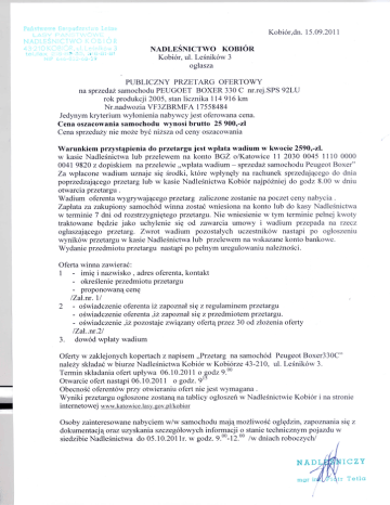 ,I!: f., Kobiór,dn. 15.09.2011 ~ l \ ~ 0',,- ) tel.'I,", ~ l'\ł c l ~ l ~~ v ,d Iv-':'9 ,"".3 u vl '1 NADLEŚNICTWO KOBIÓR Kobiór, ul. Leśników 3 ogłasza PUBLICZNY PRZETARG OFERTOWY na sprzedaż samochodu PEUGOET BOXER 330 C nr.rej.SPS 92LU rok produkcji 2005, stan licznika 114916 km Nr.nadwozia VF3ZBRMF A 17558484 Jedynym kryterium wyłonienia nabywcy jest oferowana cena. Cena oszacowania samochodu wynosi brutto 25900,-zł Cena sprzedaży nie może być niższa od ceny oszacowania Warunkiem przystąpienia do przetargu jest wpłata wadium w kwocie 2590,-zl. w kasie Nadleśnictwa lub przelewem na konto BGŻ o/Katowice 11 2030 0045 1110 0000 0041 9820 z dopiskiem na przelewie"wpłatawadium- sprzedaż samochodu Peugeot Boxer" Za wpłacone wadium uznaje się środki, które wpłynęły na rachunek sprzedającego do dnia poprzedzającego przetarg lub w kasie Nadleśnictwa Kobiór najpóźniej do godz 8.00 w dniu otwarcia przetargu. Wadium oferenta wygrywającego przetarg zaliczone zostanie na poczet ceny nabycia. Zapłata za zakupiony sam~chód winna zostać wniesiona na konto lub do kasy Nadleśnictwa w terminie 7 dni od rozstrzygniętego przetargu. Nie wniesienie w tym terminie pełnej kwoty traktowane będzie jako uchylenie się od zawarcia umowy i wadium przepada na rzecz ogłaszającego przetarg. Zwrot wadium pozostałych uczestników nastąpi po ogłoszeniu wyników przetargu w kasie Nadleśnictwa lub przelewem na wskazane konto bankowe. Wydanie przedmiotu przetargu nastąpi po pełnym uregulowaniu należności. Oferta winna zawierać: l - imię i nazwisko, adres oferenta, kontakt - określenie przedmiotu przetargu - proponowaną cenę /Zał.nr. 11 2 - oświadczenie oferenta iż zapoznał się z regulaminem przetargu 3. - I oświadczenie oferenta ,iż zapoznał się z przedmiotem przetargu. - oświadczenie ,iż pozostaje związany ofertą przez 30 od złożenia oferty /Zał..nr.2/ dowód wpłaty wadium Oferty w zaklejonych kopertach z napisem "Przetarg na samochód Peugeot Boxer330C" należy składać w biurze Nadleśnictwa Kobiór w Kobiórze 43-210, ul. Leśników 3. Termin składania ofert upływa 06.10.2011 o godz 9.00 Otwarcie ofert nastąpi 06.10.2011 o godz. 915 Obecność oferentów przy otwieraniu ofert nie jest wymagana. Wyniki przetargu ogłoszone zostaną na tablicy ogłoszeń w Nadleśnictwie Kobiór i na stronie internetowej www.katowice.lasy.gov.pllkobior Osoby zainteresowane nabyciem w/w samochodu mają możliwość oględzin, zapoznania się z dokumentacją oraz uzyskania szczegółowych informacji o stanie technicznym pojazdu w siedzibie Nadleśnictwa do 05.10.2011r. w godz. 9.00_12.00/w dniach roboczych! ICZY ,, II