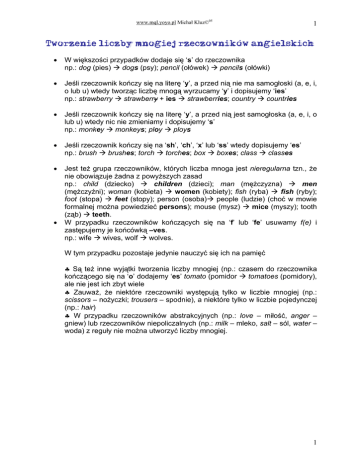 www.mql.yoyo.pl Michał Kluz©05 1 Tworzenie liczby mnogiej rzeczowników angielskich • W większości przypadków dodaje się ‘s’ do rzeczownika np.: dog (pies) Æ dogs (psy); pencil (ołówek) Æ pencils (ołówki) • Jeśli rzeczownik kończy się na literę ‘y’, a przed nią nie ma samogłoski (a, e, i, o lub u) wtedy tworząc liczbę mnogą wyrzucamy ‘y’ i dopisujemy ‘ies’ np.: strawberry Æ strawberry + ies Æ strawberries; country Æ countries • Jeśli rzeczownik kończy się na literę ‘y’, a przed nią jest samogłoska (a, e, i, o lub u) wtedy nic nie zmieniamy i dopisujemy ‘s’ np.: monkey Æ monkeys; ploy Æ ploys • Jeśli rzeczownik kończy się na ‘sh’, ‘ch’, ‘x’ lub ‘ss’ wtedy dopisujemy ‘es’ np.: brush Æ brushes; torch Æ torches; box Æ boxes; class Æ classes • Jest też grupa rzeczowników, których liczba mnoga jest nieregularna tzn., że nie obowiązuje żadna z powyższych zasad np.: child (dziecko) Æ children (dzieci); man (mężczyzna) Æ men (mężczyźni); woman (kobieta) Æ women (kobiety); fish (ryba) Æ fish (ryby); foot (stopa) Æ feet (stopy); person (osoba)Æ people (ludzie) (choć w mowie formalnej można powiedzieć persons); mouse (mysz) Æ mice (myszy); tooth (ząb) Æ teeth. W przypadku rzeczowników kończących się na ‘f’ lub ‘fe’ usuwamy f(e) i zastępujemy je końcówką –ves. np.: wife Æ wives, wolf Æ wolves. • W tym przypadku pozostaje jedynie nauczyć się ich na pamięć ♣ Są też inne wyjątki tworzenia liczby mnogiej (np.: czasem do rzeczownika kończącego się na ‘o’ dodajemy ‘es’ tomato (pomidor Æ tomatoes (pomidory), ale nie jest ich zbyt wiele ♣ Zauważ, że niektóre rzeczowniki występują tylko w liczbie mnogiej (np.: scissors – nożyczki; trousers – spodnie), a niektóre tylko w liczbie pojedynczej (np.: hair) ♣ W przypadku rzeczowników abstrakcyjnych (np.: love – miłość, anger – gniew) lub rzeczowników niepoliczalnych (np.: milk – mleko, salt – sól, water – woda) z reguły nie można utworzyć liczby mnogiej. 1 www.mql.yoyo.pl Michał Kluz©05 2 Exercise: Write the nouns in the plural. 1) raspberry …………………... 2) boy …………………... 3) story …………………... 4) pen …………………... 5) lolly …………………... 6) foot …………………... 7) boss …………………... 8) man …………………... 9) torch …………………... 10) monkey …………………... 11) inch …………………... 12) parrot …………………... 13) woman …………………... 14) bed …………………... 15) pinch …………………... 16) arm …………………... 17) pole …………………... 18) lunch …………………... 19) sash …………………... 20) snake …………………... 21) rush …………………... 22) bike …………………... 23) punch …………………... 24) elephant …………………... 25) flower …………………... 26) knife …………………... Fold here -------------------------------------------------------------------------- Answers: 1) raspberries; 2) boys; 3) stories; 4) pens; 5) lollies; 6) feet; 7) bosses; 8) men; 9) torches; 10) monkeys; 11) inches; 12) parrots; 13) women; 14) beds; 15) pinches; 16) arms; 17) poles; 18) lunches; 19) sashes; 20) snakes; 21) rushes; 22) bikes; 23) punches; 24) elephants; 25) flowers; 26) knives 2