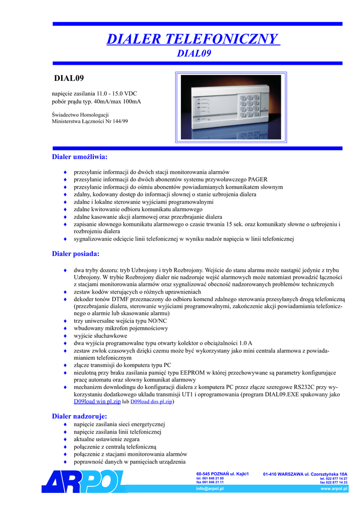 DIALER TELEFONICZNY DIAL09 DIAL09 napięcie zasilania 11.0 - 15.0 VDC pobór prądu typ. 40mA/max 100mA Świadectwo Homologacji Ministerstwa Łączności Nr 144/99 Dialer umożliwia: ♦ ♦ ♦ ♦ ♦ ♦ ♦ ♦ ♦ przesyłanie informacji do dwóch stacji monitorowania alarmów przesyłanie informacji do dwóch abonentów systemu przywoławczego PAGER przesyłanie informacji do ośmiu abonentów powiadamianych komunikatem słownym zdalny, kodowany dostęp do informacji słownej o stanie uzbrojenia dialera zdalne i lokalne sterowanie wyjściami programowalnymi zdalne kwitowanie odbioru komunikatu alarmowego zdalne kasowanie akcji alarmowej oraz przezbrajanie dialera zapisanie słownego komunikatu alarmowego o czasie trwania 15 sek. oraz komunikaty słowne o uzbrojeniu i rozbrojeniu dialera sygnalizowanie odcięcie linii telefonicznej w wyniku nadzór napięcia w linii telefonicznej Dialer posiada: ♦ ♦ ♦ ♦ ♦ ♦ ♦ ♦ ♦ ♦ ♦ dwa tryby dozoru: tryb Uzbrojony i tryb Rozbrojony. Wejście do stanu alarmu może nastąpić jedynie z trybu Uzbrojony. W trybie Rozbrojony dialer nie nadzoruje wejść alarmowych może natomiast prowadzić łączności z stacjami monitorowania alarmów oraz sygnalizować obecność nadzorowanych problemów technicznych zestaw kodów sterujących o różnych uprawnieniach dekoder tonów DTMF przeznaczony do odbioru komend zdalnego sterowania przesyłanych drogą telefoniczną (przezbrajanie dialera, sterowanie wyjściami programowalnymi, zakończenie akcji powiadamiania telefonicz nego o alarmie lub skasowanie alarmu) trzy uniwersalne wejścia typu NO/NC wbudowany mikrofon pojemnościowy wyjście słuchawkowe dwa wyjścia programowalne typu otwarty kolektor o obciążalności 1.0 A zestaw zwłok czasowych dzięki czemu może być wykorzystany jako mini centrala alarmowa z powiada mianiem telefonicznym złącze transmisji do komputera typu PC nieulotną przy braku zasilania pamięć typu EEPROM w której przechowywane są parametry konfigurujące pracę automatu oraz słowny komunikat alarmowy mechanizm downlodingu do konfiguracji dialera z komputera PC przez złącze szeregowe RS232C przy wy korzystaniu dodatkowego układu transmisji UT1 i oprogramowania (program DIAL09.EXE spakowany jako D09load win pl.zip lub D09load dos pl.zip) Dialer nadzoruje: ♦ ♦ ♦ ♦ ♦ ♦ napięcie zasilania sieci energetycznej napięcie zasilania linii telefonicznej aktualne ustawienie zegara połączenie z centralą telefoniczną połączenie z stacjami monitorowania alarmów poprawność danych w pamięciach urządzenia 60-545 POZNAŃ ul. Kajki1 tel. 061 846 21 00 fax 061 846 21 11 [email protected] 01-410 WARSZAWA ul. Czorsztyńska 10A tel. 022 877 14 27 fax 022 877 14 33 www.arpol.pl