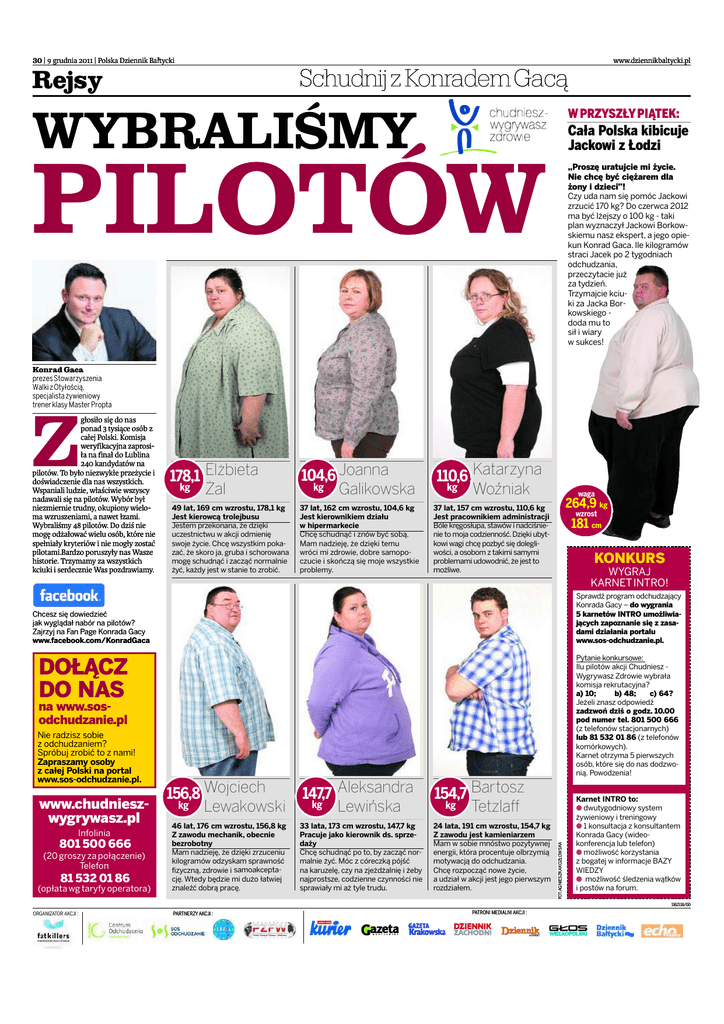 30 | 9 grudnia 2011 | Polska Dziennik Bałtycki Ba³tycki www.dziennikbaltycki.pl Schudnij z Konradem Gacą Rejsy WYBRALIŚMY W PRZYSZŁY PIĄTEK: PILOTÓW „Proszę uratujcie mi życie. Nie chcę być ciężarem dla żony i dzieci”! Czy uda nam się pomóc Jackowi zrzucić 170 kg? Do czerwca 2012 ma być lżejszy o 100 kg - taki plan wyznaczył Jackowi Borkowskiemu nasz ekspert, a jego opiekun Konrad Gaca. Ile kilogramów straci Jacek po 2 tygodniach odchudzania, przeczytacie już za tydzień. Trzymajcie kciuki za Jacka Borkowskiego doda mu to sił i wiary w sukces! Cała Polska kibicuje Jackowi z Łodzi Konrad Gaca prezes Stowarzyszenia Walki z Otyłością, specjalista żywieniowy trener klasy Master Propta Z głosiło się do nas ponad 3 tysiące osób z całej Polski. Komisja weryfikacyjna zaprosiła na finał do Lublina 240 kandydatów na pilotów. To było niezwykłe przeżycie i doświadczenie dla nas wszystkich. Wspaniali ludzie, właściwie wszyscy nadawali się na pilotów. Wybór był niezmiernie trudny, okupiony wieloma wzruszeniami, a nawet łzami. Wybraliśmy 48 pilotów. Do dziś nie mogę odżałować wielu osób, które nie spełniały kryteriów i nie mogły zostać pilotami.Bardzo poruszyły nas Wasze historie. Trzymamy za wszystkich kciuki i serdecznie Was pozdrawiamy. 178,1 Elżbieta kg Żal 104,6 Joanna kg Galikowska 49 lat, 169 cm wzrostu, 178,1 kg Jest kierowcą trolejbusu Jestem przekonana, że dzięki uczestnictwu w akcji odmienię swoje życie. Chcę wszystkim pokazać, że skoro ja, gruba i schorowana mogę schudnąć i zacząć normalnie żyć, każdy jest w stanie to zrobić. 37 lat, 162 cm wzrostu, 104,6 kg Jest kierownikiem działu w hipermarkecie Chcę schudnąć i znów być sobą. Mam nadzieję, że dzięki temu wróci mi zdrowie, dobre samopoczucie i skończą się moje wszystkie problemy. 110,6 Katarzyna kg Woźniak waga 264,9 kg 37 lat, 157 cm wzrostu, 110,6 kg Jest pracownikiem administracji Bóle kręgosłupa, stawów i nadciśnienie to moja codzienność. Dzięki ubytkowi wagi chcę pozbyć się dolegliwości, a osobom z takimi samymi problemami udowodnić, że jest to możliwe. wzrost 181 cm KONKURS WYGRAJ KARNET INTRO! Sprawdź program odchudzający Konrada Gacy – do wygrania 5 karnetów INTRO umożliwiających zapoznanie się z zasadami działania portalu www.sos-odchudzanie.pl. Chcesz się dowiedzieć jak wyglądał nabór na pilotów? Zajrzyj na Fan Page Konrada Gacy www.facebook.com/KonradGaca Pytanie konkursowe: Ilu pilotów akcji Chudniesz Wygrywasz Zdrowie wybrała komisja rekrutacyjna? a) 10; b) 48; c) 64? Jeżeli znasz odpowiedź zadzwoń dziś o godz. 10.00 pod numer tel. 801 500 666 (z telefonów stacjonarnych) lub 81 532 01 86 (z telefonów komórkowych). Karnet otrzyma 5 pierwszych osób, które się do nas dodzwonią. Powodzenia! DOŁĄCZ DO NAS na www.sosodchudzanie.pl www.chudnieszwygrywasz.pl Infolinia 801 500 666 (20 groszy za połączenie) Telefon 81 532 01 86 (opłata wg taryfy operatora) 156,8 Wojciech kg Lewakowski 46 lat, 176 cm wzrostu, 156,8 kg Z zawodu mechanik, obecnie bezrobotny Mam nadzieję, że dzięki zrzuceniu kilogramów odzyskam sprawność fizyczną, zdrowie i samoakceptację. Wtedy będzie mi dużo łatwiej znaleźć dobrą pracę. 147,7 Aleksandra kg Lewińska 33 lata, 173 cm wzrostu, 147,7 kg Pracuje jako kierownik ds. sprzedaży Chcę schudnąć po to, by zacząć normalnie żyć. Móc z córeczką pójść na karuzelę, czy na zjeżdżalnię i żeby najprostsze, codzienne czynności nie sprawiały mi aż tyle trudu. 154,7 Bartosz kg Tetzlaff 24 lata, 191 cm wzrostu, 154,7 kg Z zawodu jest kamieniarzem Mam w sobie mnóstwo pozytywnej energii, która procentuje olbrzymią motywacją do odchudzania. Chcę rozpocząć nowe życie, a udział w akcji jest jego pierwszym rozdziałem. FOT.AGNIESZKA KOZŁOWSKA Nie radzisz sobie z odchudzaniem? Spróbuj zrobić to z nami! Zapraszamy osoby z całej Polski na portal www.sos-odchudzanie.pl. Karnet INTRO to: a dwutygodniowy system żywieniowy i treningowy a 1 konsultacja z konsultantem Konrada Gacy (wideokonferencja lub telefon) a możliwość korzystania z bogatej w informacje BAZY WIEDZY a możliwość śledzenia wątków i postów na forum. 1162118/00 ORGANIZATOR AKCJI : PARTNERZY AKCJI : PATRONI MEDIALNI AKCJI :