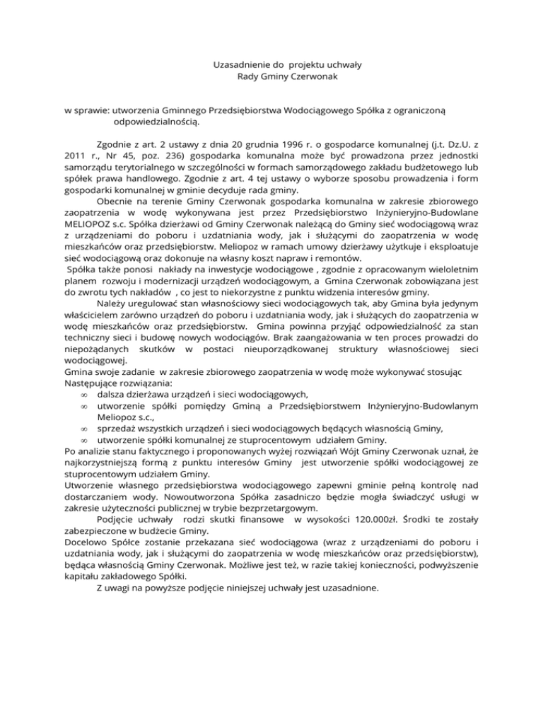 Uzasadnienie do projektu uchwały Rady Gminy Czerwonak w sprawie: utworzenia Gminnego Przedsiębiorstwa Wodociągowego Spółka z ograniczoną odpowiedzialnością. Zgodnie z art. 2 ustawy z dnia 20 grudnia 1996 r. o gospodarce komunalnej (j.t. Dz.U. z 2011 r., Nr 45, poz. 236) gospodarka komunalna może być prowadzona przez jednostki samorządu terytorialnego w szczególności w formach samorządowego zakładu budżetowego lub spółek prawa handlowego. Zgodnie z art. 4 tej ustawy o wyborze sposobu prowadzenia i form gospodarki komunalnej w gminie decyduje rada gminy. Obecnie na terenie Gminy Czerwonak gospodarka komunalna w zakresie zbiorowego zaopatrzenia w wodę wykonywana jest przez Przedsiębiorstwo Inżynieryjno-Budowlane MELIOPOZ s.c. Spółka dzierżawi od Gminy Czerwonak należącą do Gminy sieć wodociągową wraz z urządzeniami do poboru i uzdatniania wody, jak i służącymi do zaopatrzenia w wodę mieszkańców oraz przedsiębiorstw. Meliopoz w ramach umowy dzierżawy użytkuje i eksploatuje sieć wodociągową oraz dokonuje na własny koszt napraw i remontów. Spółka także ponosi nakłady na inwestycje wodociągowe , zgodnie z opracowanym wieloletnim planem rozwoju i modernizacji urządzeń wodociągowym, a Gmina Czerwonak zobowiązana jest do zwrotu tych nakładów , co jest to niekorzystne z punktu widzenia interesów gminy. Należy uregulować stan własnościowy sieci wodociągowych tak, aby Gmina była jedynym właścicielem zarówno urządzeń do poboru i uzdatniania wody, jak i służących do zaopatrzenia w wodę mieszkańców oraz przedsiębiorstw. Gmina powinna przyjąć odpowiedzialność za stan techniczny sieci i budowę nowych wodociągów. Brak zaangażowania w ten proces prowadzi do niepożądanych skutków w postaci nieuporządkowanej struktury własnościowej sieci wodociągowej. Gmina swoje zadanie w zakresie zbiorowego zaopatrzenia w wodę może wykonywać stosując Następujące rozwiązania: • dalsza dzierżawa urządzeń i sieci wodociągowych, • utworzenie spółki pomiędzy Gminą a Przedsiębiorstwem Inżynieryjno-Budowlanym Meliopoz s.c., • sprzedaż wszystkich urządzeń i sieci wodociągowych będących własnością Gminy, • utworzenie spółki komunalnej ze stuprocentowym udziałem Gminy. Po analizie stanu faktycznego i proponowanych wyżej rozwiązań Wójt Gminy Czerwonak uznał, że najkorzystniejszą formą z punktu interesów Gminy jest utworzenie spółki wodociągowej ze stuprocentowym udziałem Gminy. Utworzenie własnego przedsiębiorstwa wodociągowego zapewni gminie pełną kontrolę nad dostarczaniem wody. Nowoutworzona Spółka zasadniczo będzie mogła świadczyć usługi w zakresie użyteczności publicznej w trybie bezprzetargowym. Podjęcie uchwały rodzi skutki finansowe w wysokości 120.000zł. Środki te zostały zabezpieczone w budżecie Gminy. Docelowo Spółce zostanie przekazana sieć wodociągowa (wraz z urządzeniami do poboru i uzdatniania wody, jak i służącymi do zaopatrzenia w wodę mieszkańców oraz przedsiębiorstw), będąca własnością Gminy Czerwonak. Możliwe jest też, w razie takiej konieczności, podwyższenie kapitału zakładowego Spółki. Z uwagi na powyższe podjęcie niniejszej uchwały jest uzasadnione.