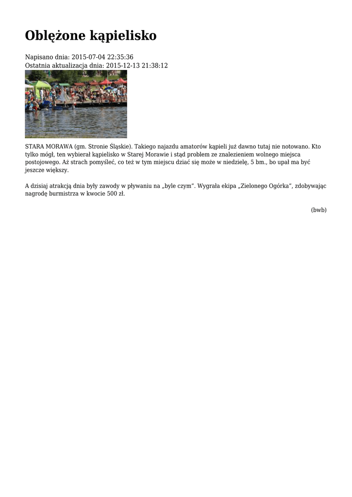 Oblężone kąpielisko Napisano dnia: 2015-07-04 22:35:36 Ostatnia aktualizacja dnia: 2015-12-13 21:38:12 STARA MORAWA (gm. Stronie Śląskie). Takiego najazdu amatorów kąpieli już dawno tutaj nie notowano. Kto tylko mógł, ten wybierał kąpielisko w Starej Morawie i stąd problem ze znalezieniem wolnego miejsca postojowego. Aż strach pomyśleć, co też w tym miejscu dziać się może w niedzielę, 5 bm., bo upał ma być jeszcze większy. A dzisiaj atrakcją dnia były zawody w pływaniu na „byle czym”. Wygrała ekipa „Zielonego Ogórka”, zdobywając nagrodę burmistrza w kwocie 500 zł. (bwb)