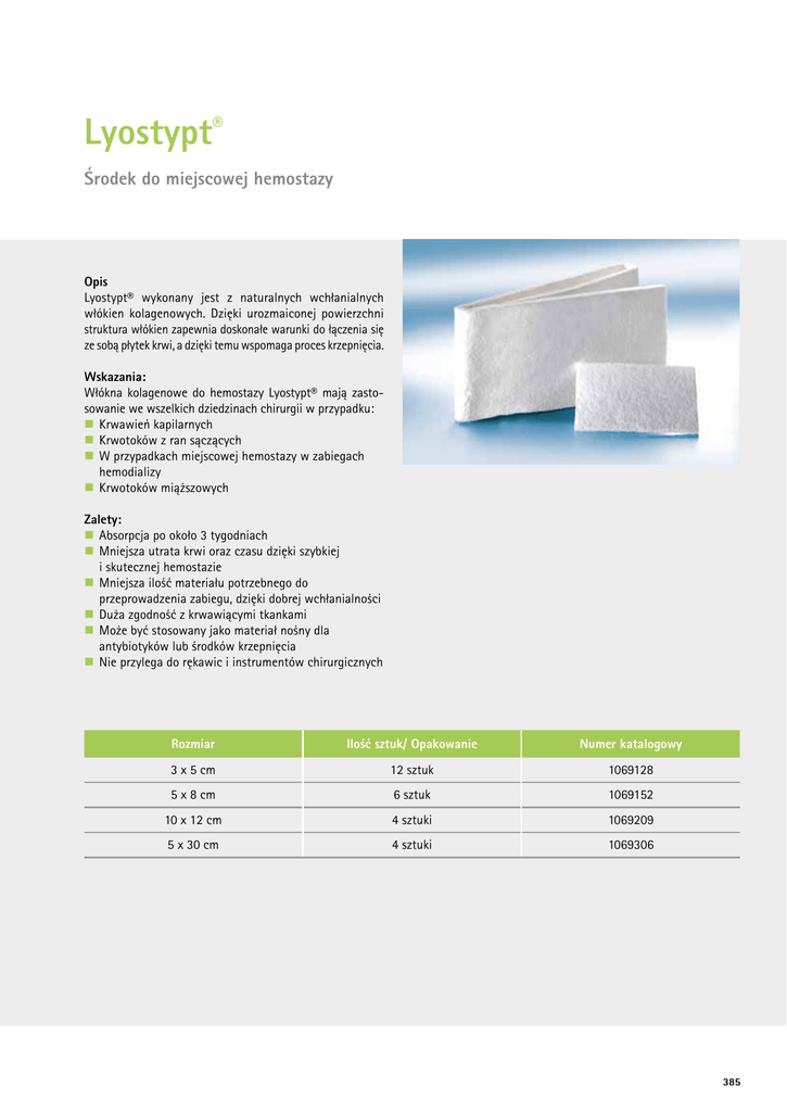 Lyostypt® Środek do miejscowej hemostazy Opis Lyostypt® wykonany jest z naturalnych wchłanialnych włókien kolagenowych. Dzięki urozmaiconej powierzchni struktura włókien zapewnia doskonałe warunki do łączenia się ze sobą płytek krwi, a dzięki temu wspomaga proces krzepnięcia. Wskazania: Włókna kolagenowe do hemostazy Lyostypt® mają zastosowanie we wszelkich dziedzinach chirurgii w przypadku: Krwawień kapilarnych Krwotoków z ran sączących W przypadkach miejscowej hemostazy w zabiegach hemodializy Krwotoków miąższowych Zalety: Absorpcja po około 3 tygodniach Mniejsza utrata krwi oraz czasu dzięki szybkiej i skutecznej hemostazie Mniejsza ilość materiału potrzebnego do przeprowadzenia zabiegu, dzięki dobrej wchłanialności Duża zgodność z krwawiącymi tkankami Może być stosowany jako materiał nośny dla antybiotyków lub środków krzepnięcia Nie przylega do rękawic i instrumentów chirurgicznych Rozmiar Ilość sztuk/ Opakowanie Numer katalogowy 3 x 5 cm 12 sztuk 1069128 5 x 8 cm 6 sztuk 1069152 10 x 12 cm 4 sztuki 1069209 5 x 30 cm 4 sztuki 1069306 385
